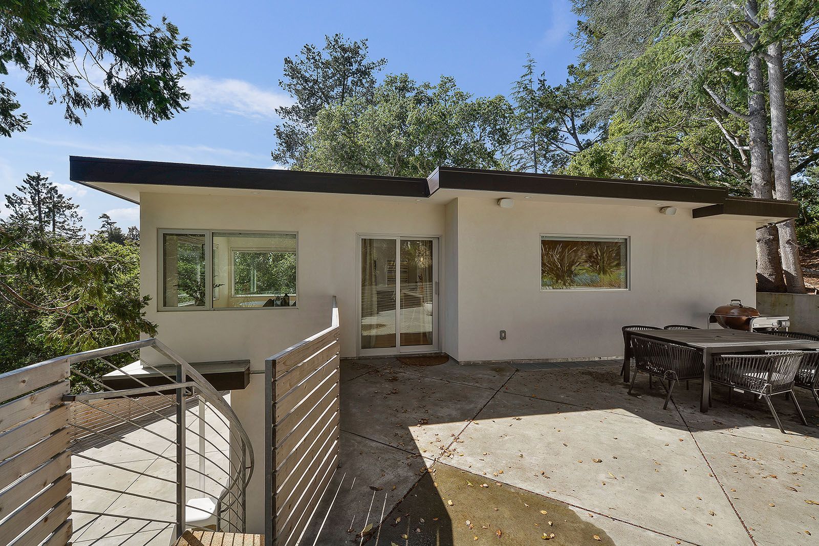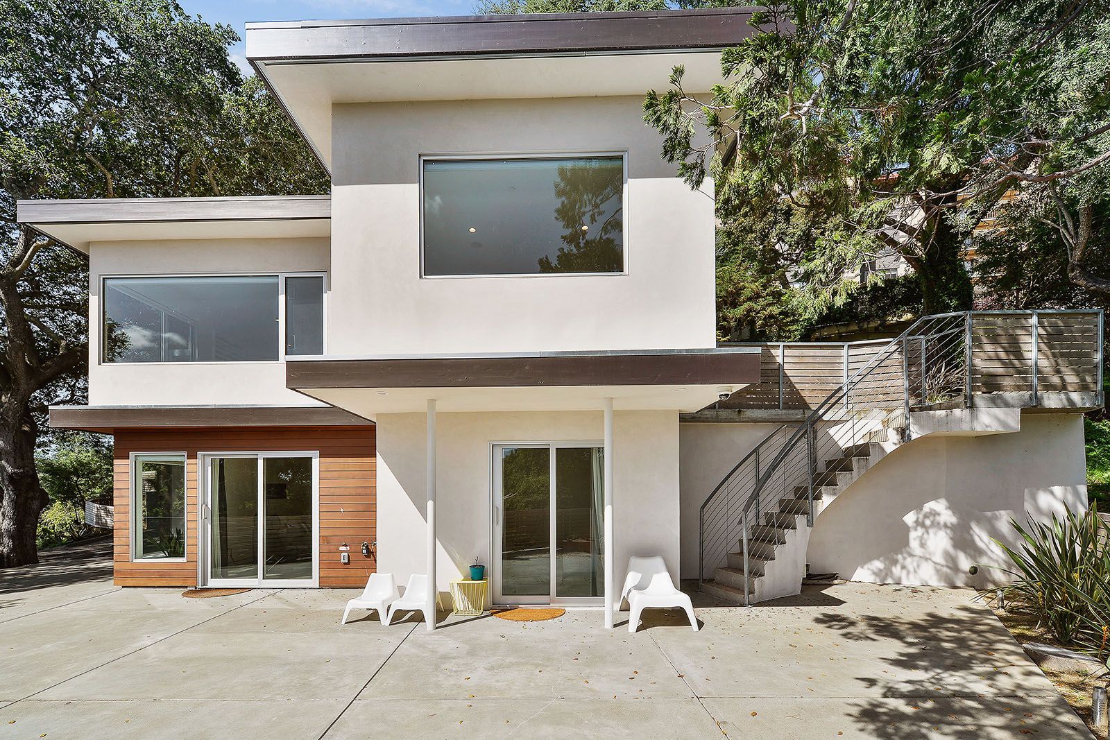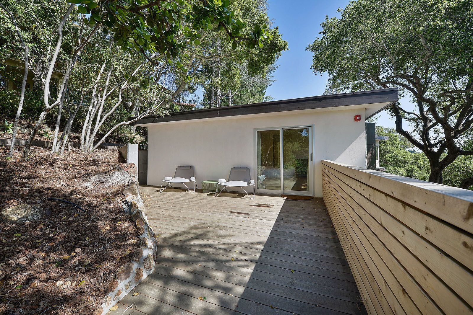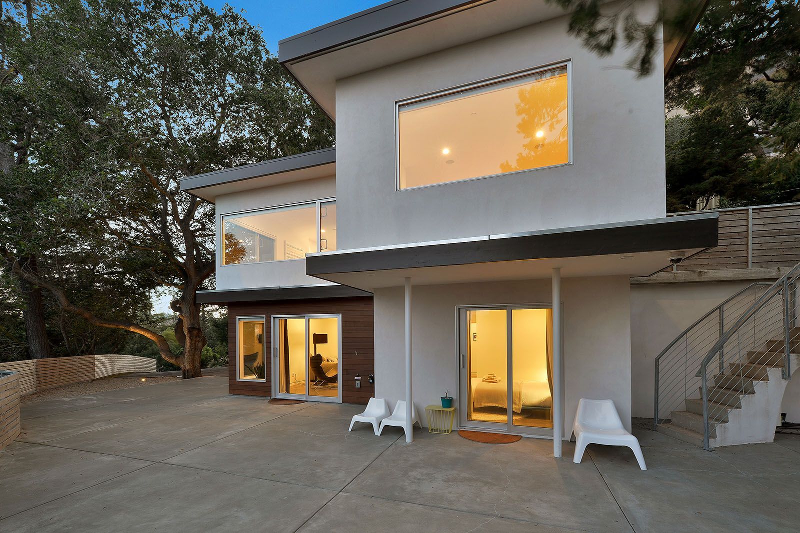 Redesigned with a midcentury modern design, this home boasts a wholly contemporary feel. Surrounded by serene hills, this home provides both city and woodland views, with terraced gardens and landscaped patios offering ample outdoor enjoyment. Its linear facade is striking, graced with glass, stucco, and wood. Inside, the upper level features an open great room with natural light from skylights and oversized windows.