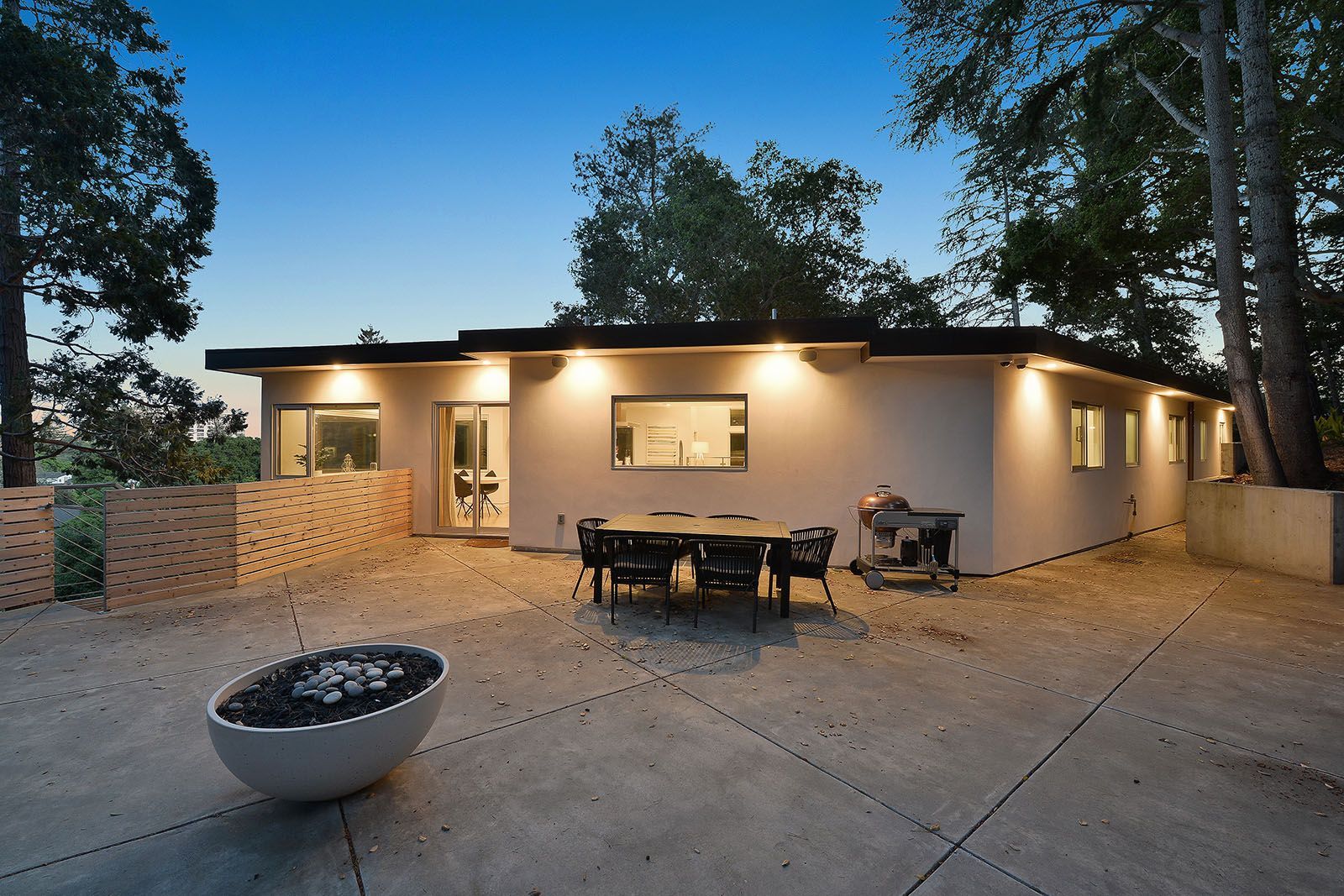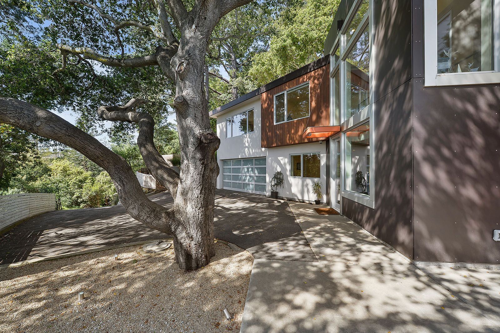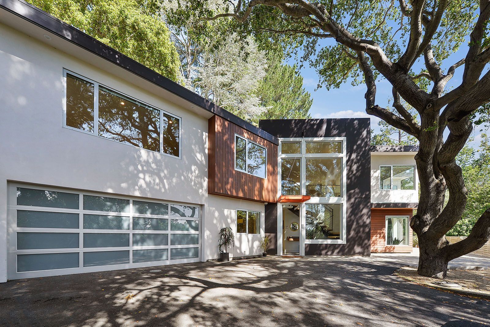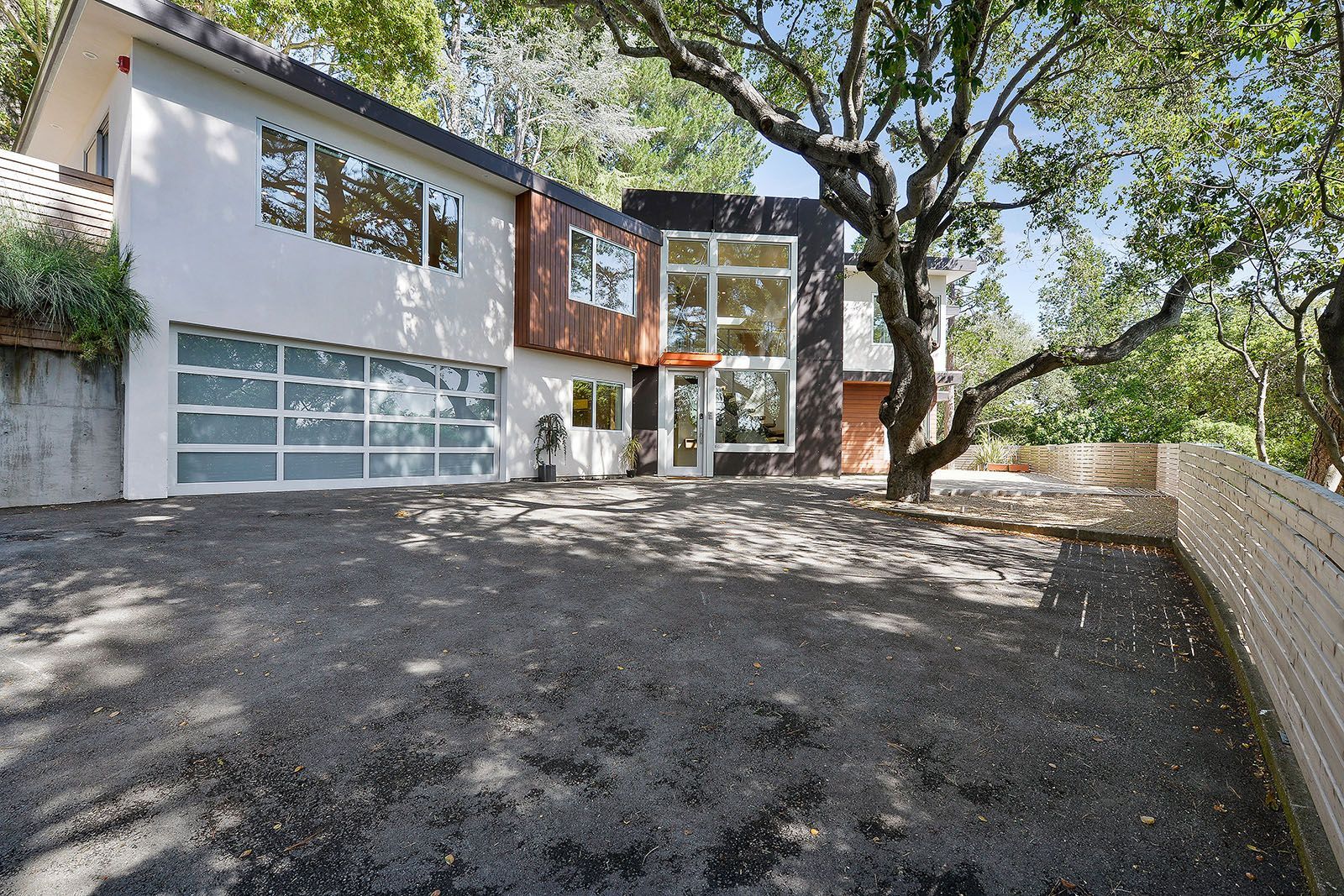 Redesigned with a midcentury modern design, this home boasts a wholly contemporary feel. Surrounded by serene hills, this home provides both city and woodland views, with terraced gardens and landscaped patios offering ample outdoor enjoyment. Its linear facade is striking, graced with glass, stucco, and wood. Inside, the upper level features an open great room with natural light from skylights and oversized windows.