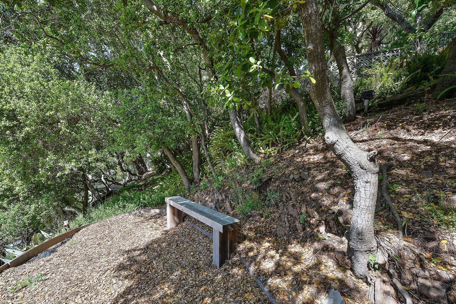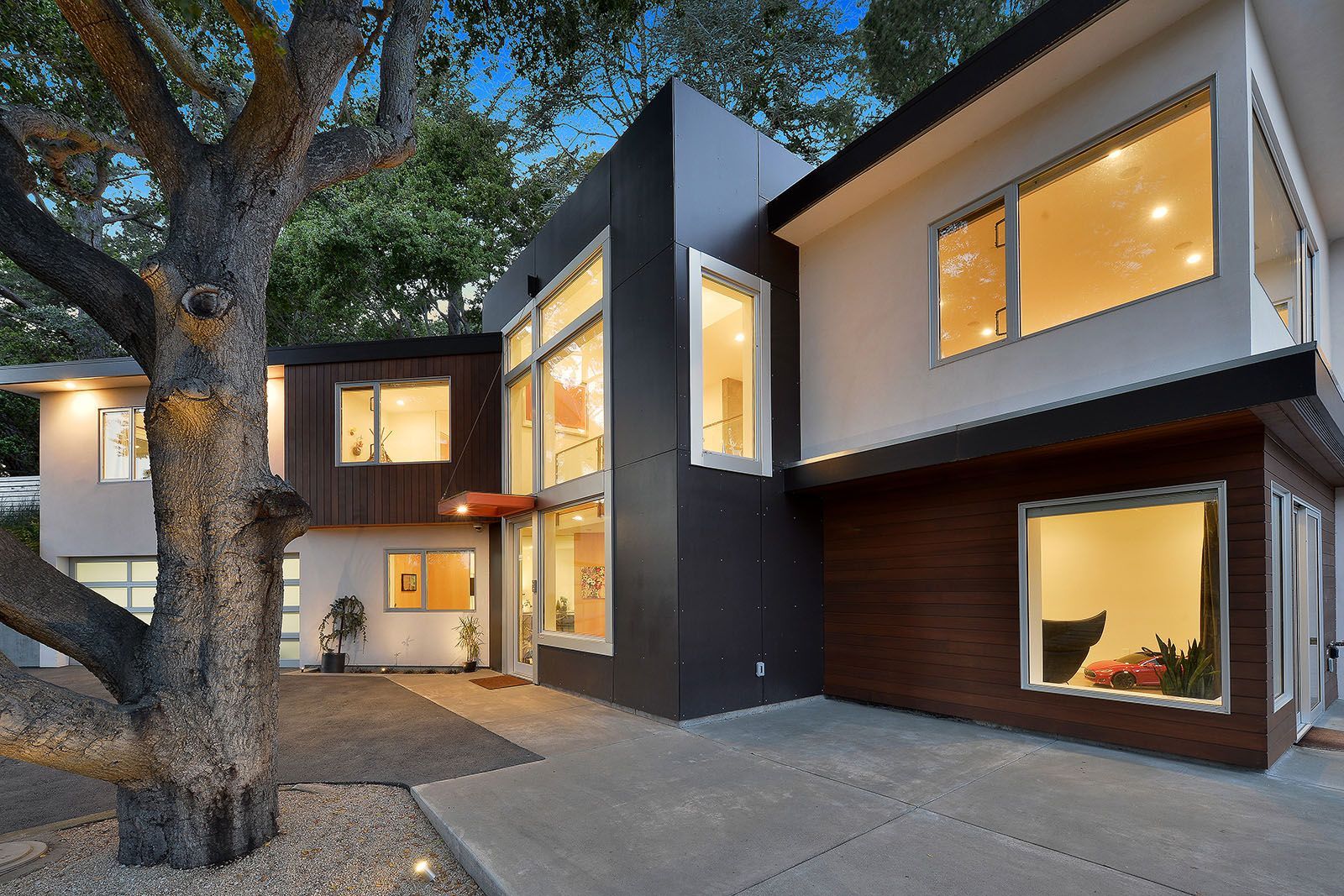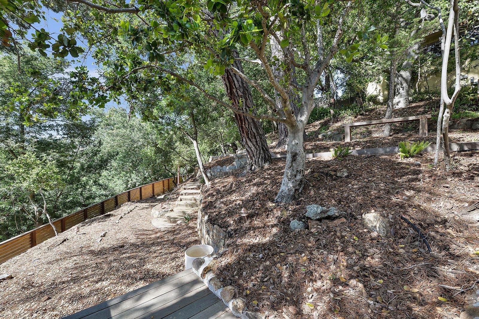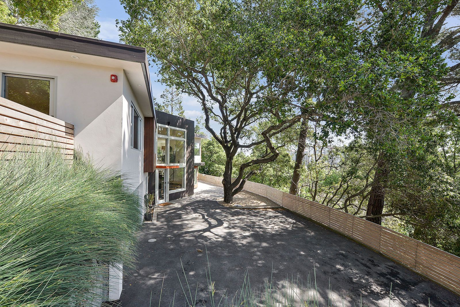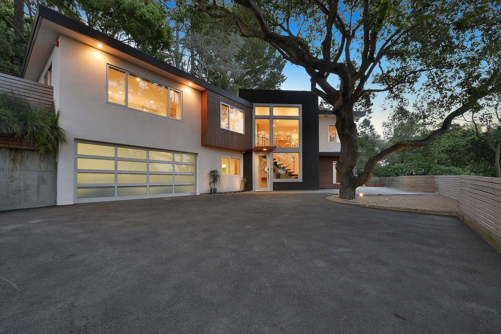 Redesigned with a midcentury modern design, this home boasts a wholly contemporary feel. Surrounded by serene hills, this home provides both city and woodland views, with terraced gardens and landscaped patios offering ample outdoor enjoyment. Its linear facade is striking, graced with glass, stucco, and wood. Inside, the upper level features an open great room with natural light from skylights and oversized windows.