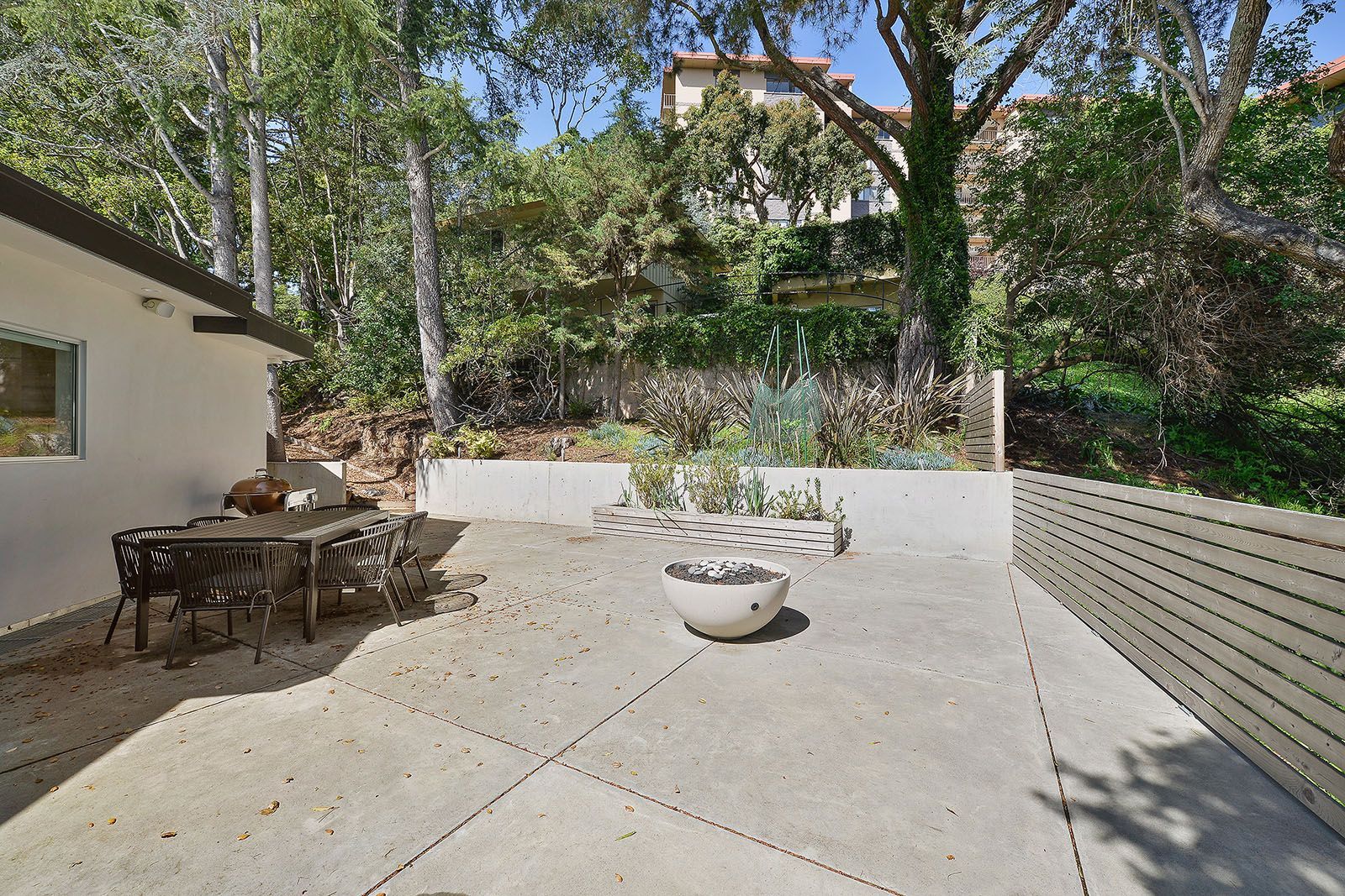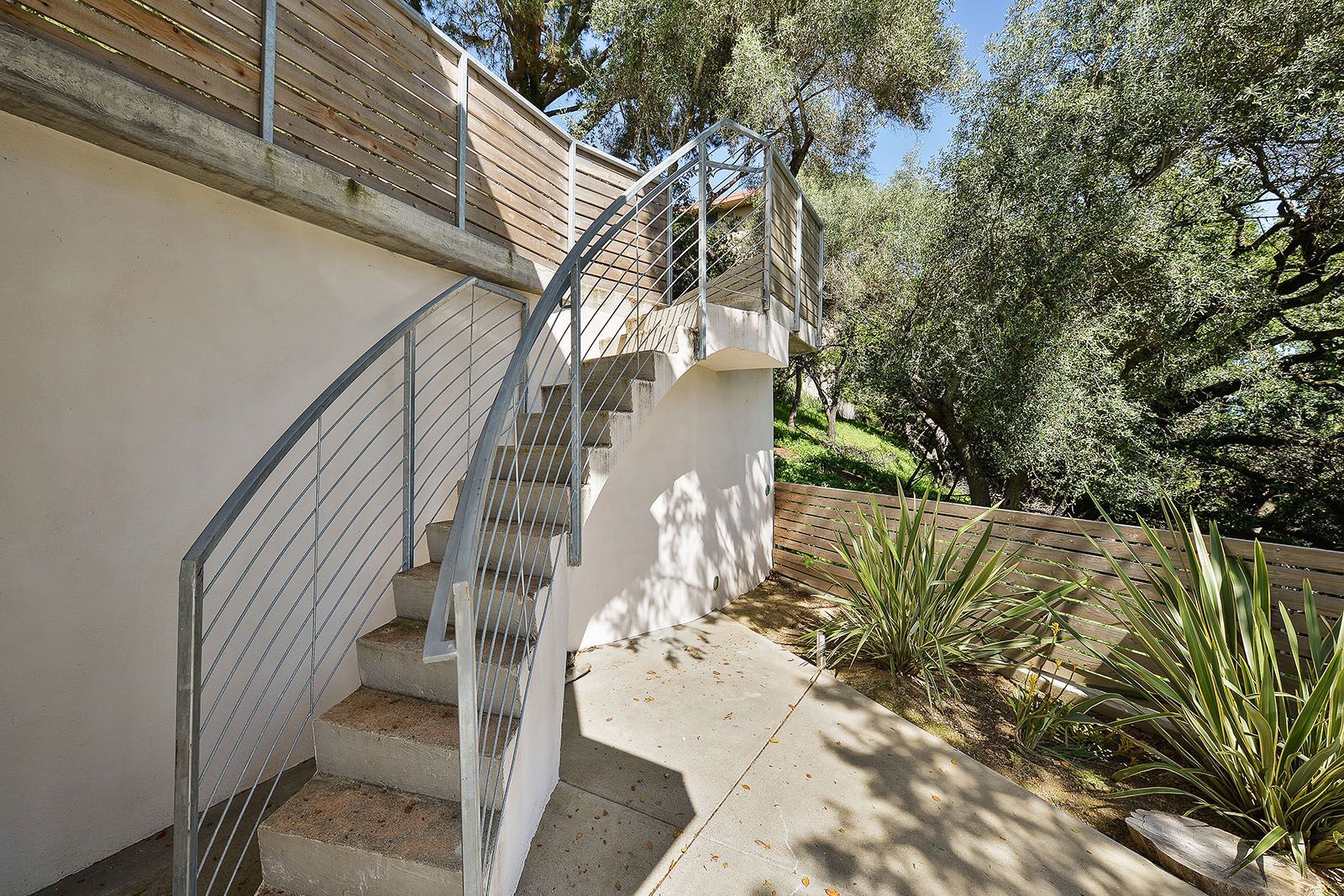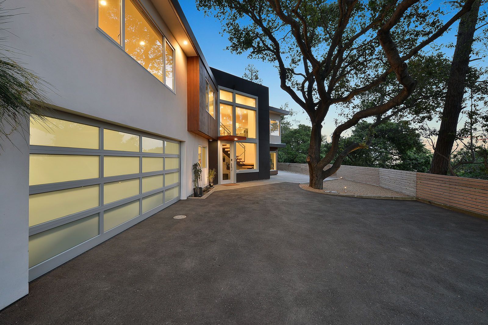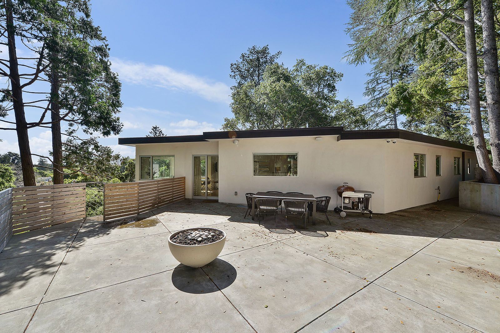 Redesigned with a midcentury modern design, this home boasts a wholly contemporary feel. Surrounded by serene hills, this home provides both city and woodland views, with terraced gardens and landscaped patios offering ample outdoor enjoyment. Its linear facade is striking, graced with glass, stucco, and wood. Inside, the upper level features an open great room with natural light from skylights and oversized windows.