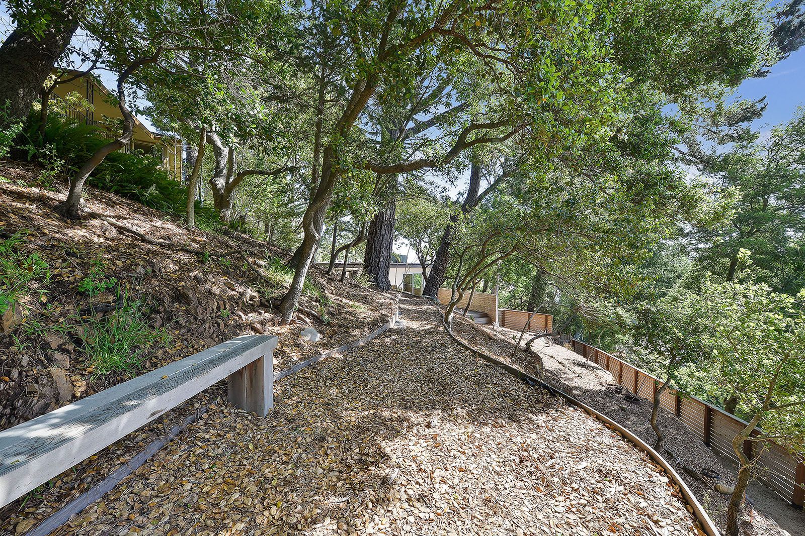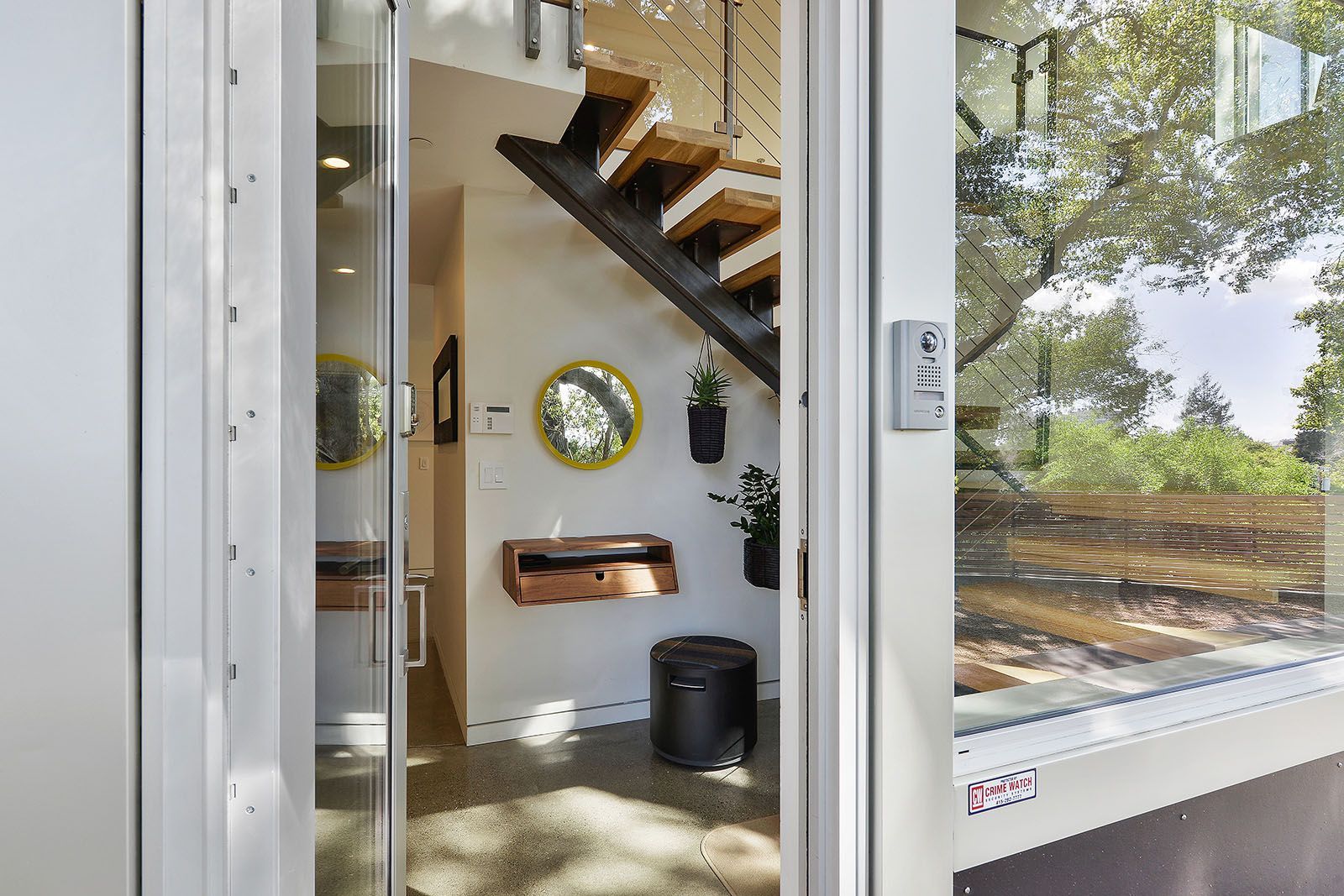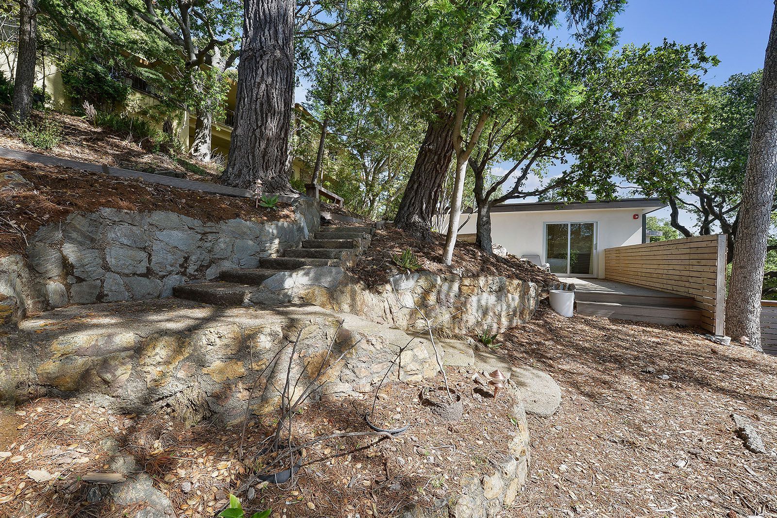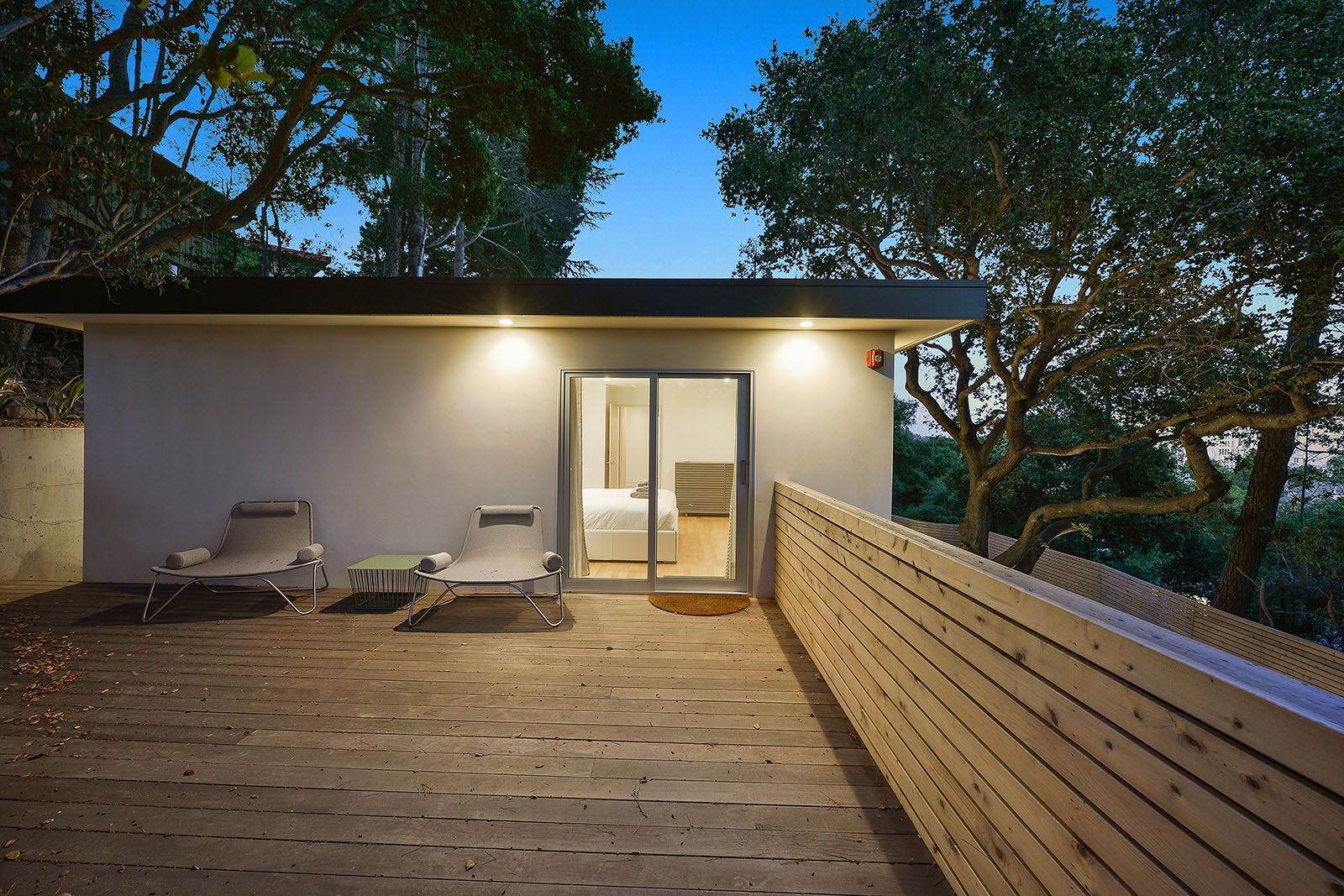 Redesigned with a midcentury modern design, this home boasts a wholly contemporary feel. Surrounded by serene hills, this home provides both city and woodland views, with terraced gardens and landscaped patios offering ample outdoor enjoyment. Its linear facade is striking, graced with glass, stucco, and wood. Inside, the upper level features an open great room with natural light from skylights and oversized windows.