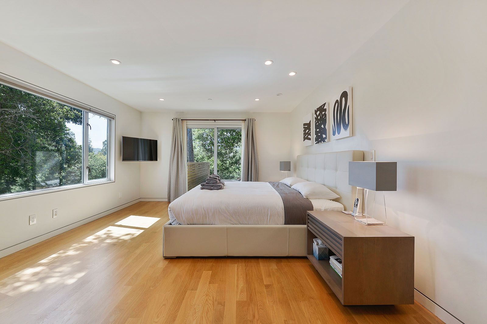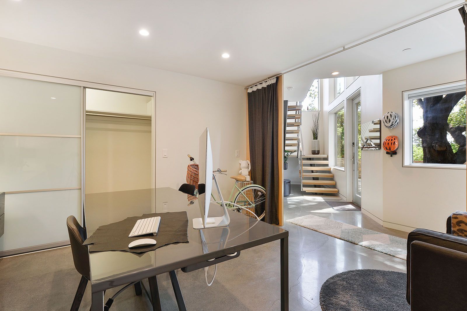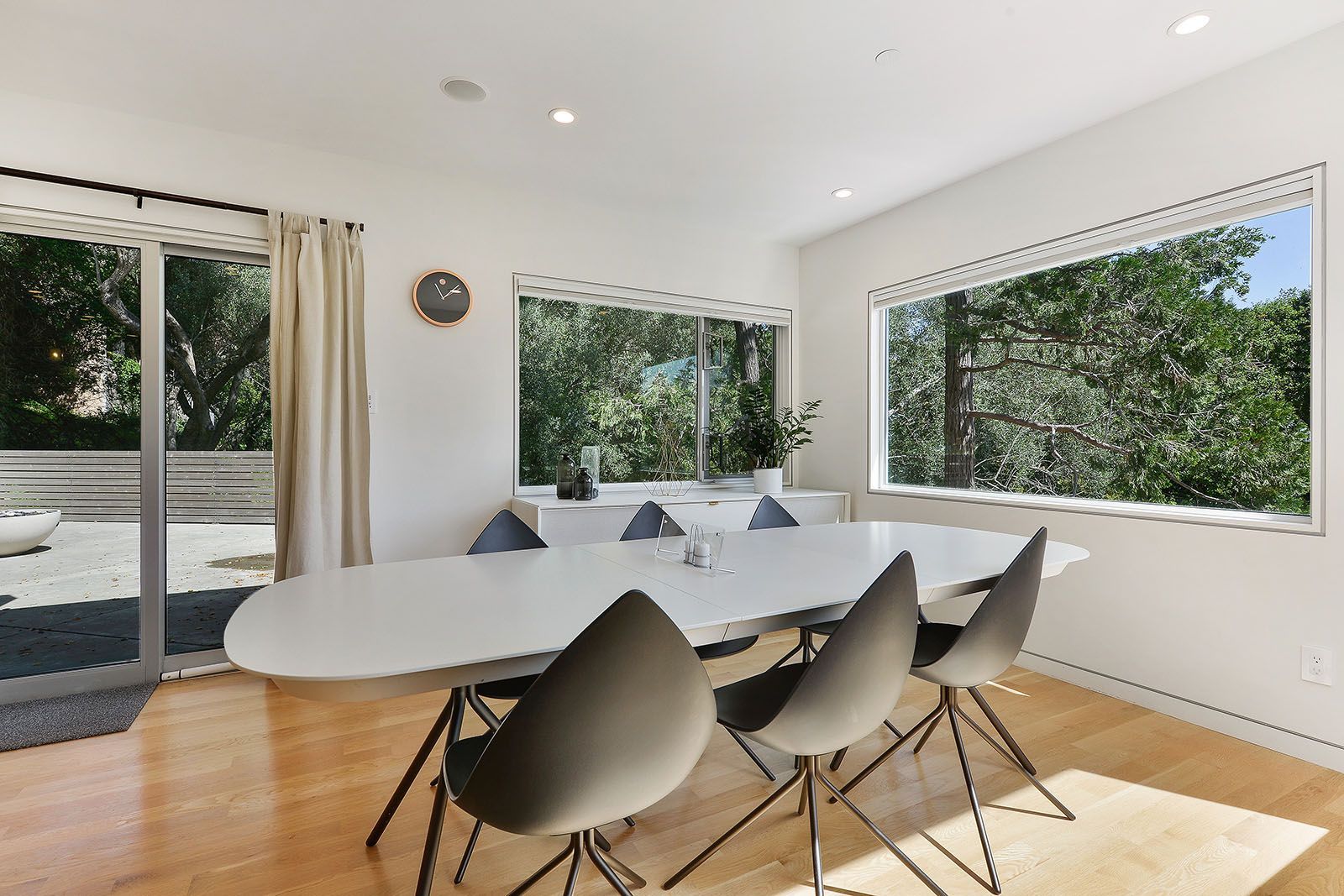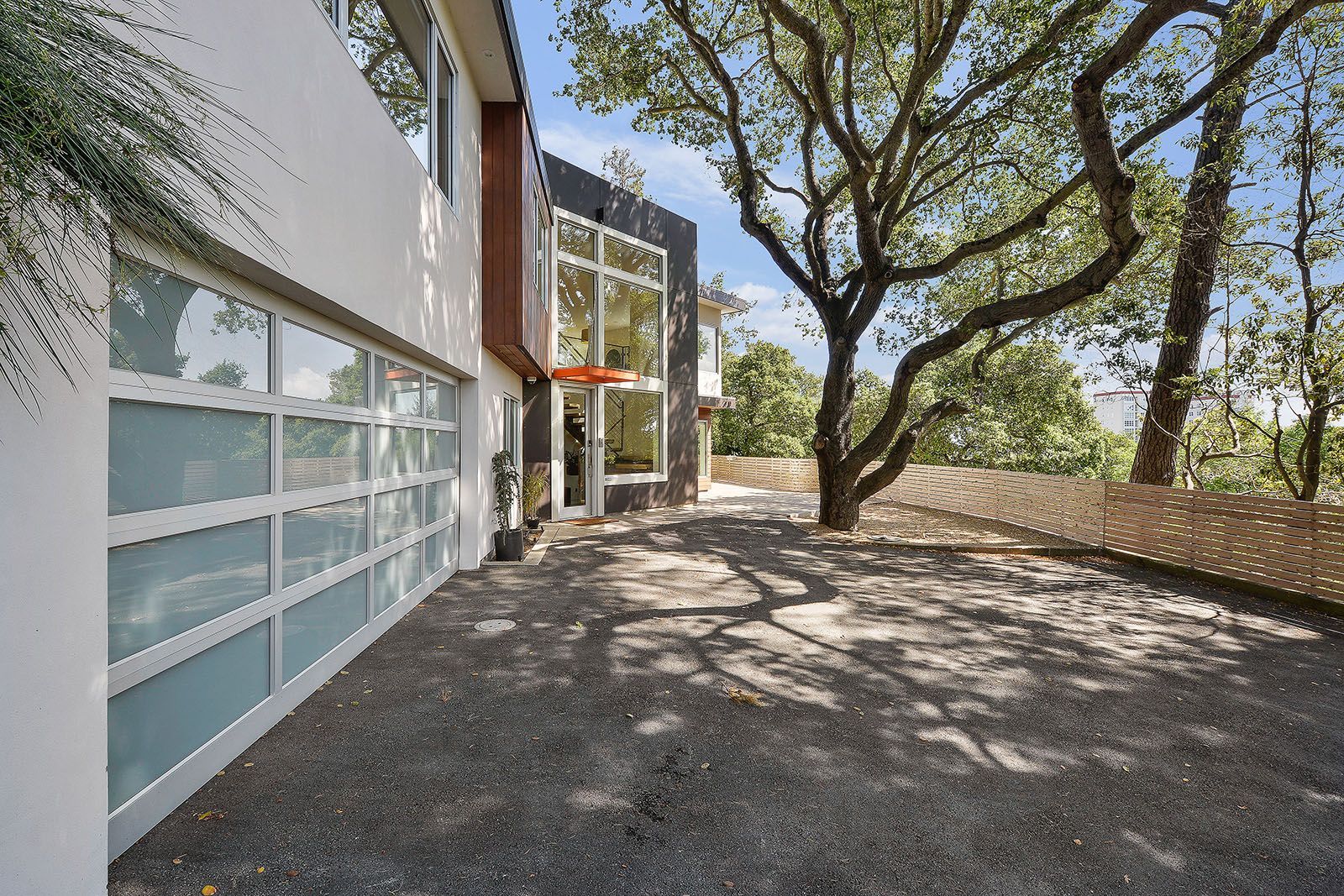 White oak floors and simple white walls accentuate the modern design, including the open chef's kitchen with Thermador appliances, custom cabinets, and a quartz-topped island with a casual dining area. The primary suite includes a patio, while the lower level features a secondary living area, an au pair suite, and an office.