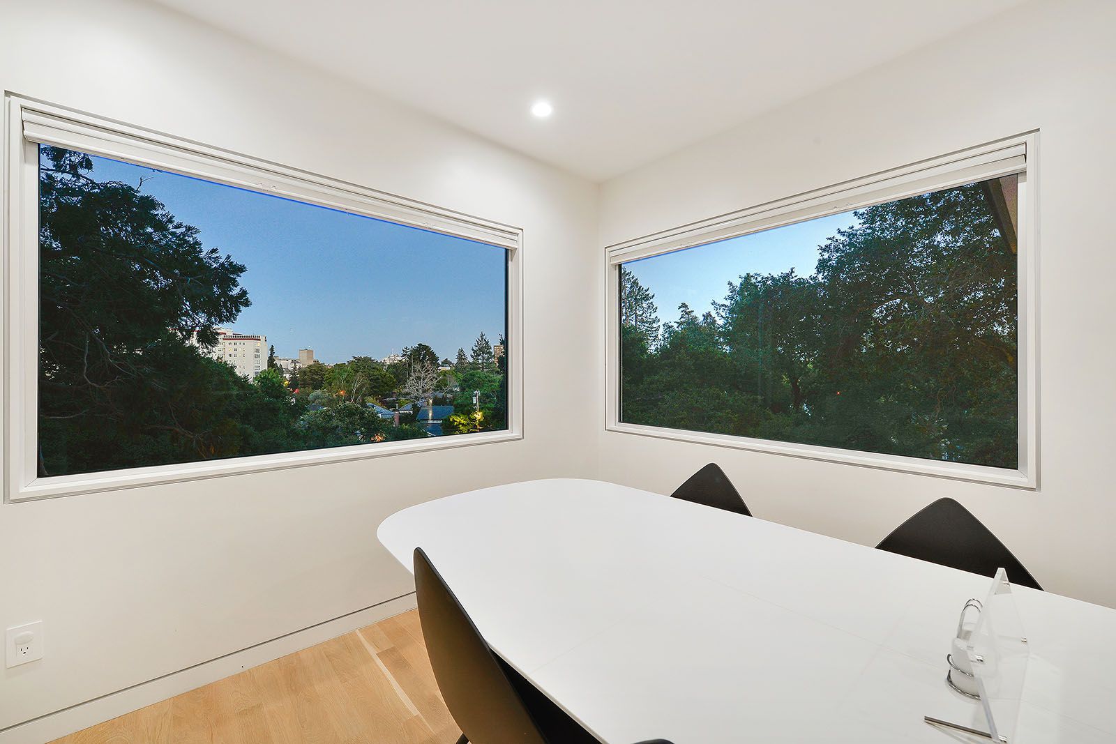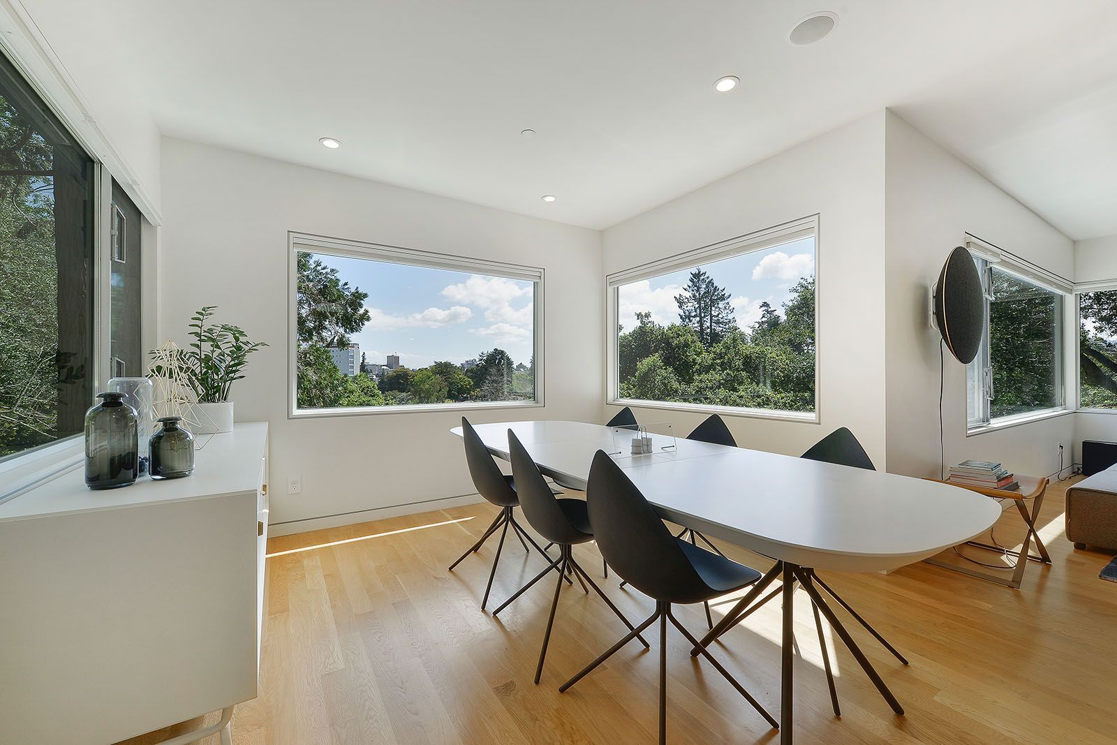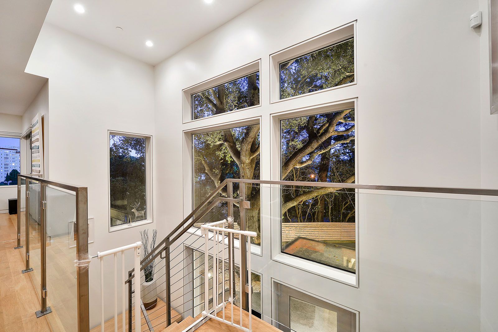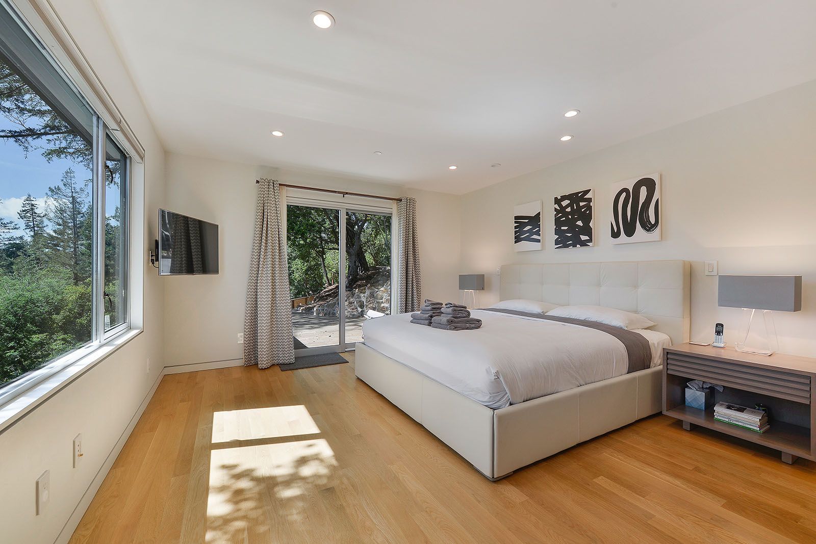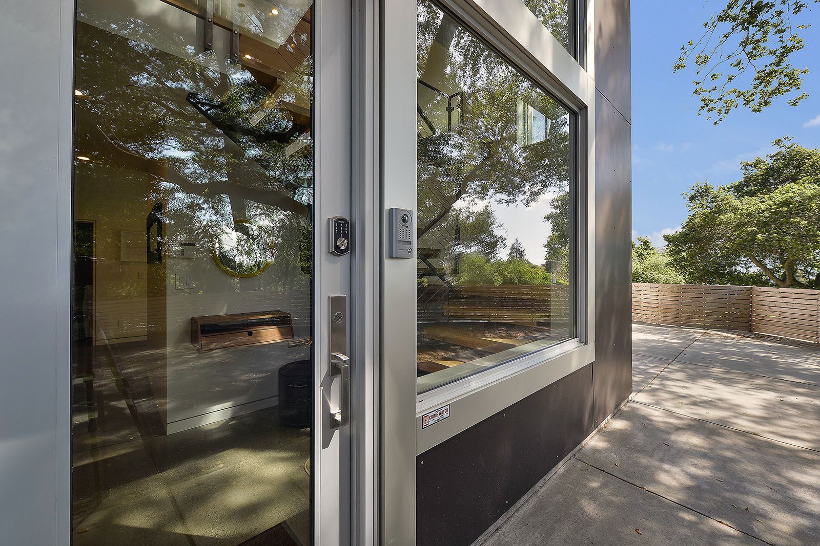 White oak floors and simple white walls accentuate the modern design, including the open chef's kitchen with Thermador appliances, custom cabinets, and a quartz-topped island with a casual dining area. The primary suite includes a patio, while the lower level features a secondary living area, an au pair suite, and an office.