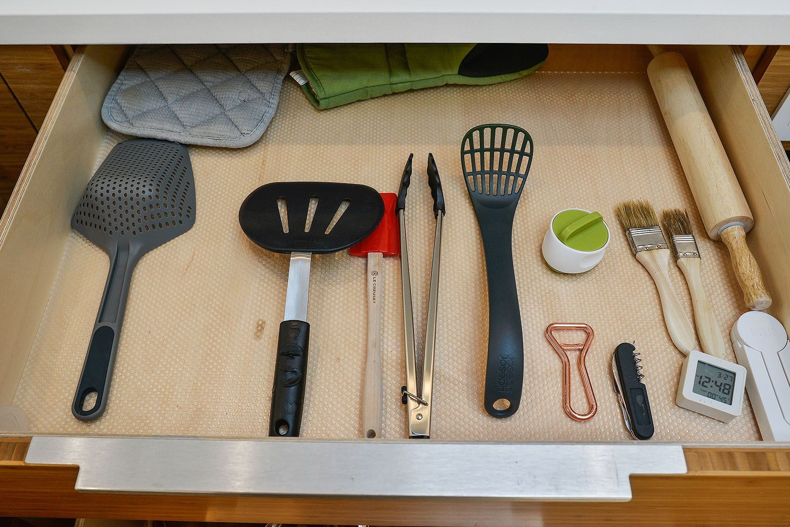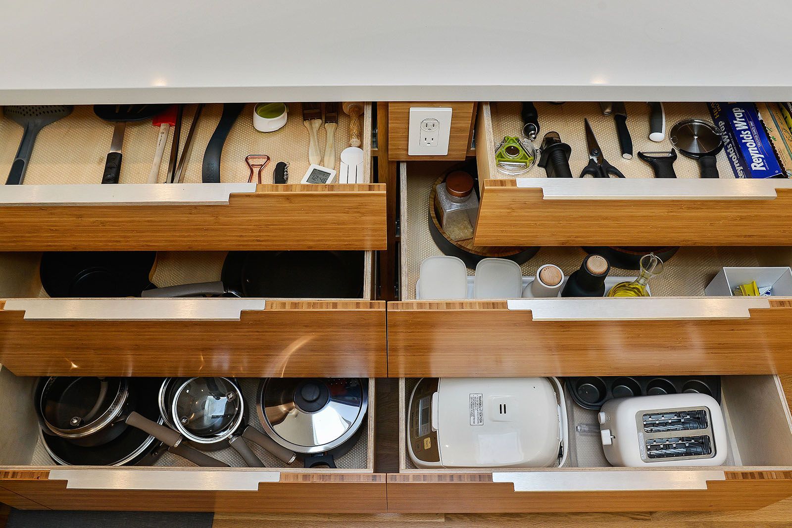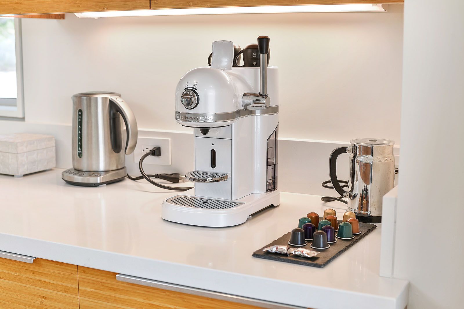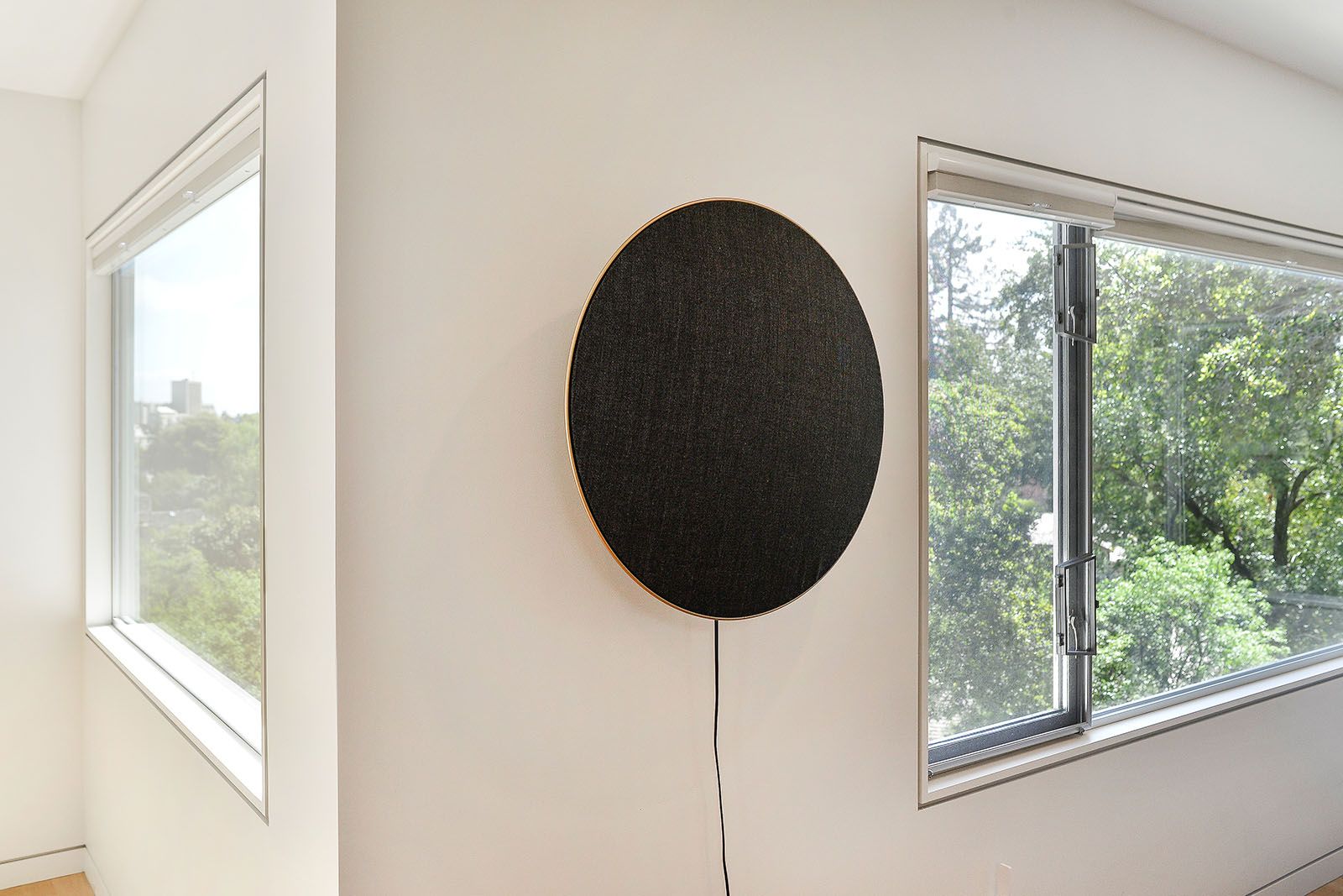 White oak floors and simple white walls accentuate the modern design, including the open chef's kitchen with Thermador appliances, custom cabinets, and a quartz-topped island with a casual dining area. The primary suite includes a patio, while the lower level features a secondary living area, an au pair suite, and an office.