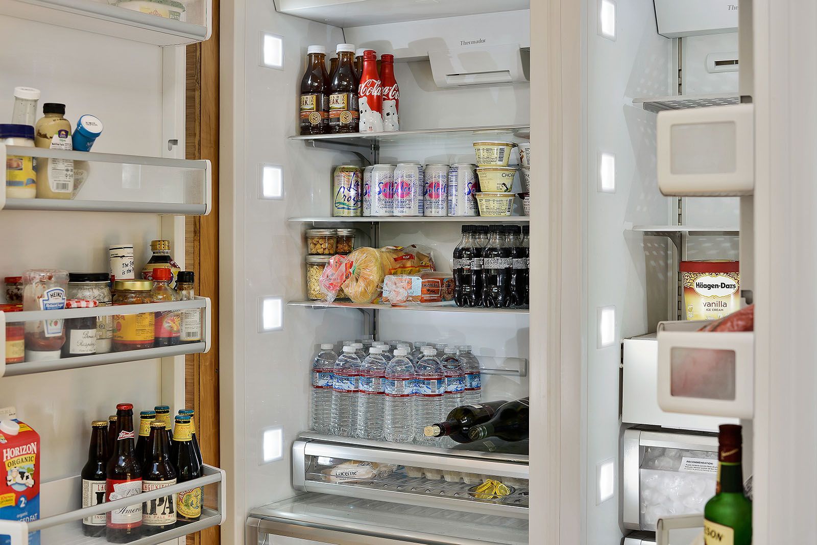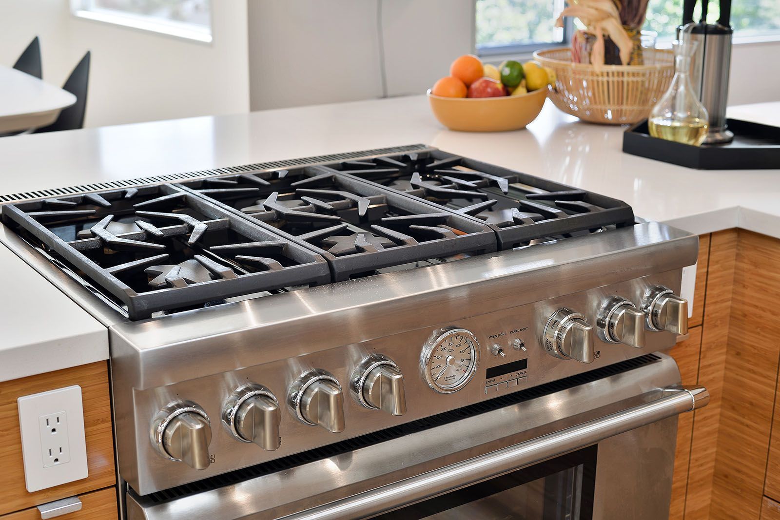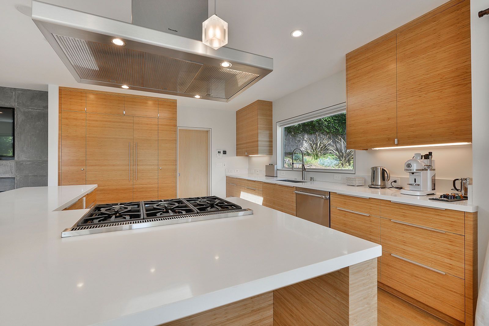- Open concept chef's kitchen with Thermador appliances, custom cabinets, and quartz-topped island.