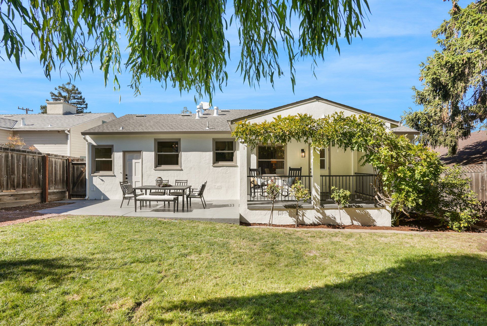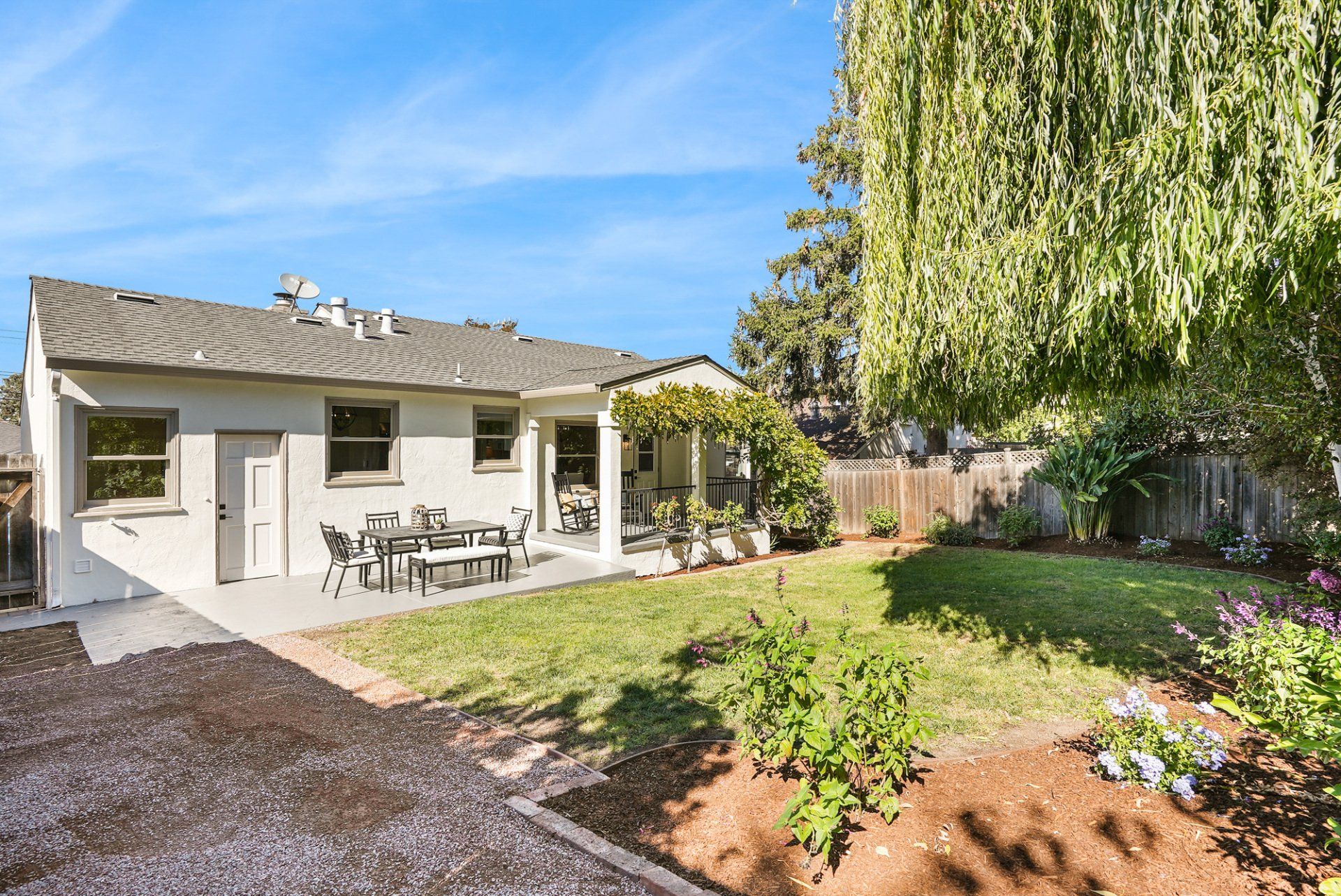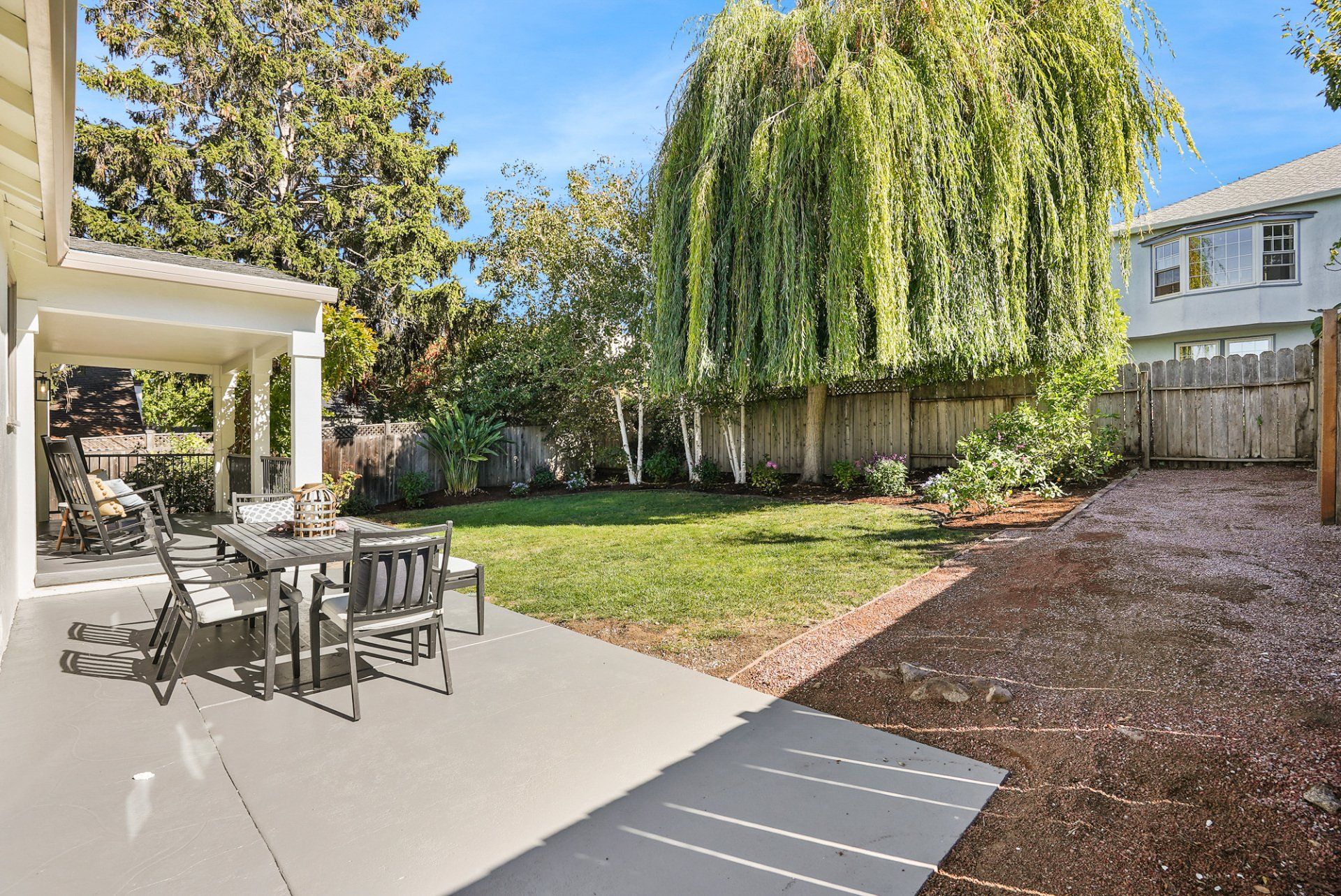 The covered rear porch is a cozy place to relax and shelter from the sun. Lush wisteria trellised along the face of the porch frames a serene view of the yard, offering roses, a producing citrus tree, a giant bird of paradise, and more. A patio extending from the porch is the perfect spot to dine al fresco or perhaps add a fire pit. Stepping into the yard a lush, sunny lawn greets you while a mature weeping willow and birch trees provides a shady backdrop along the fenceline.