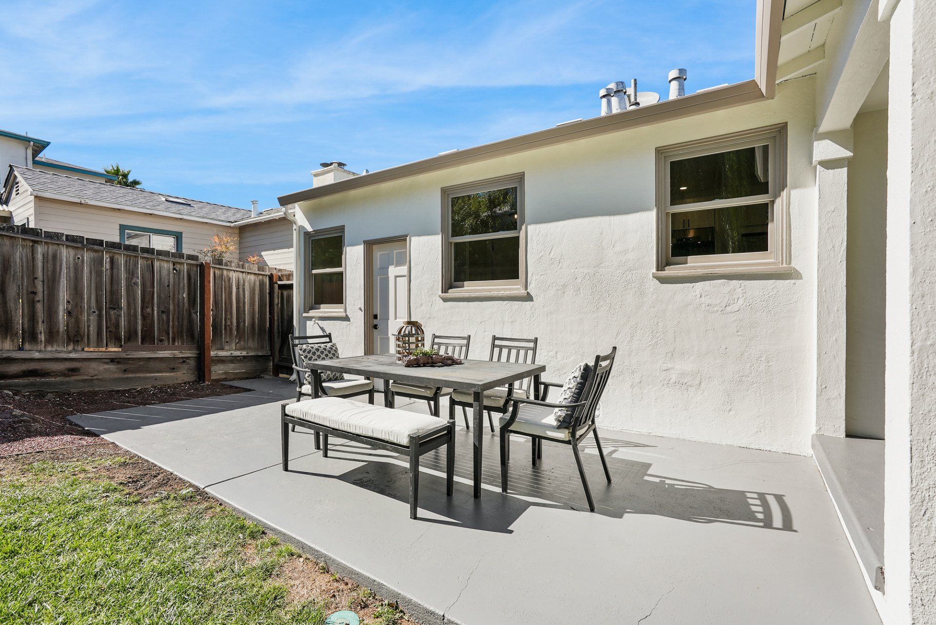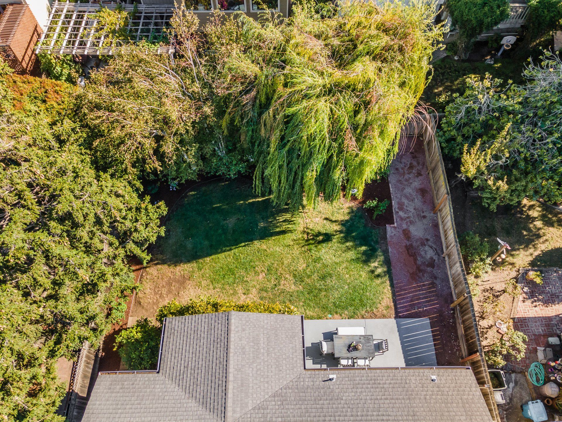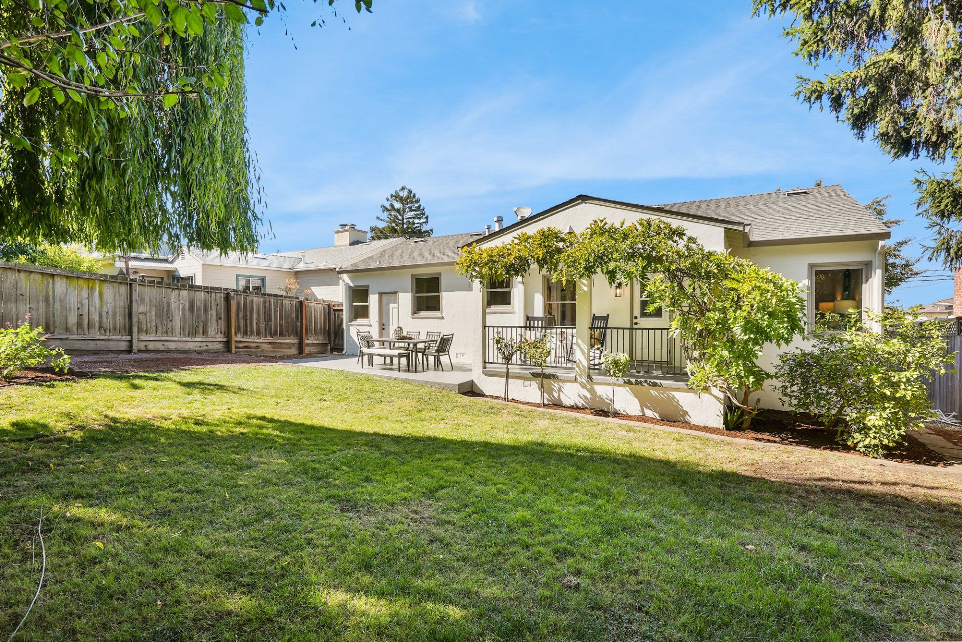 The covered rear porch is a cozy place to relax and shelter from the sun. Lush wisteria trellised along the face of the porch frames a serene view of the yard, offering roses, a producing citrus tree, a giant bird of paradise, and more. A patio extending from the porch is the perfect spot to dine al fresco or perhaps add a fire pit. Stepping into the yard a lush, sunny lawn greets you while a mature weeping willow and birch trees provides a shady backdrop along the fenceline.