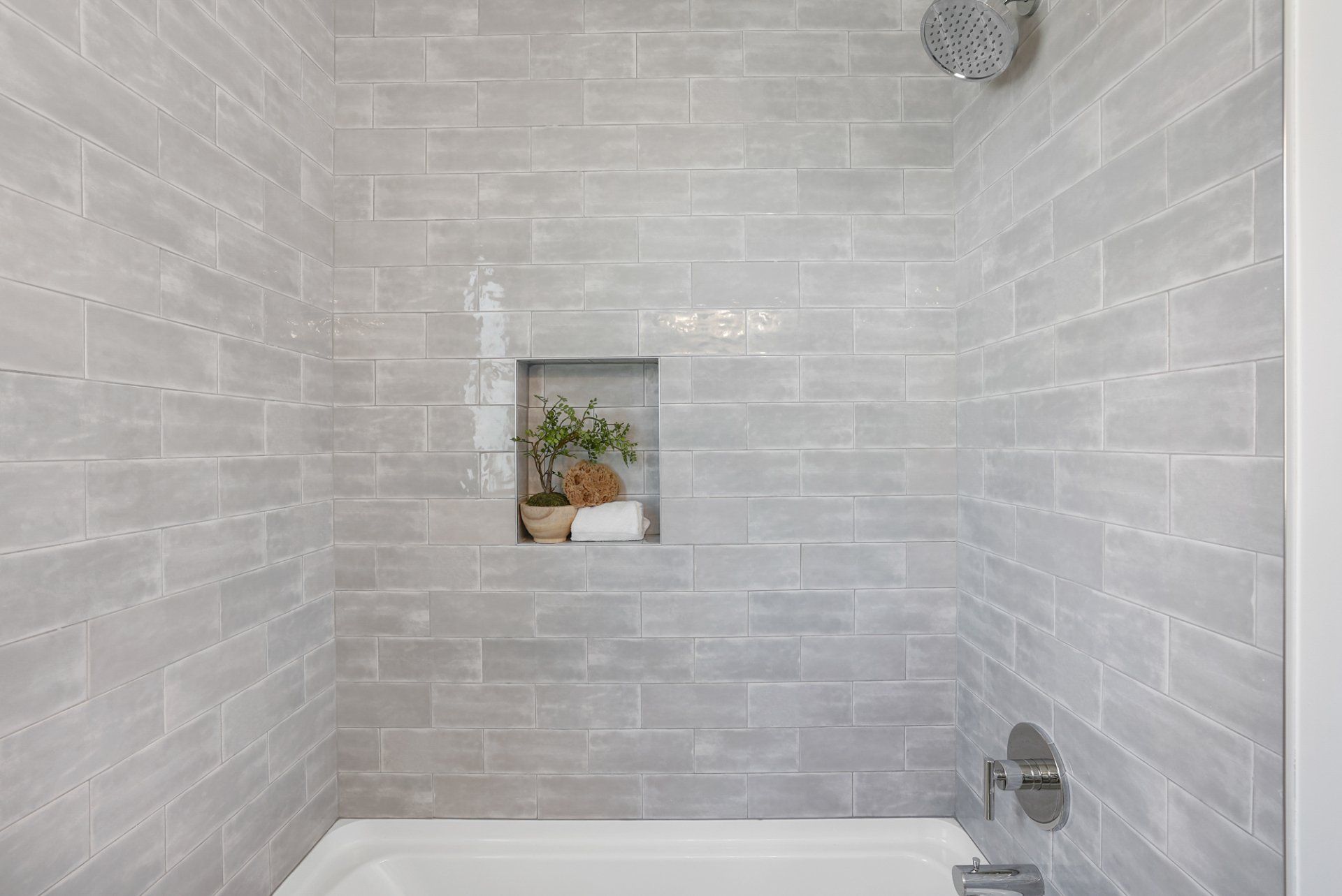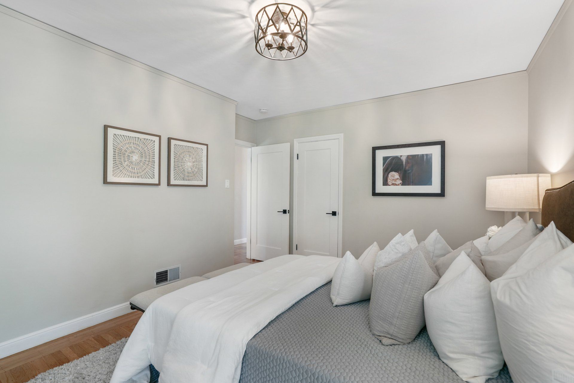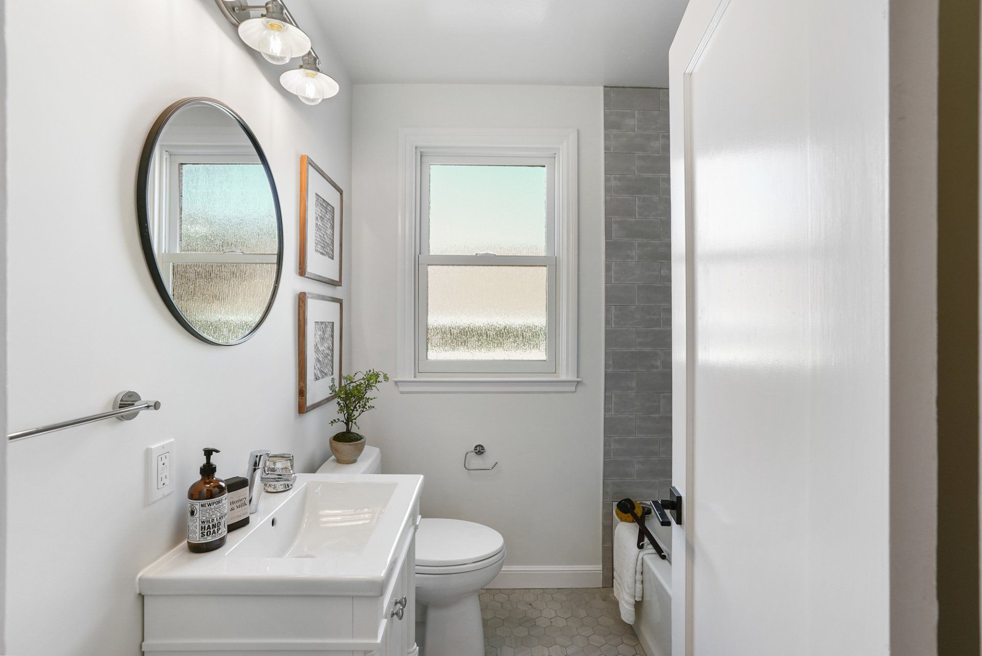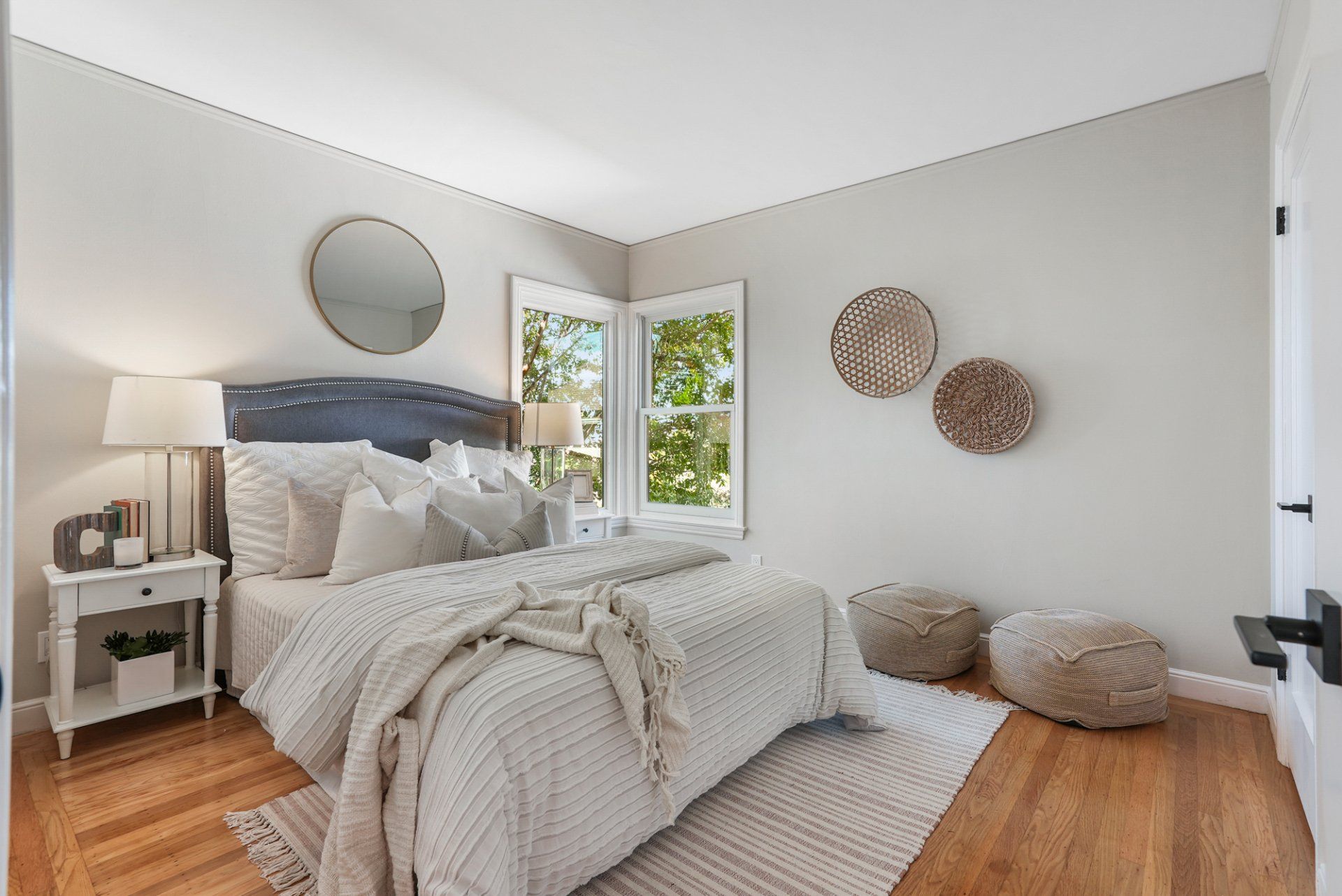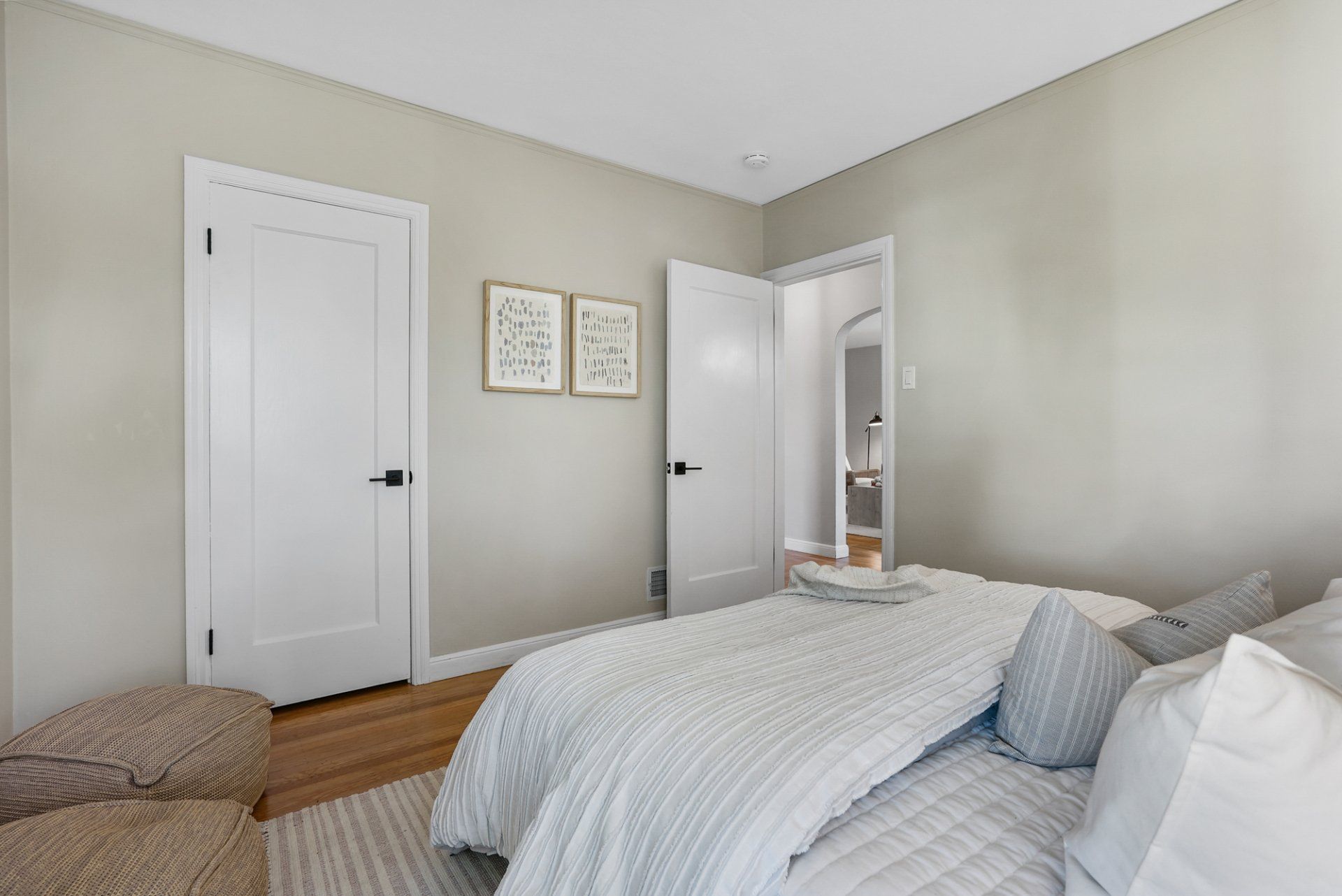 Private quarters are down the main hall from the entryway or dining room. Bedrooms are on the north and south end of the home, both with charming corner windows offering lovely views of the landscaping and closets with built-in organization. A renovated shared hallway bathroom has been updated with striking smokey blue glazed subway tile surrounding the tub/shower, and complete with new lighting, water fixtures, flooring, vanity, toilet, and hardware. The hallway also provides two additional storage closets.