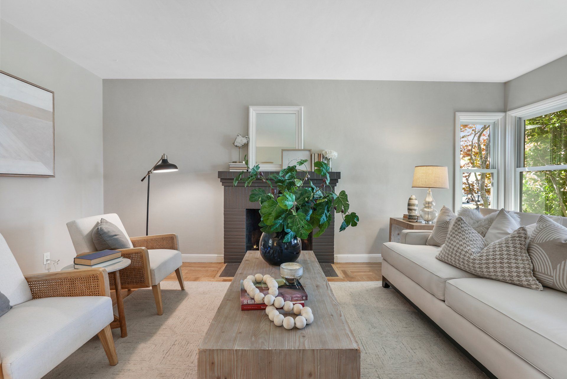 Inside, timeless elements like arched doorways, refinished parquet hardwood flooring, and a vintage doorbell enhance the character of this home as you explore the easy-flowing floor plan. The entryway carries you forward into the spacious living room boasting a wood-burning fireplace. Wrap-around picture windows cast filtered light across parquet flooring and provide a serene view of the nature-filled front yard.