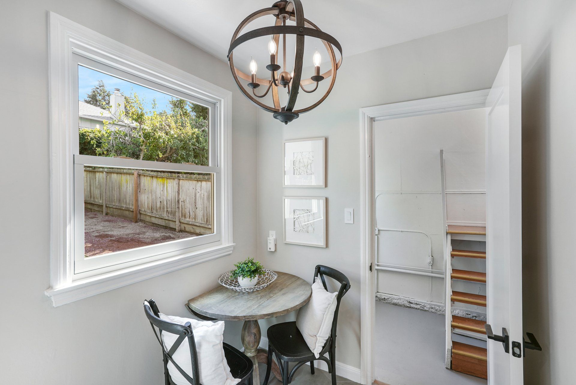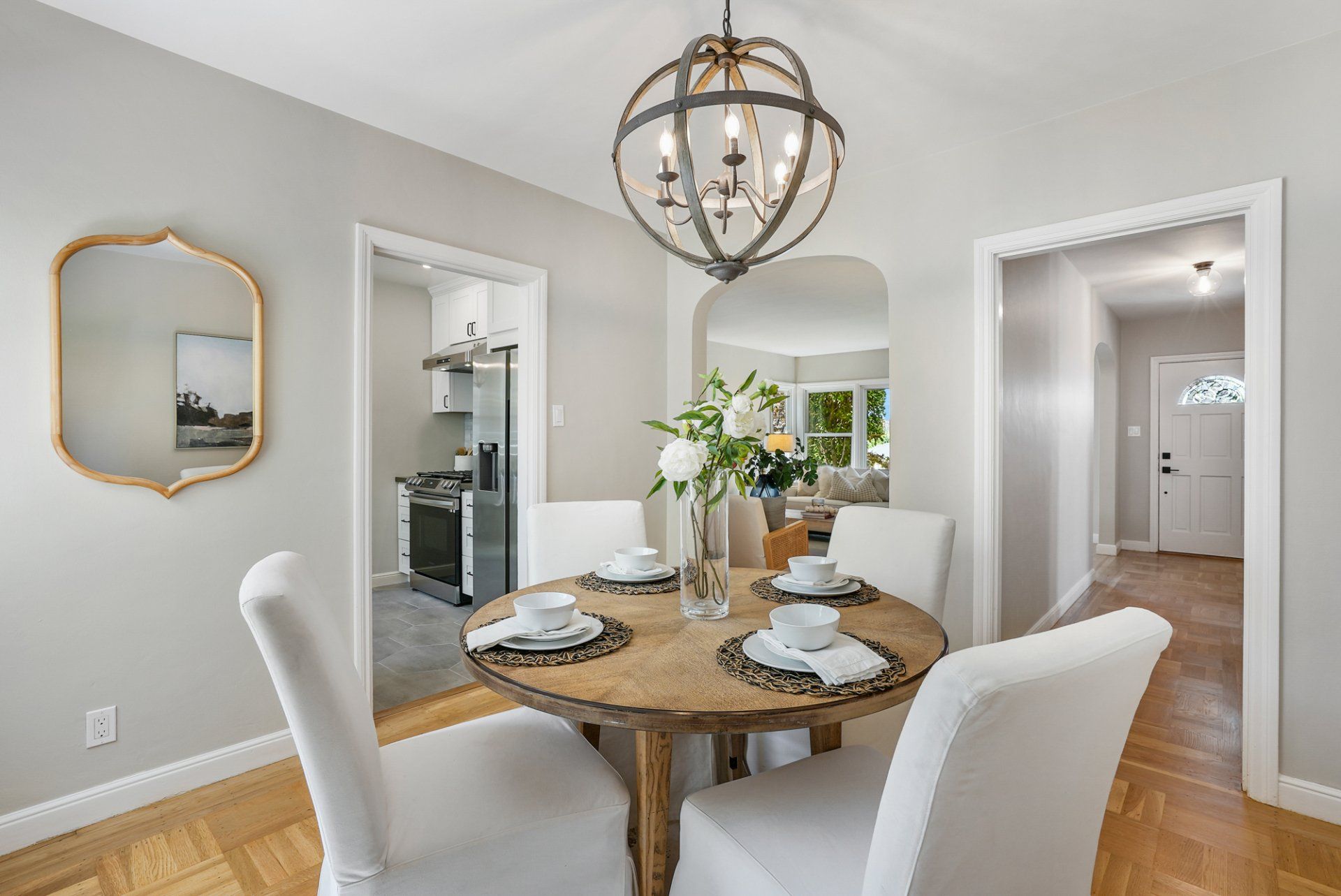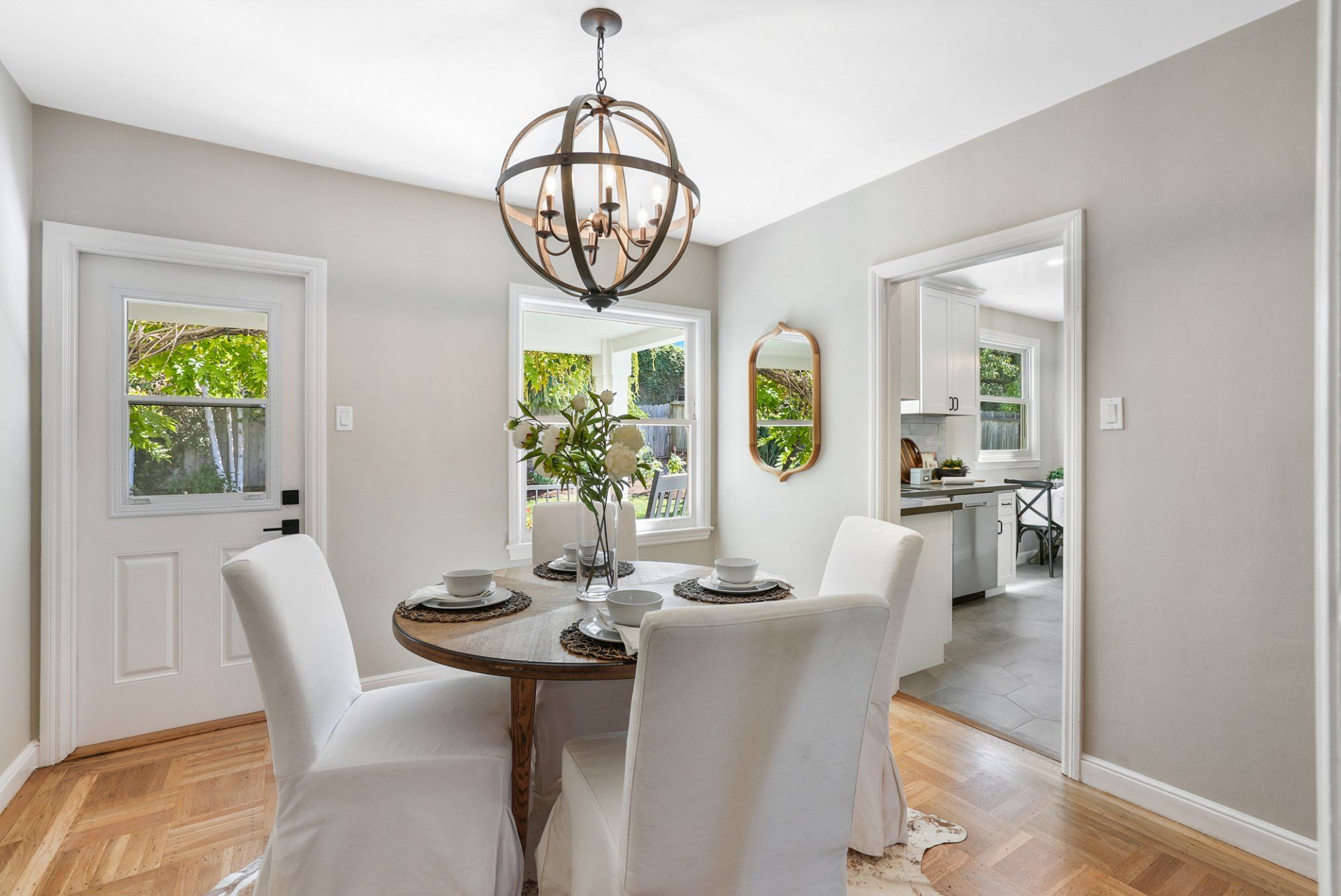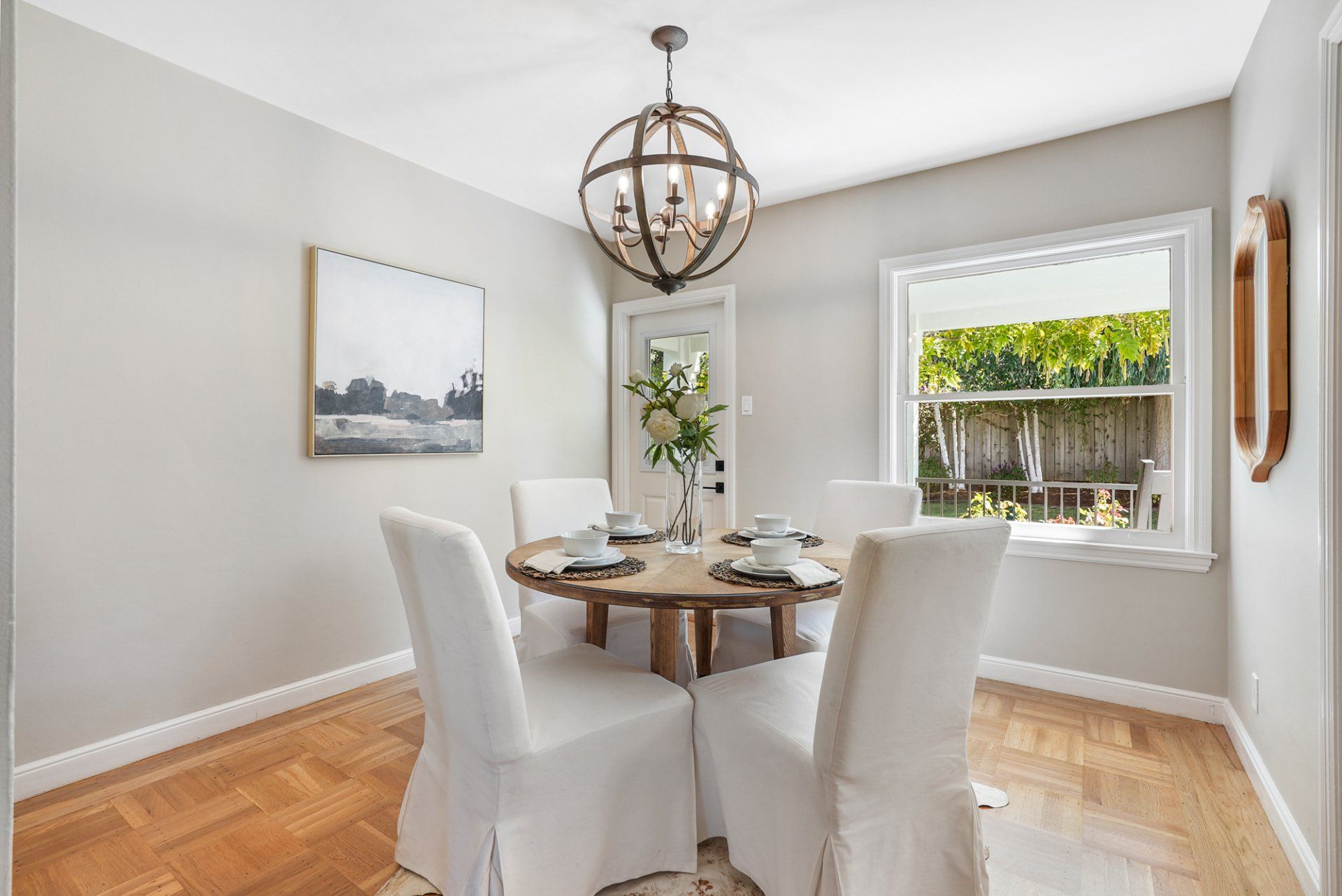 Straight ahead through another arched doorway, the formal dining room provides a cozy place to gather for meals and game nights below a wooden, globe chandelier. Natural light enters from a large original picture window, which the previous owners left as a charming detail.