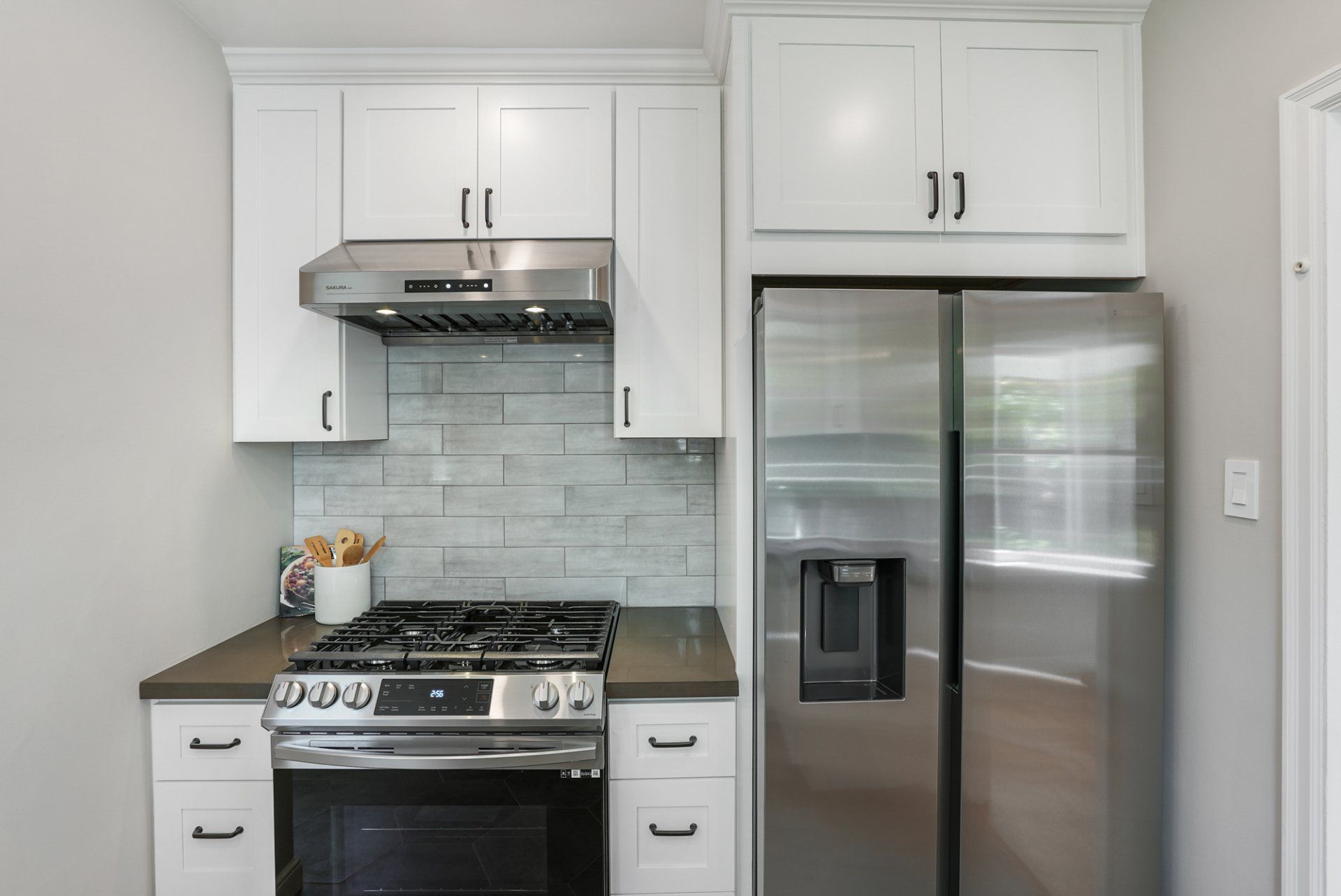- Updated kitchen features a polished tile backsplash, stainless steel Samsung appliances, and quartz countertops.