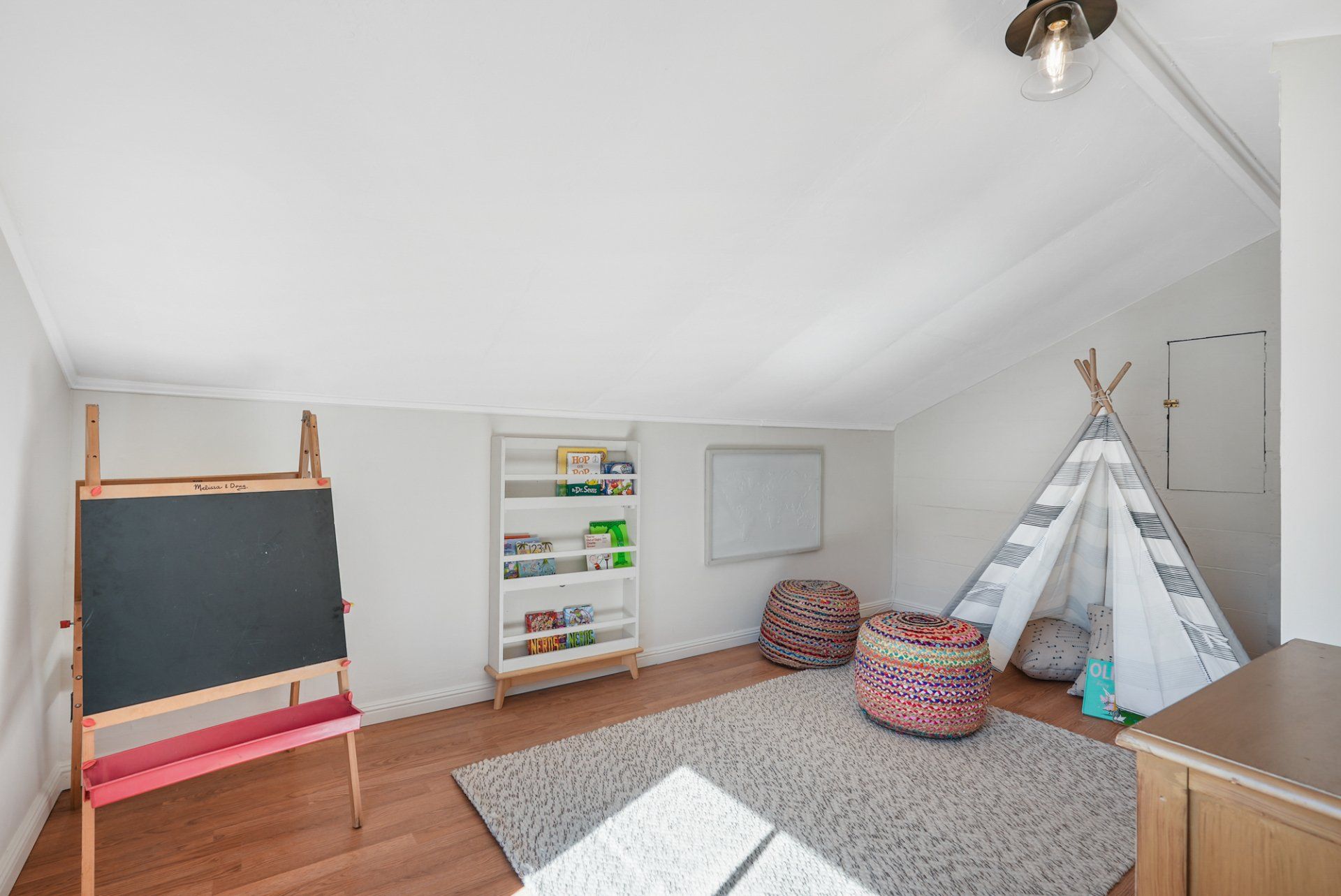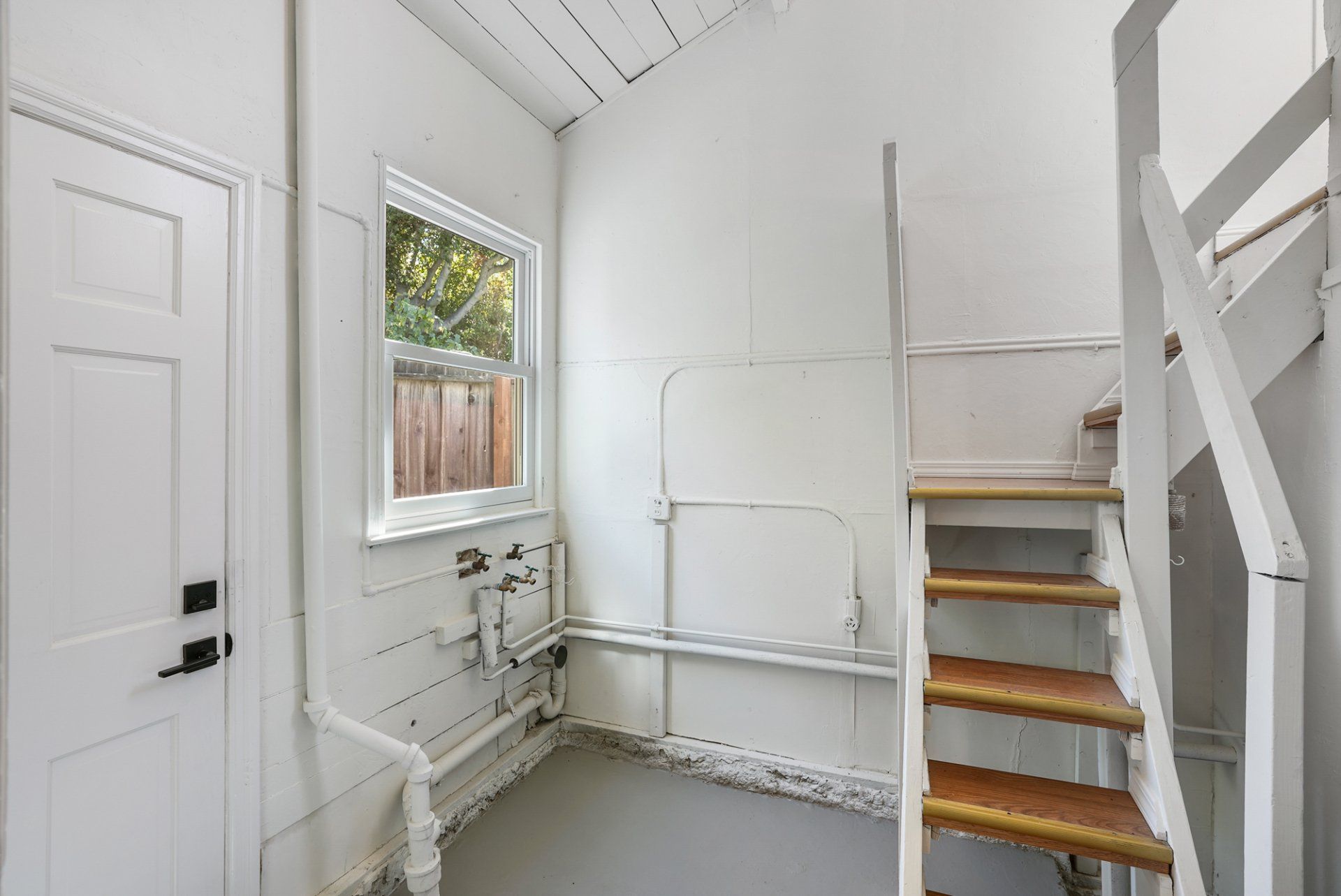 Adjacent to the kitchen, a mudroom offers a space for laundry with available hookups, a sizable storage loft accessible by a small flight of stairs, as well as access to the garage and rear yard.