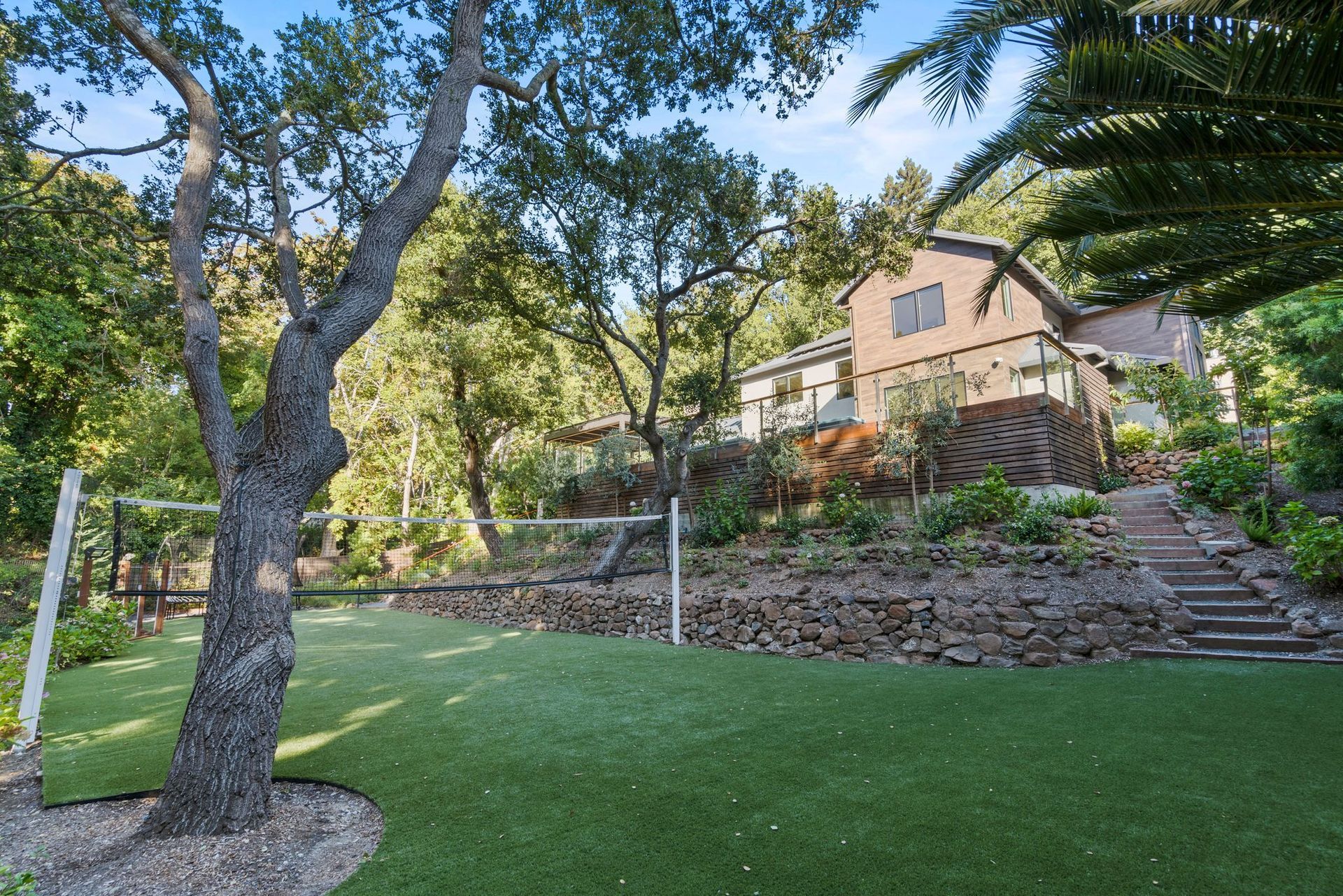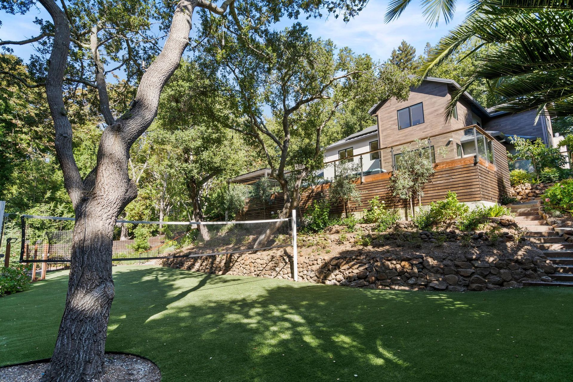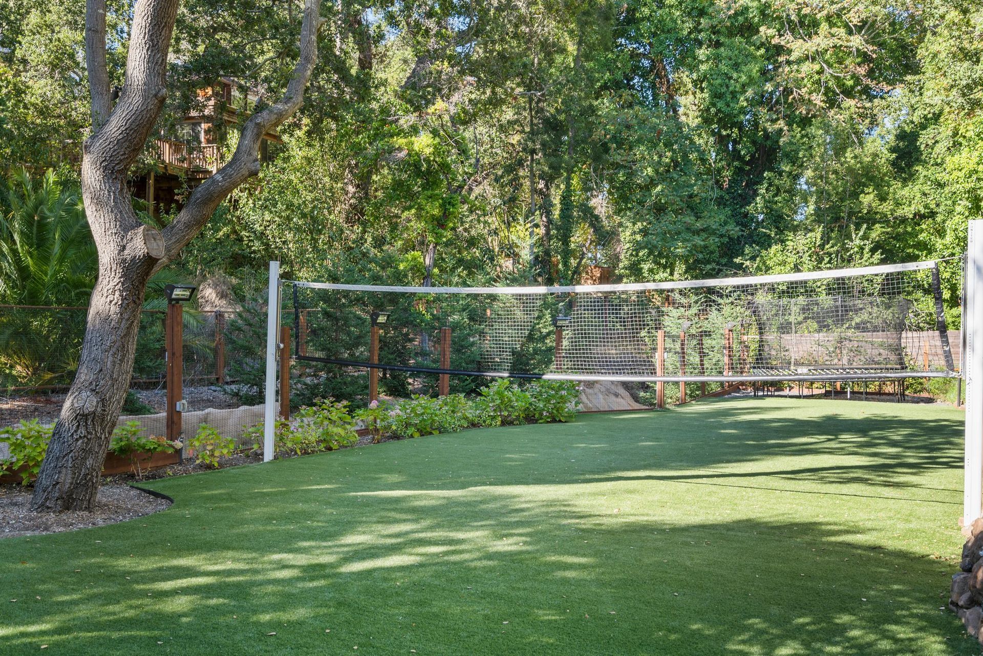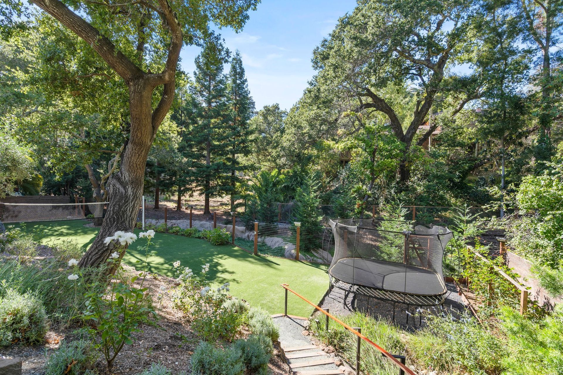 - Two tier rear yard with a full outdoor kitchen, pergola, fire pit area, pool, and on the lower terrace your very own volleyball court and trampoline.