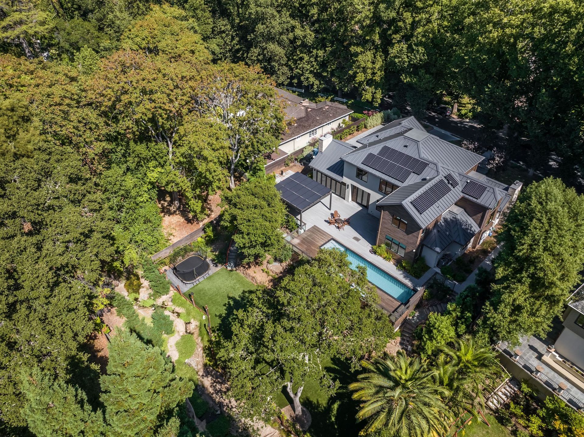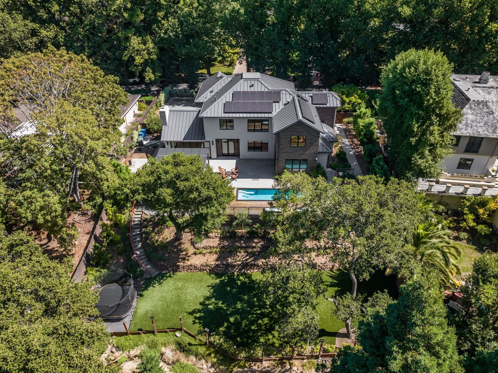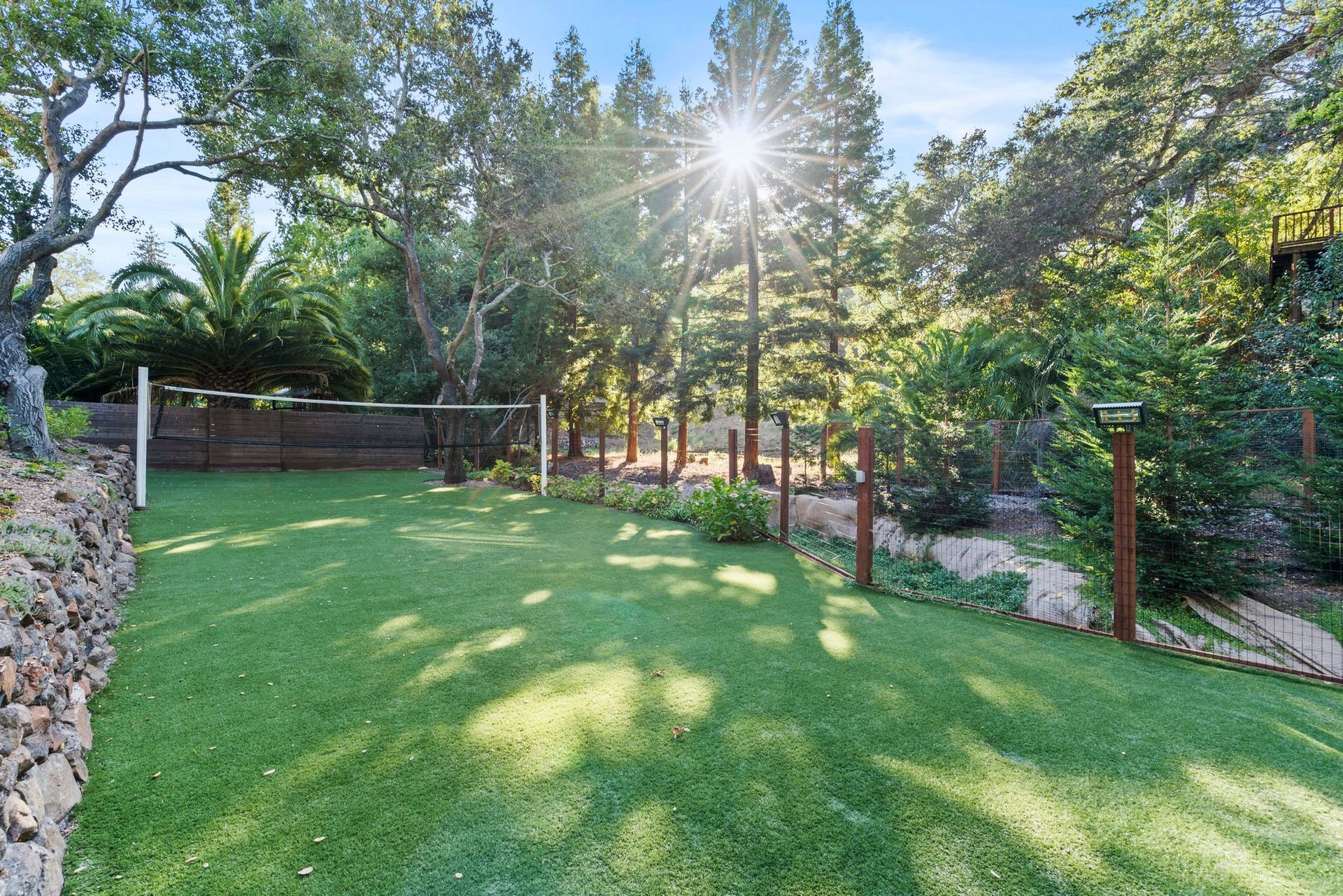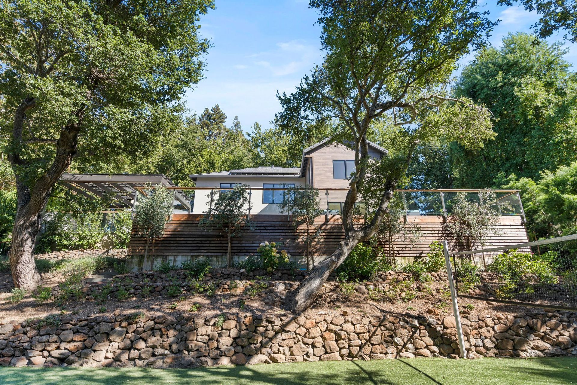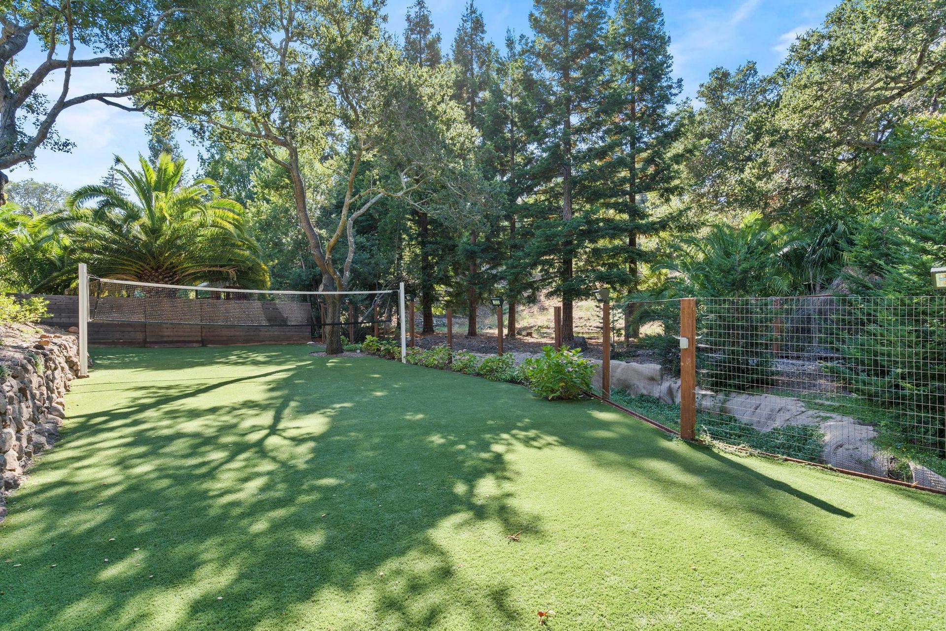 - Two tier rear yard with a full outdoor kitchen, pergola, fire pit area, pool, and on the lower terrace your very own volleyball court and trampoline.