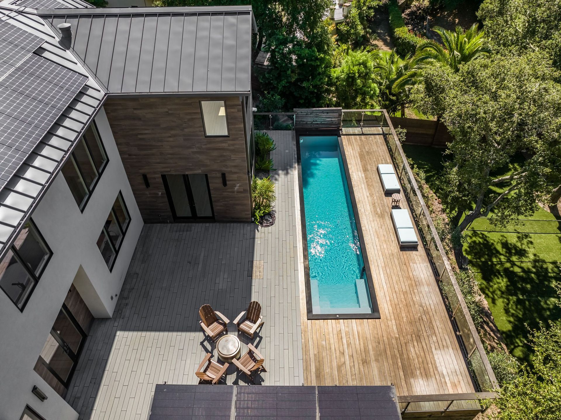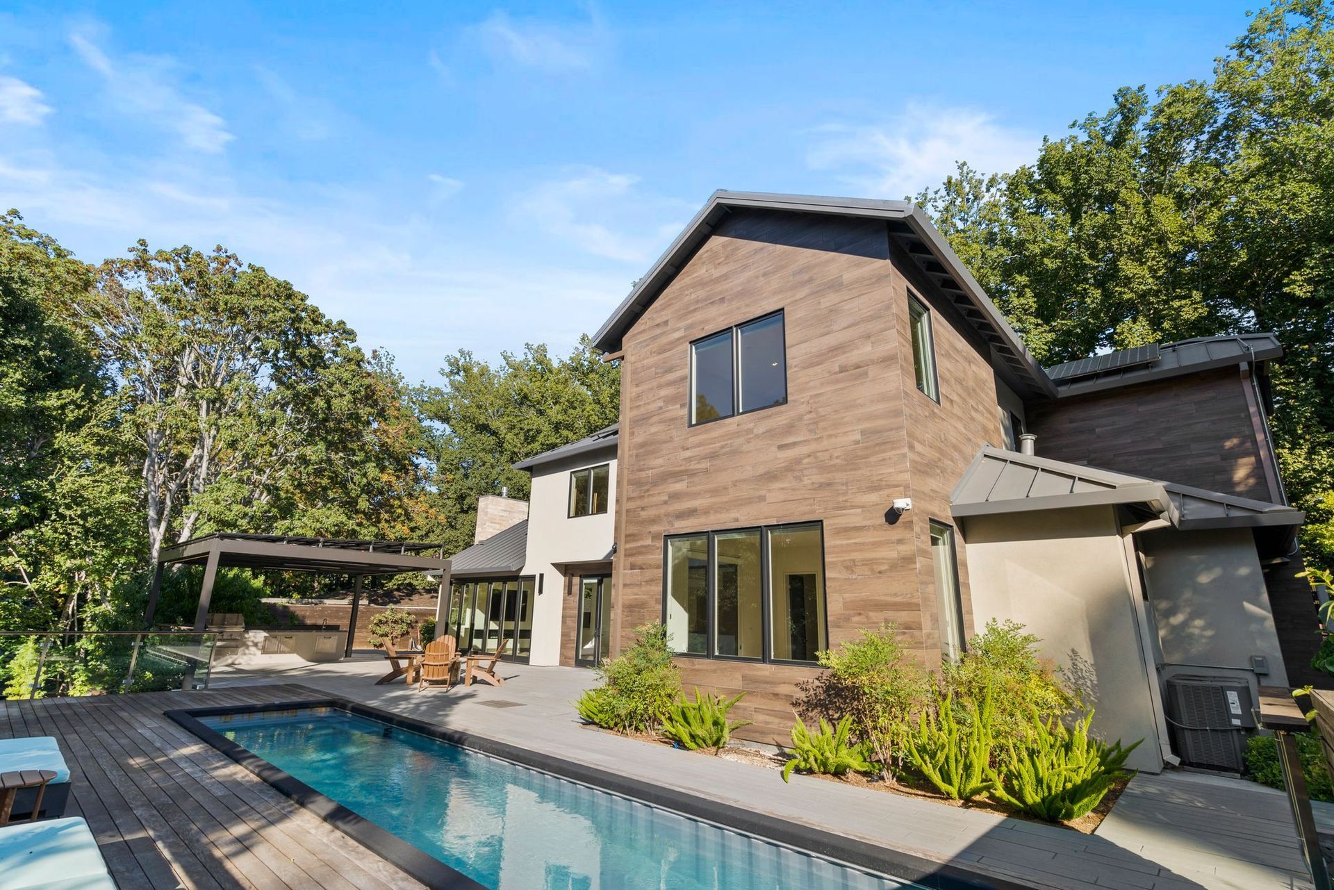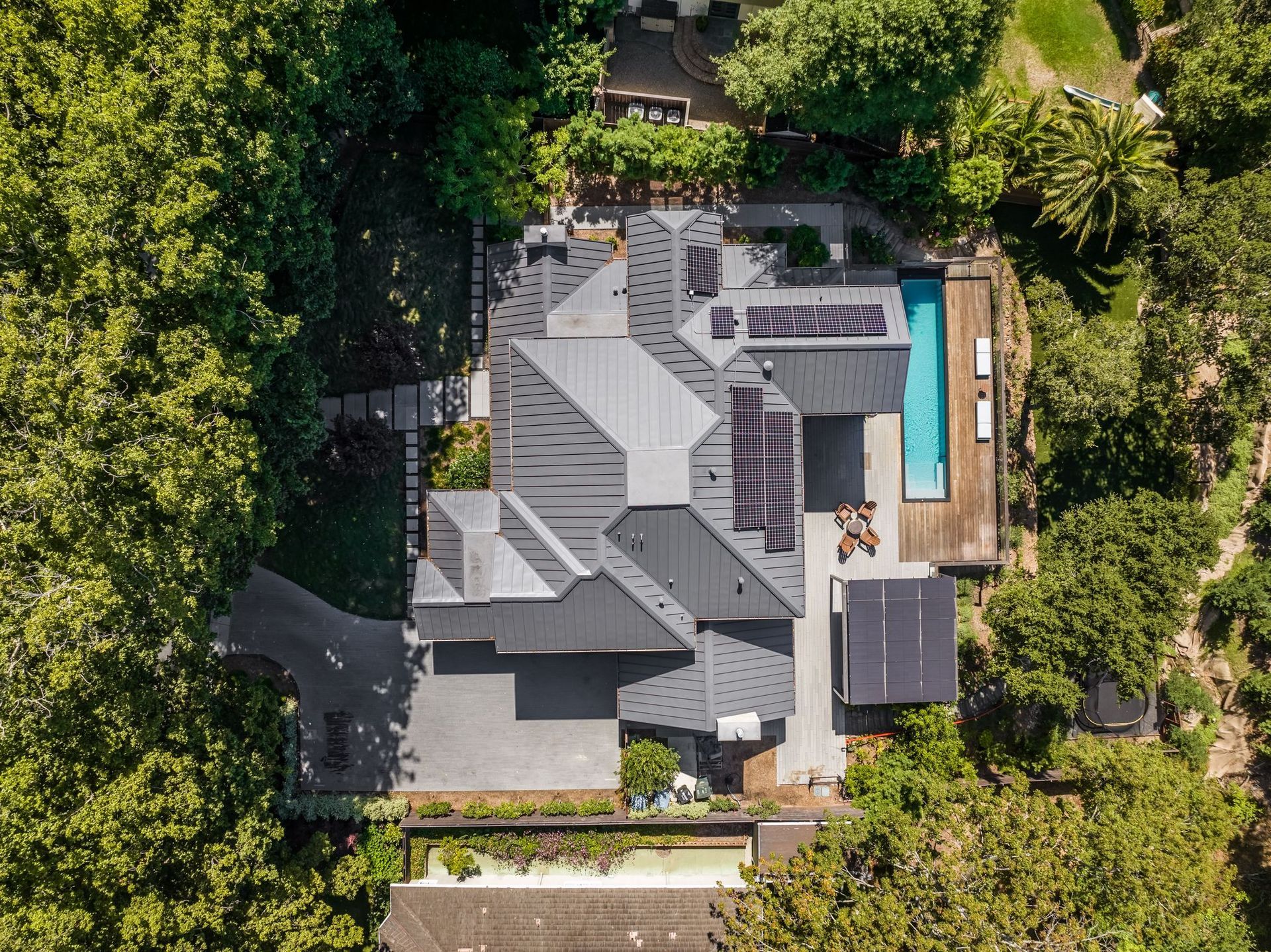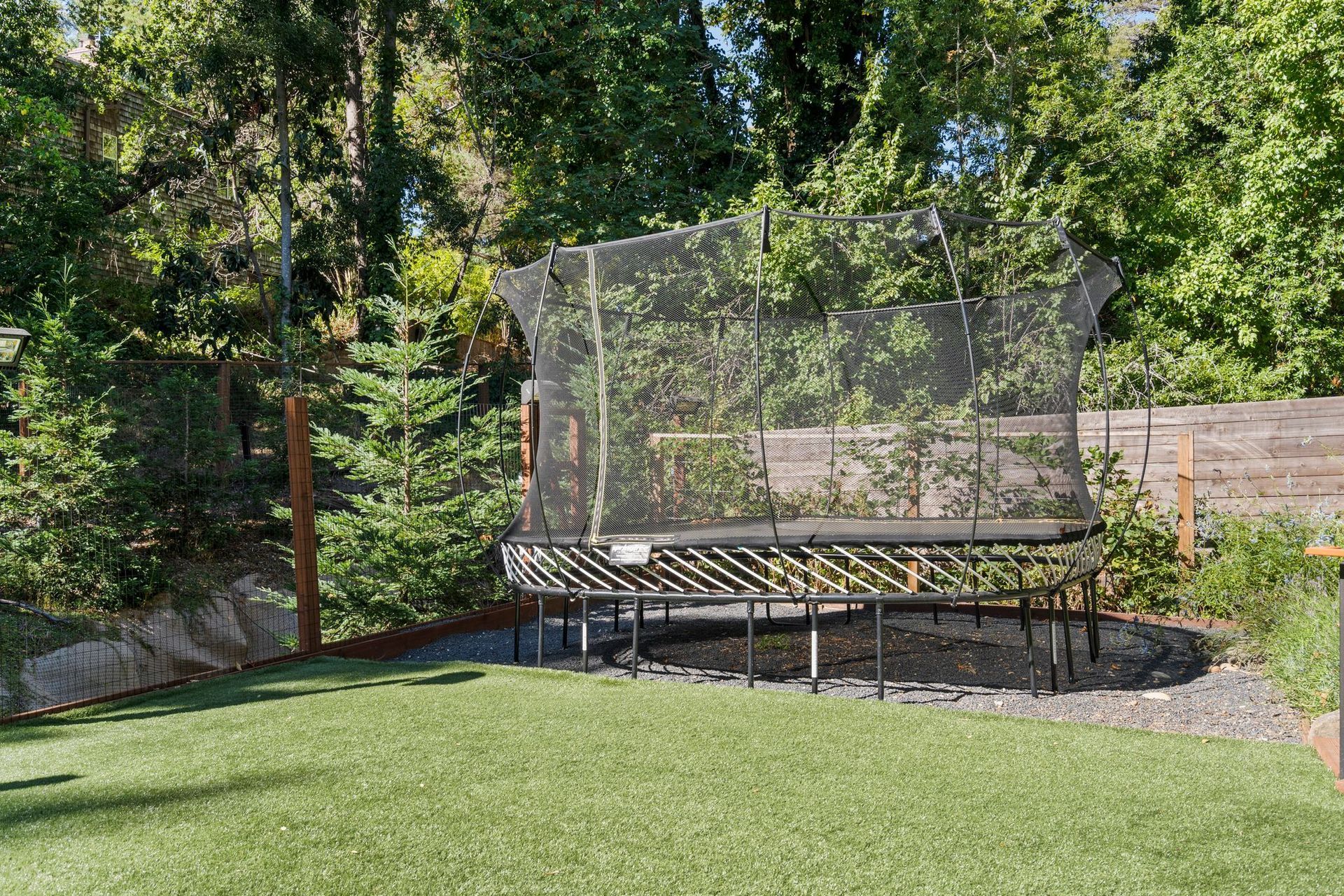 - Two tier rear yard with a full outdoor kitchen, pergola, fire pit area, pool, and on the lower terrace your very own volleyball court and trampoline.