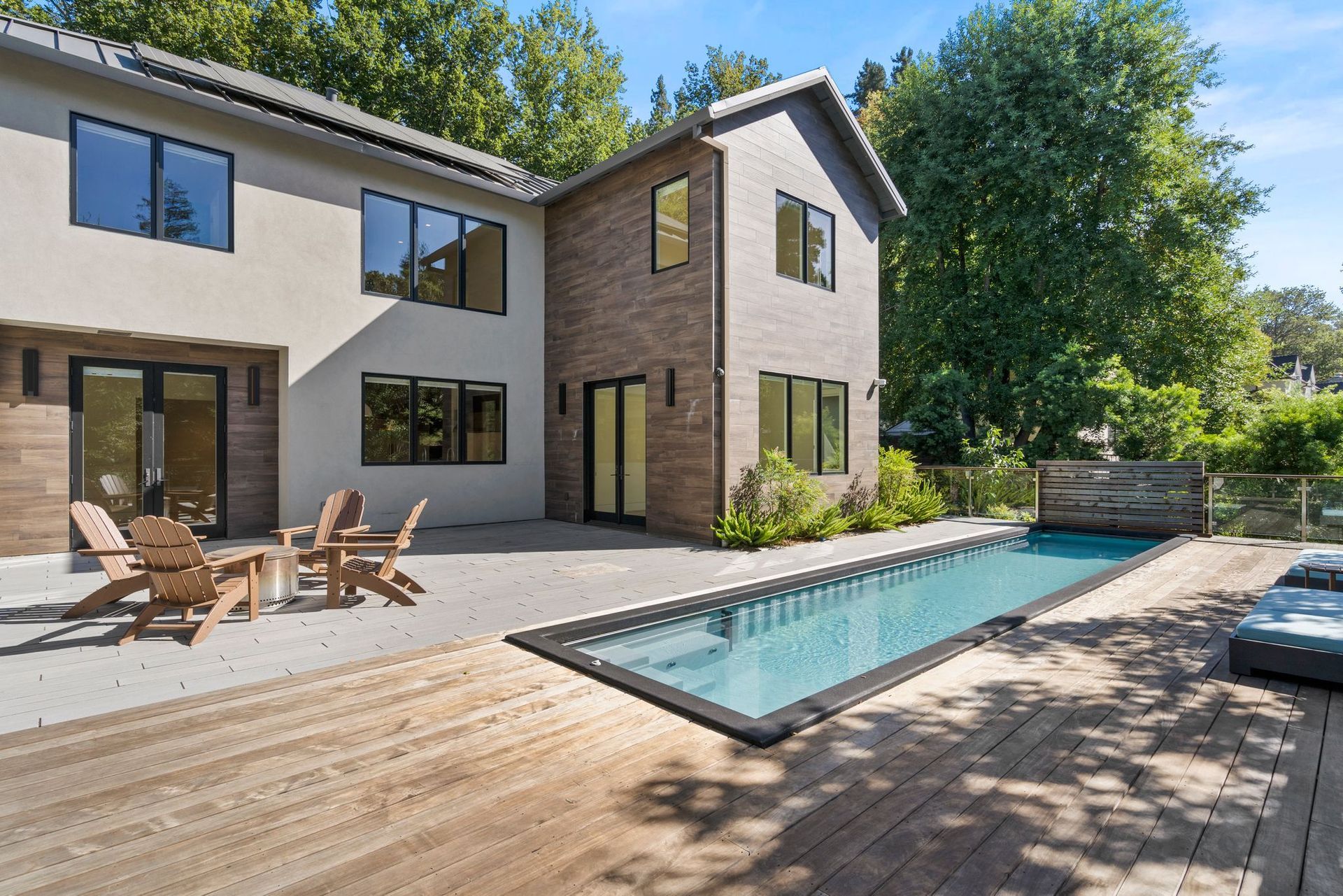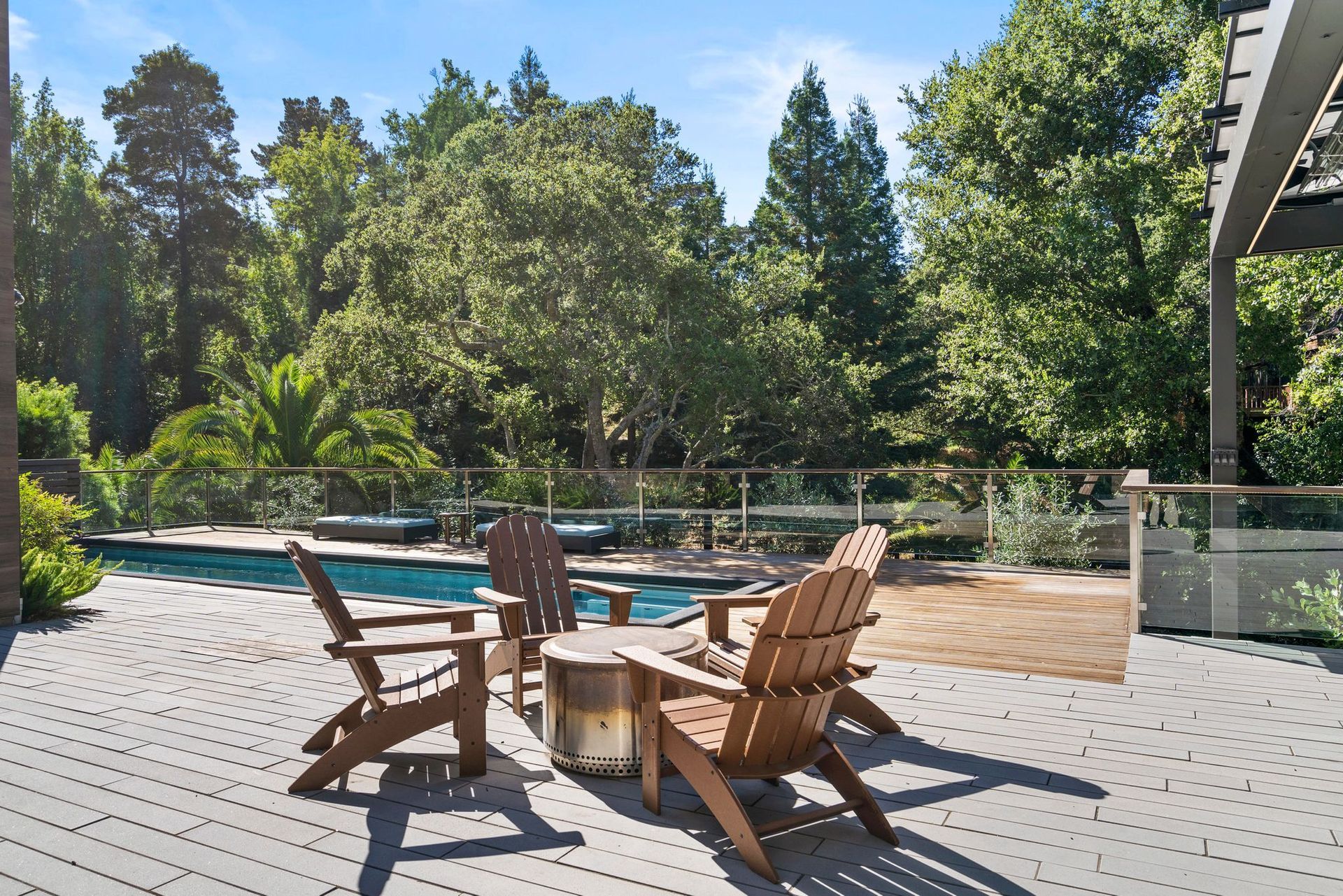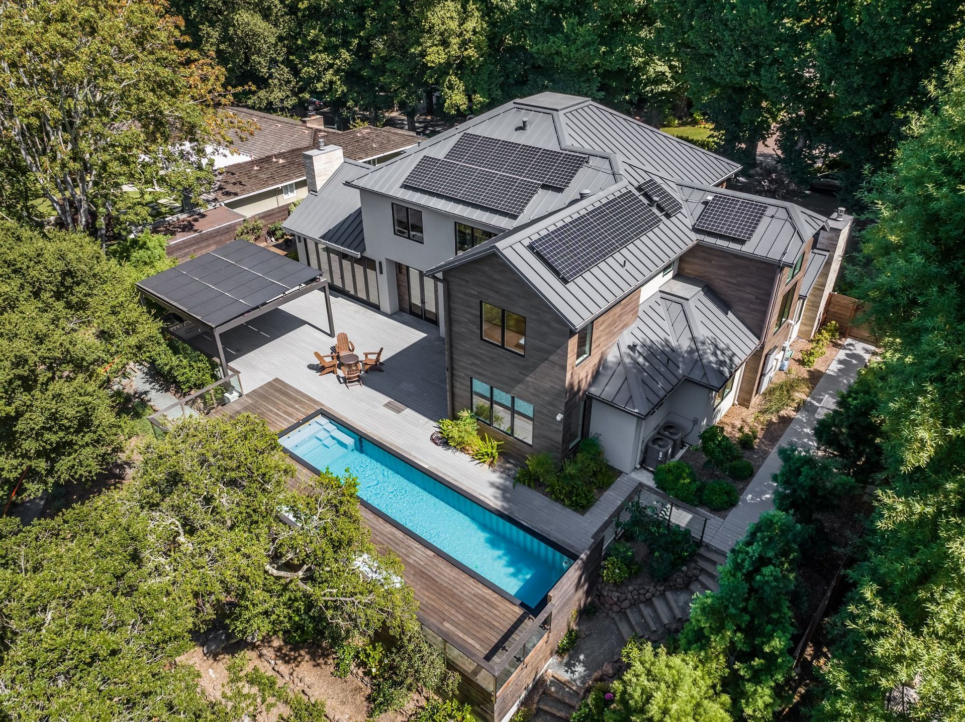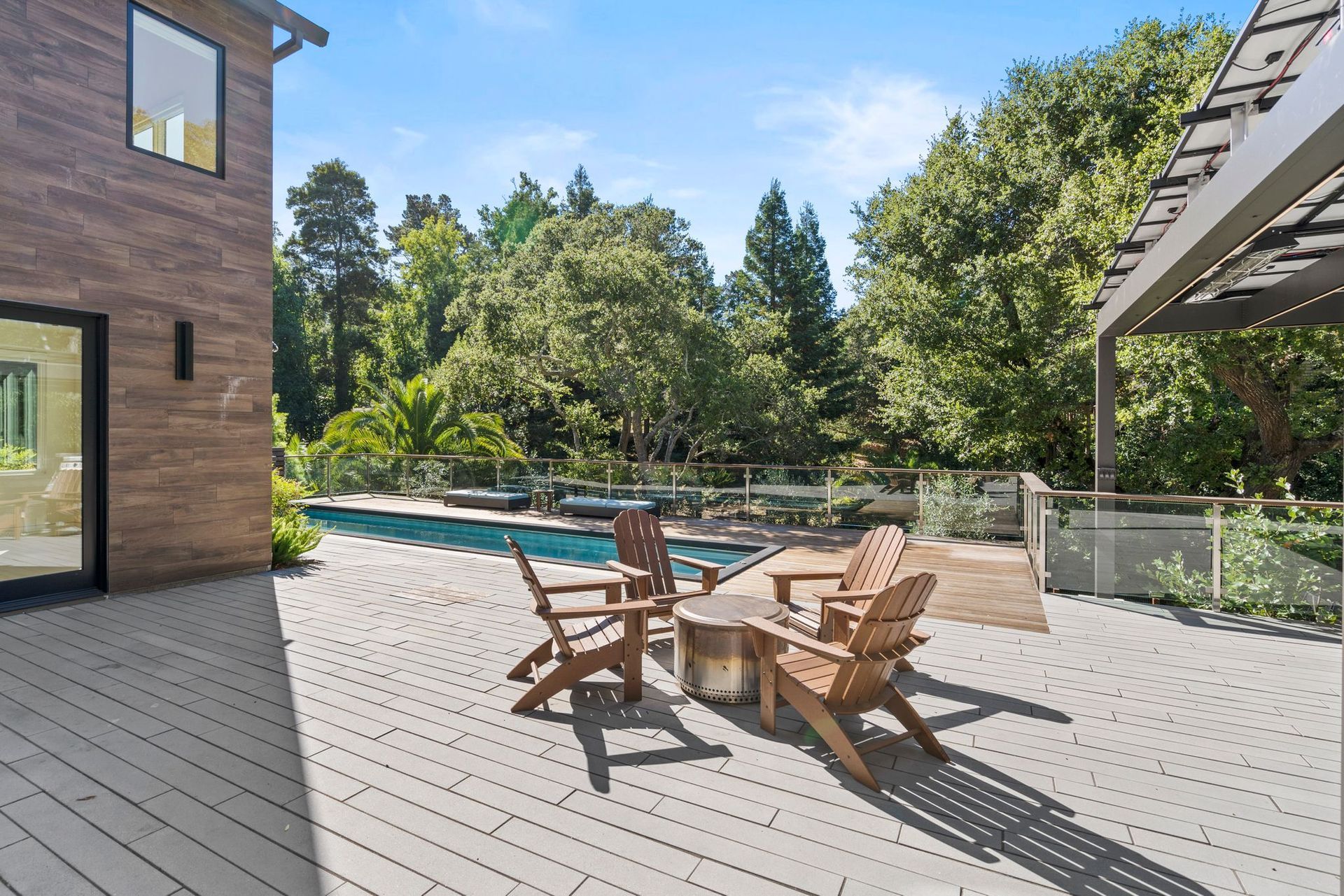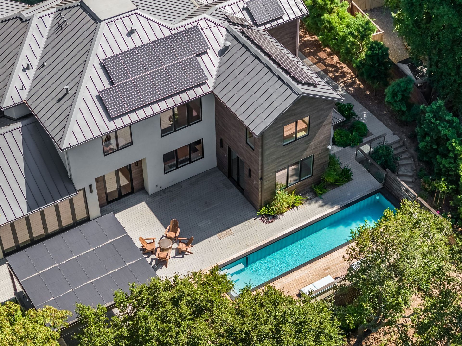 - Two tier rear yard with a full outdoor kitchen, pergola, fire pit area, pool, and on the lower terrace your very own volleyball court and trampoline.