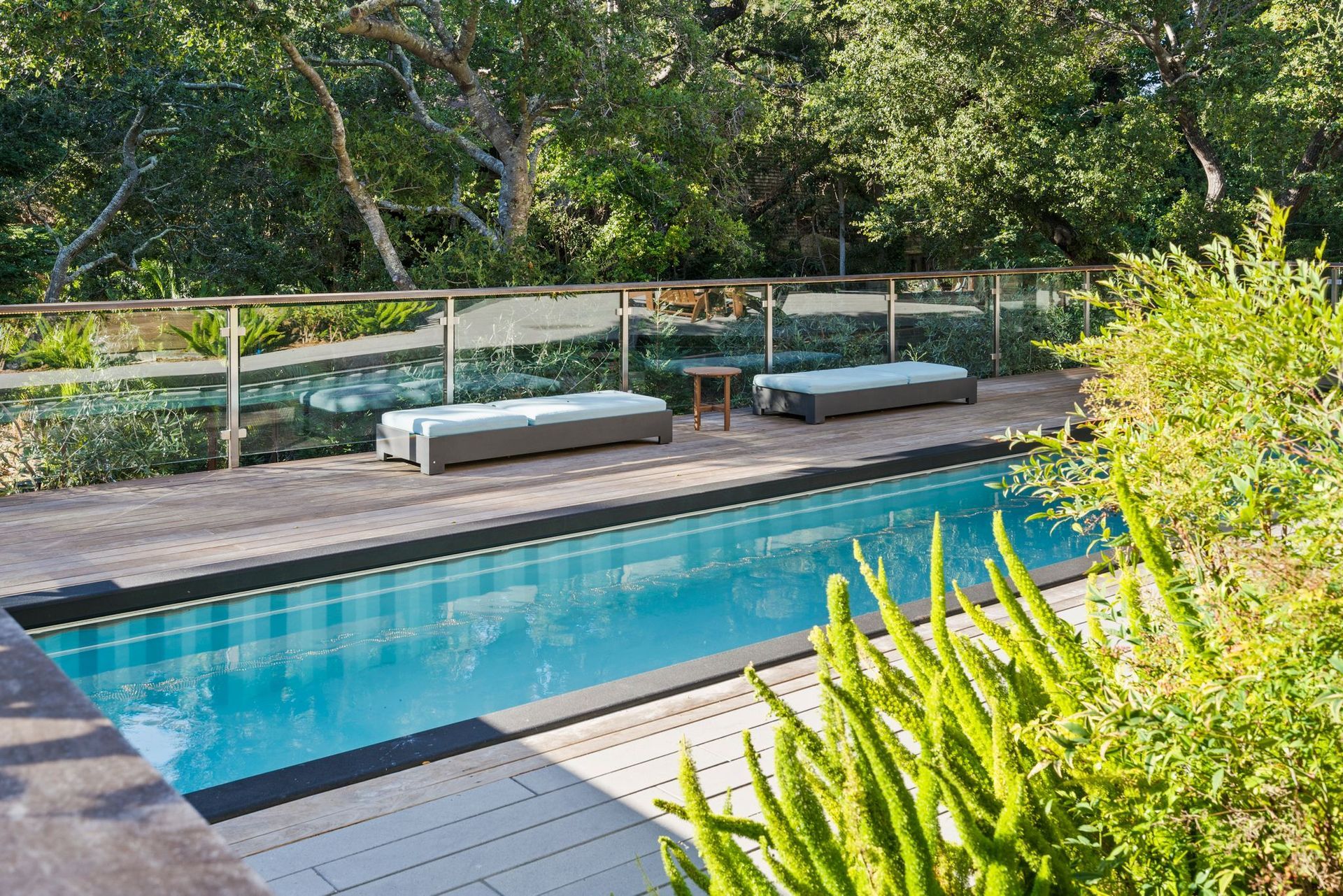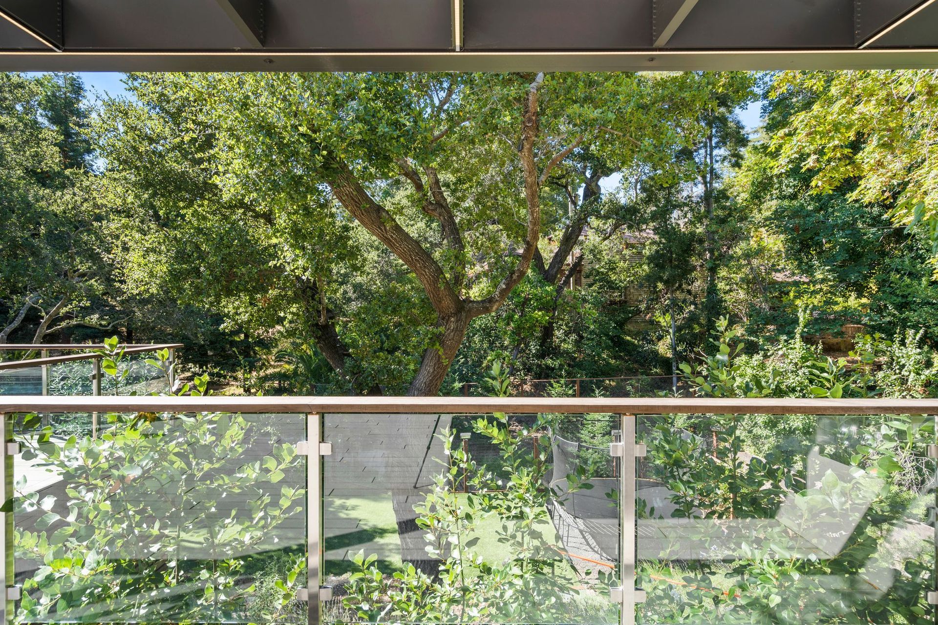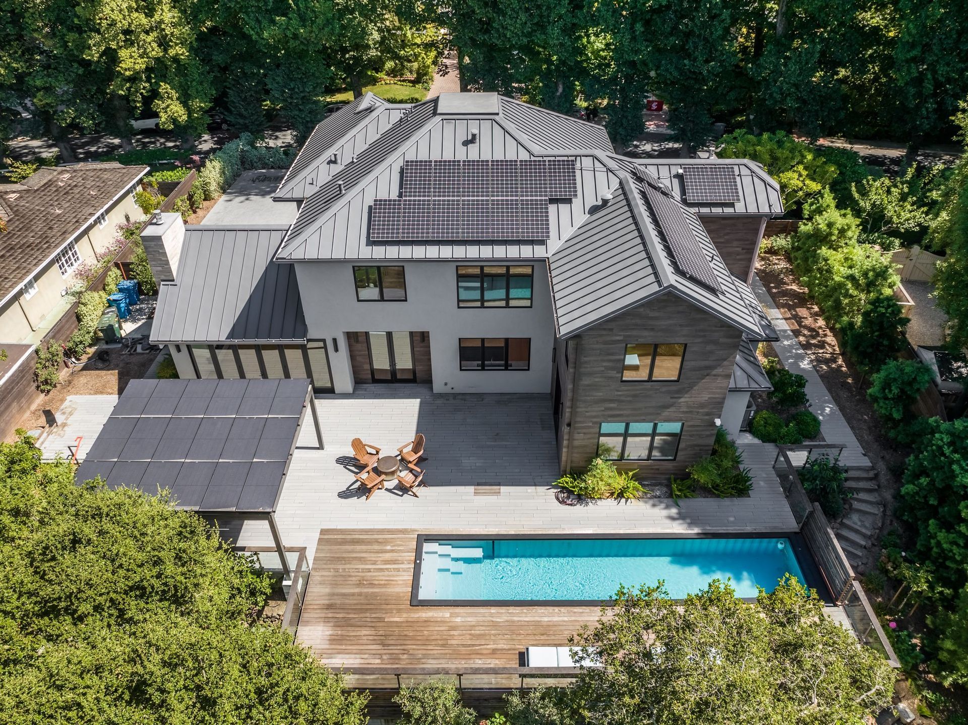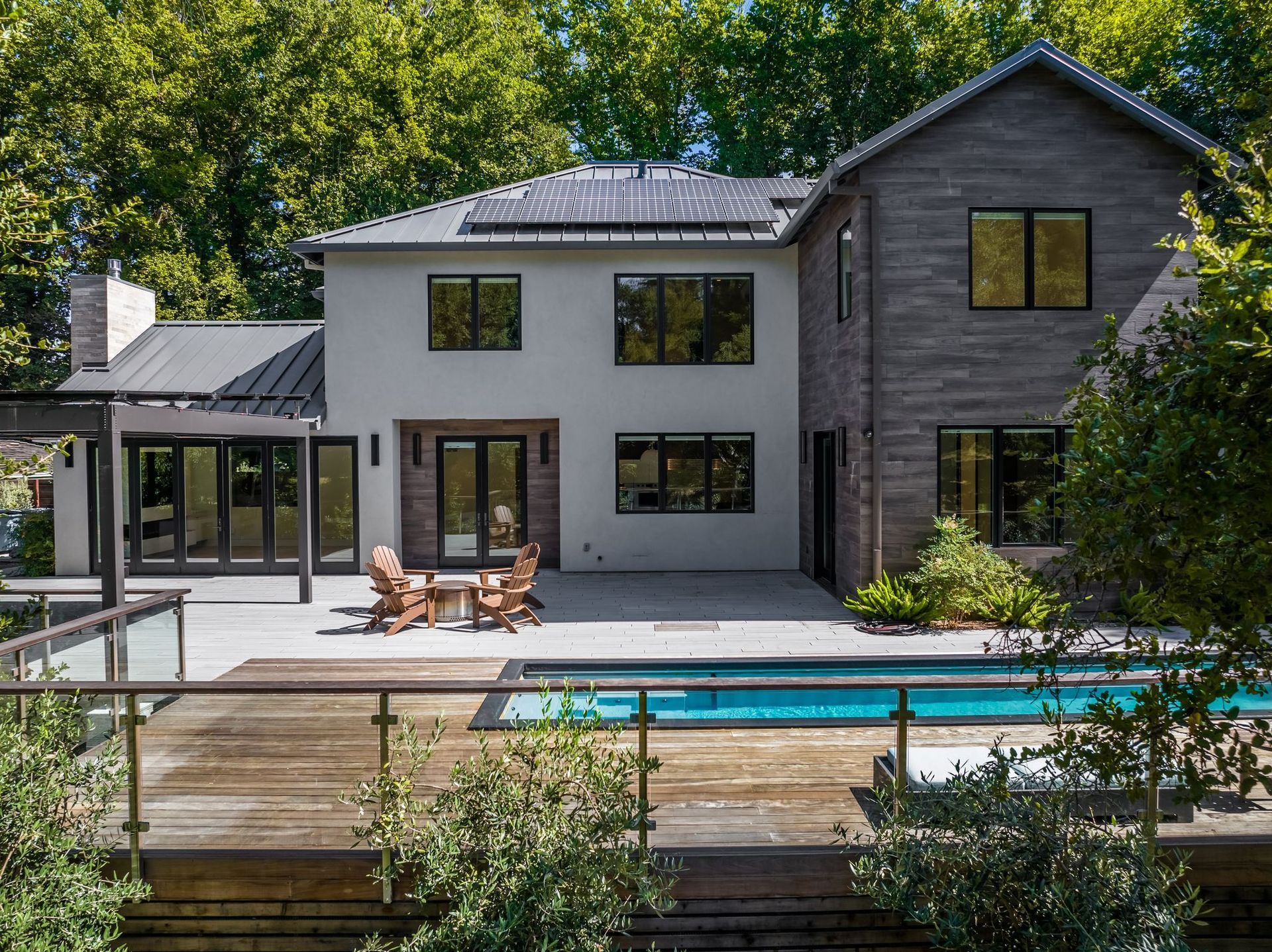 - Two tier rear yard with a full outdoor kitchen, pergola, fire pit area, pool, and on the lower terrace your very own volleyball court and trampoline.