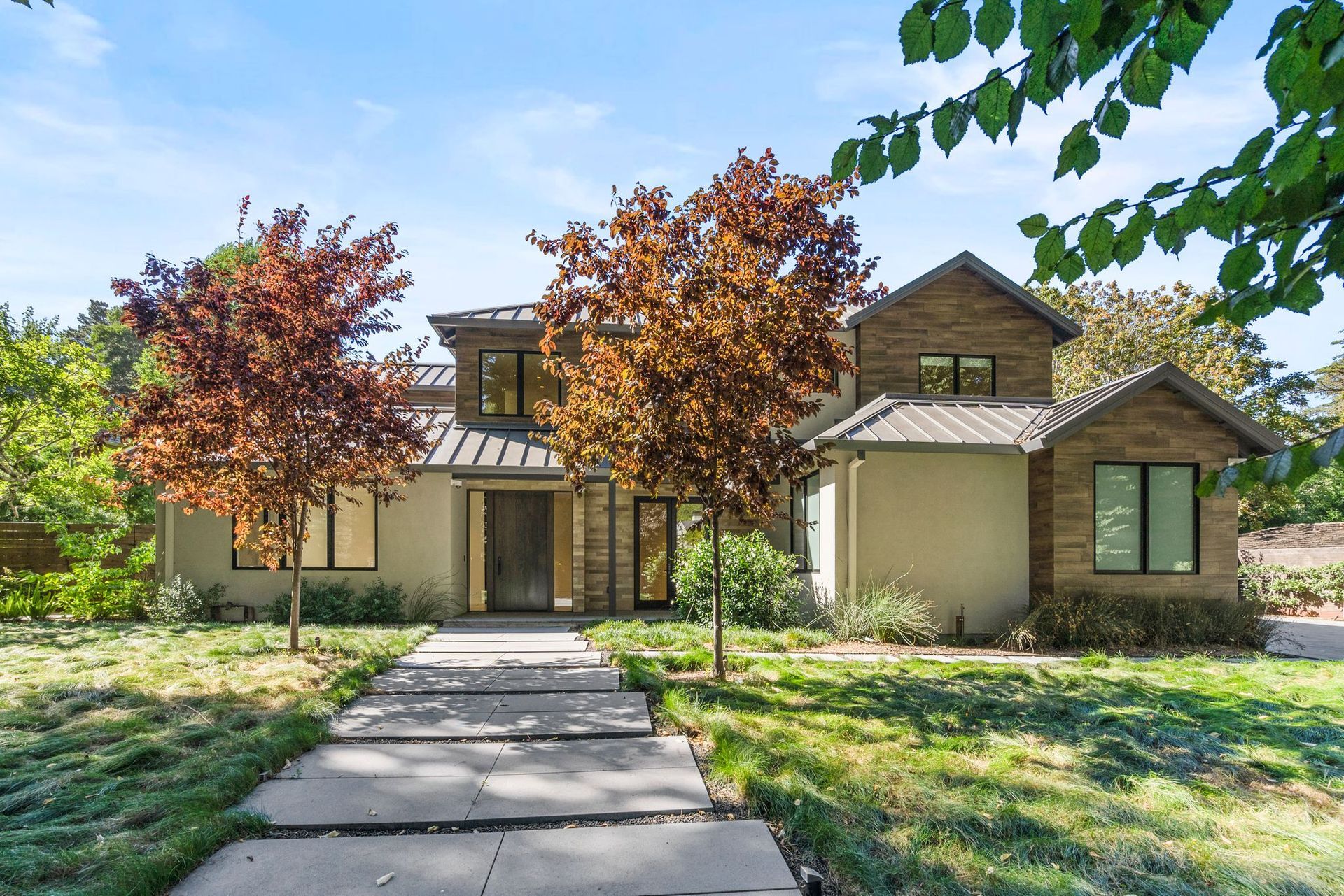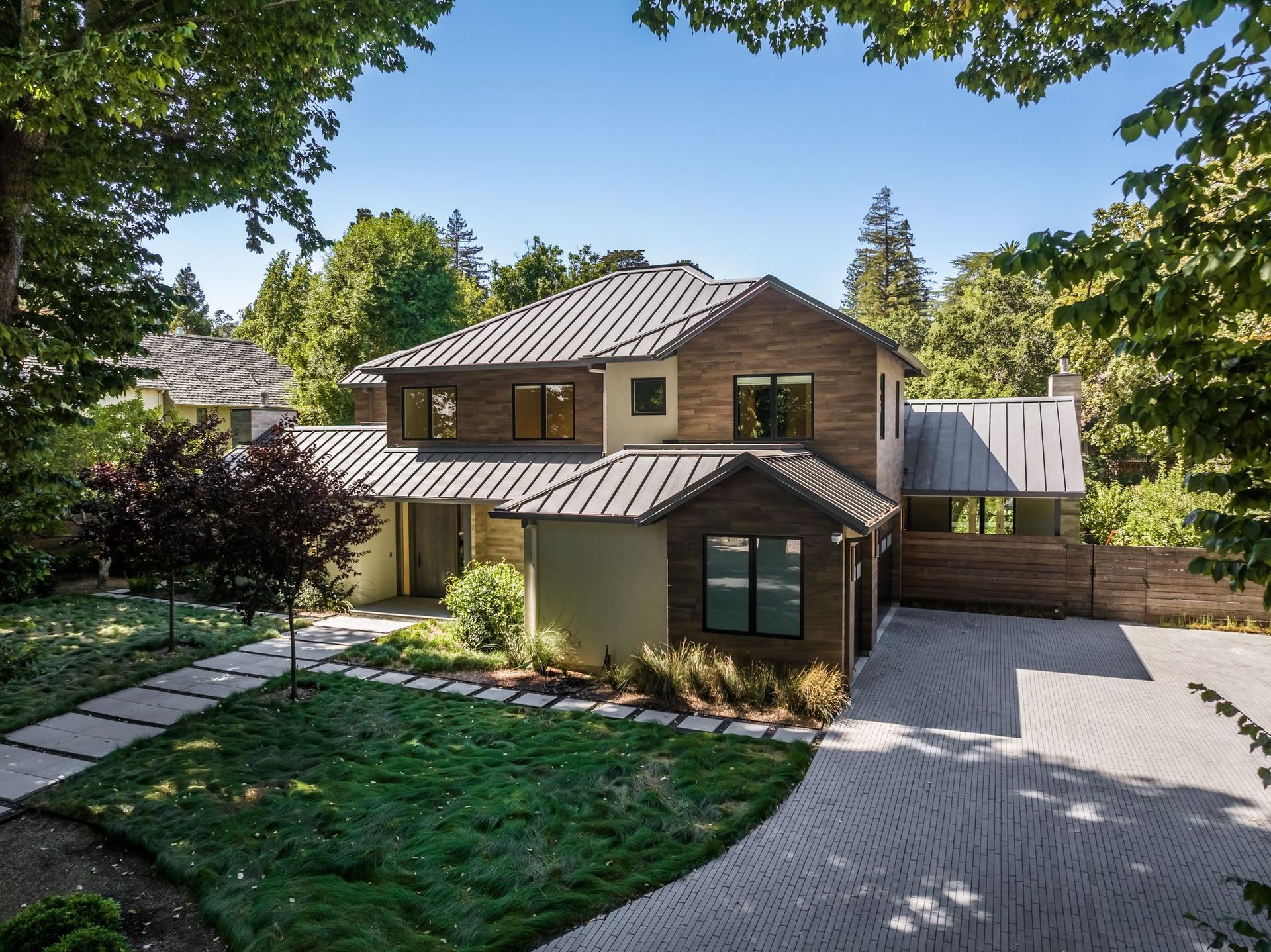 - Tucked into a lush, tree-lined road in the Skyfarm neighborhood of Hillsborough, this custom-built modern residence conveys understated elegance with designer finishes throughout.