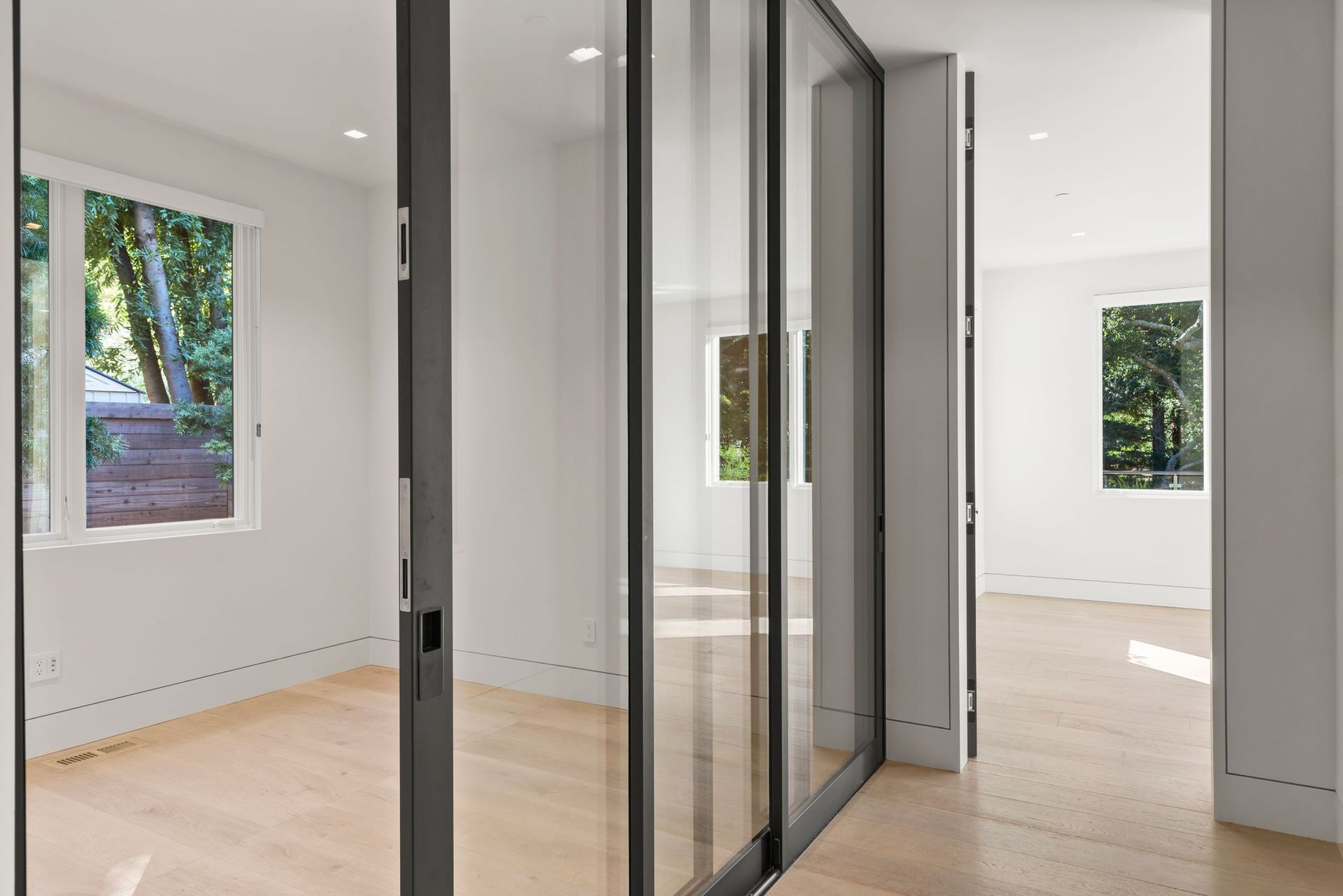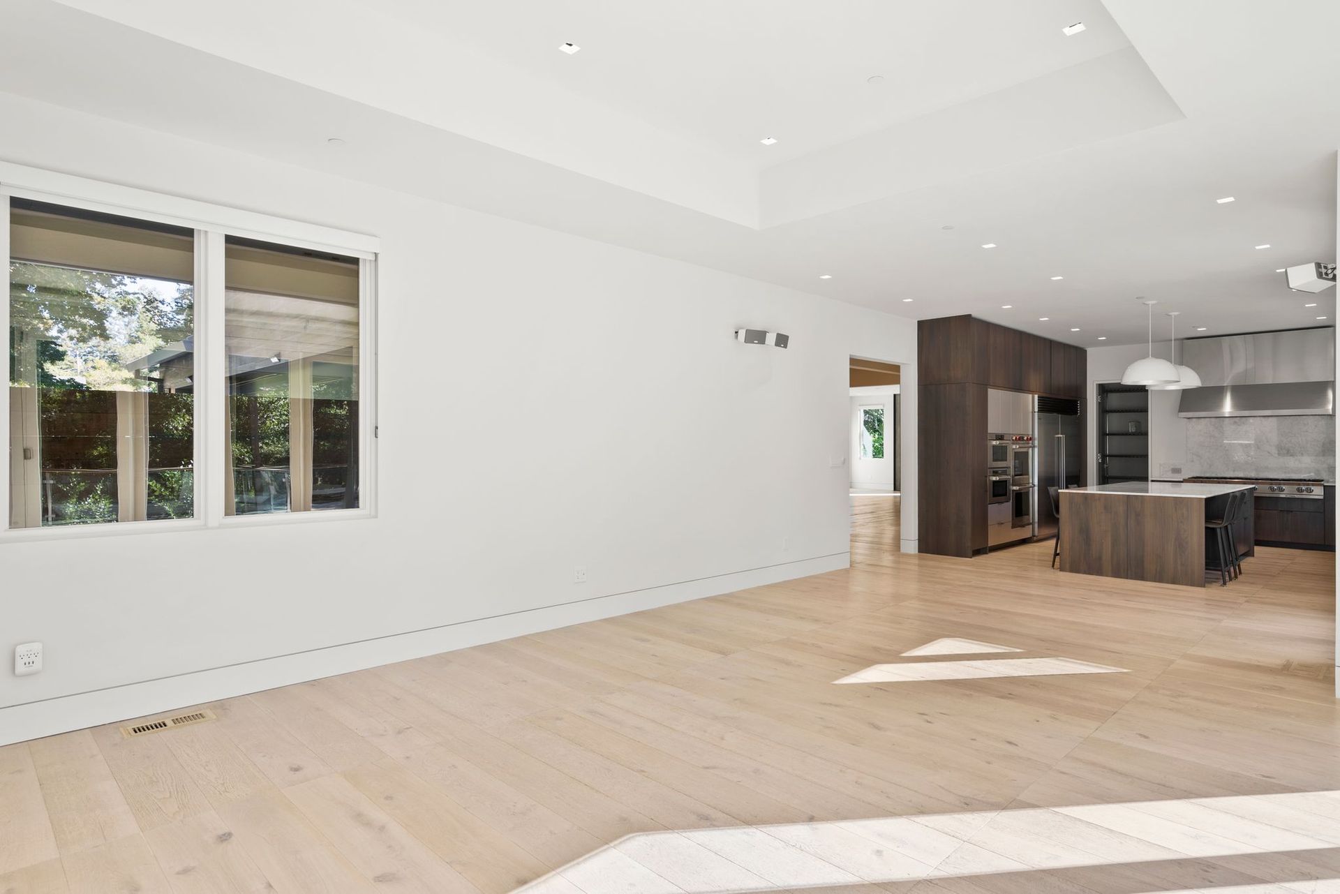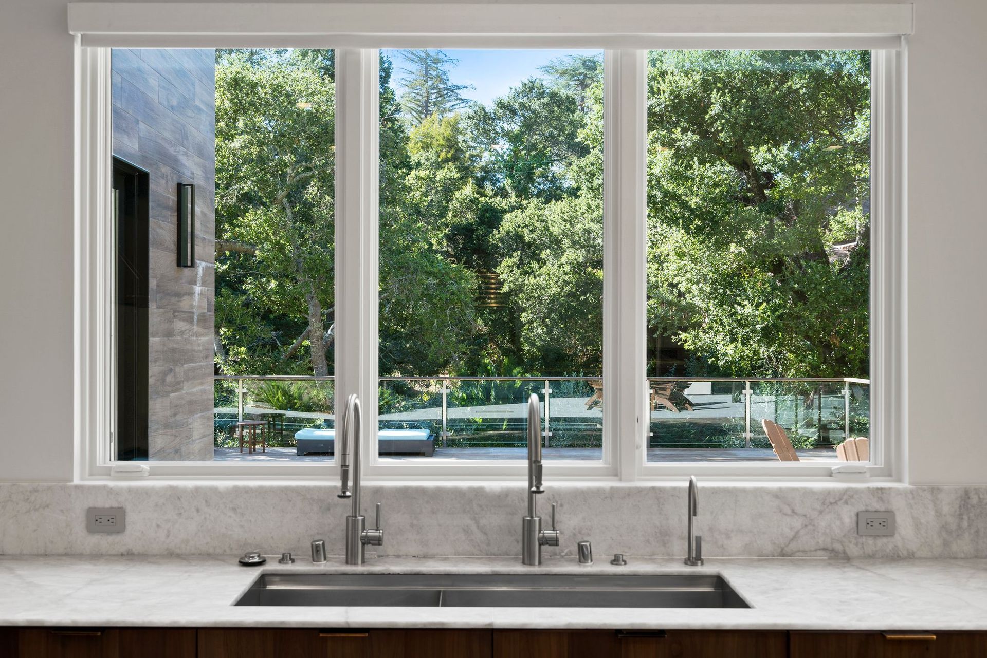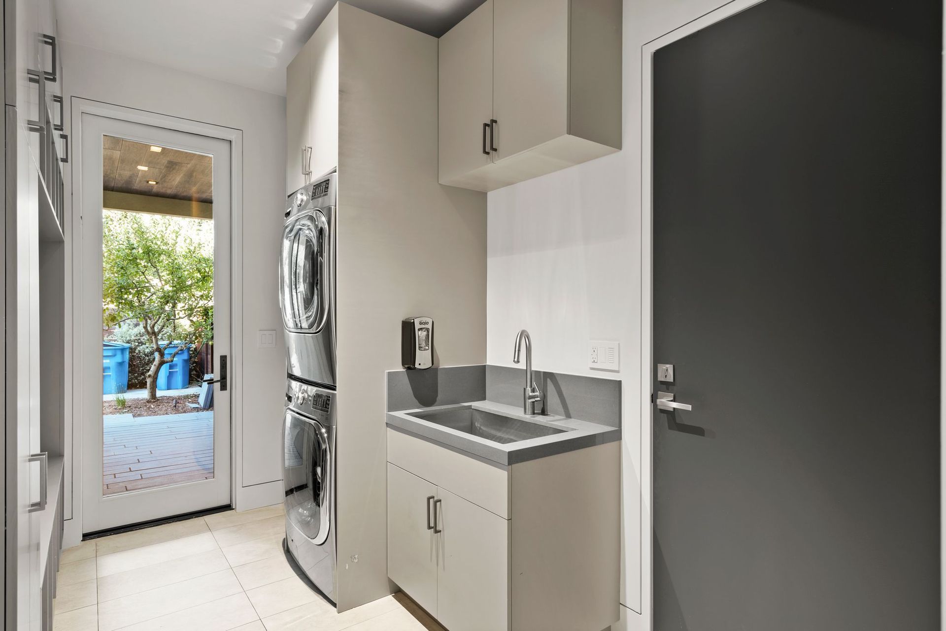 To complete the main level, find an office enclosed by a collapsing glass wall near a guest bedroom with an ensuite and access to the deck. Near the kitchen and secondary living space, access to a laundry room with bench and ample built-ins provides access to the backyard and the three-car garage with more storage space.