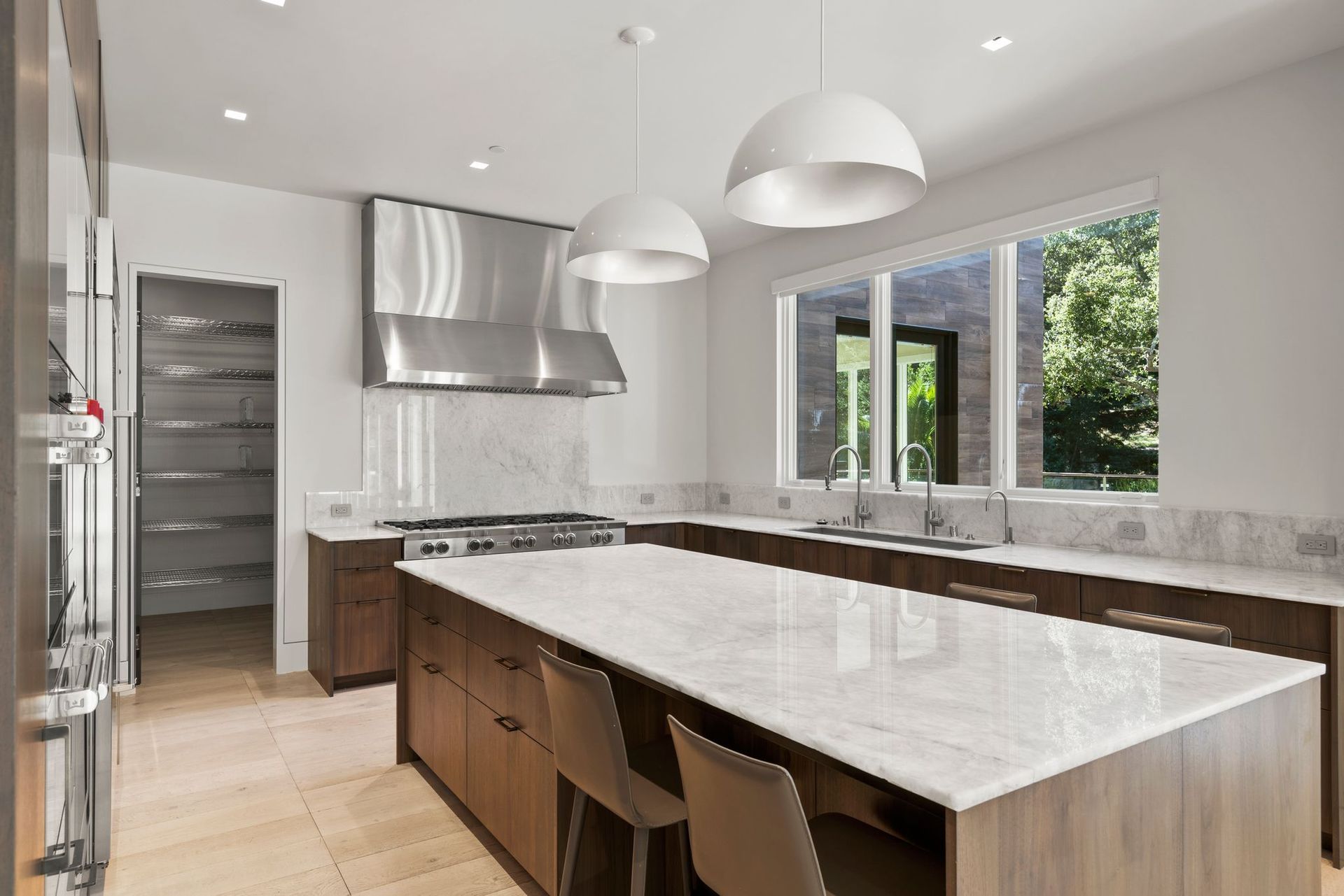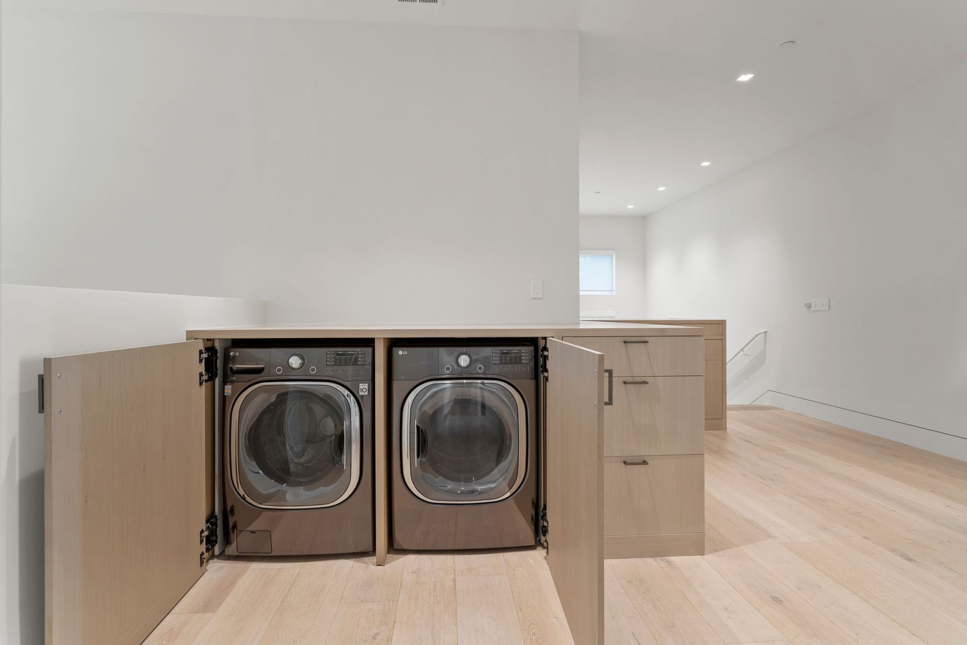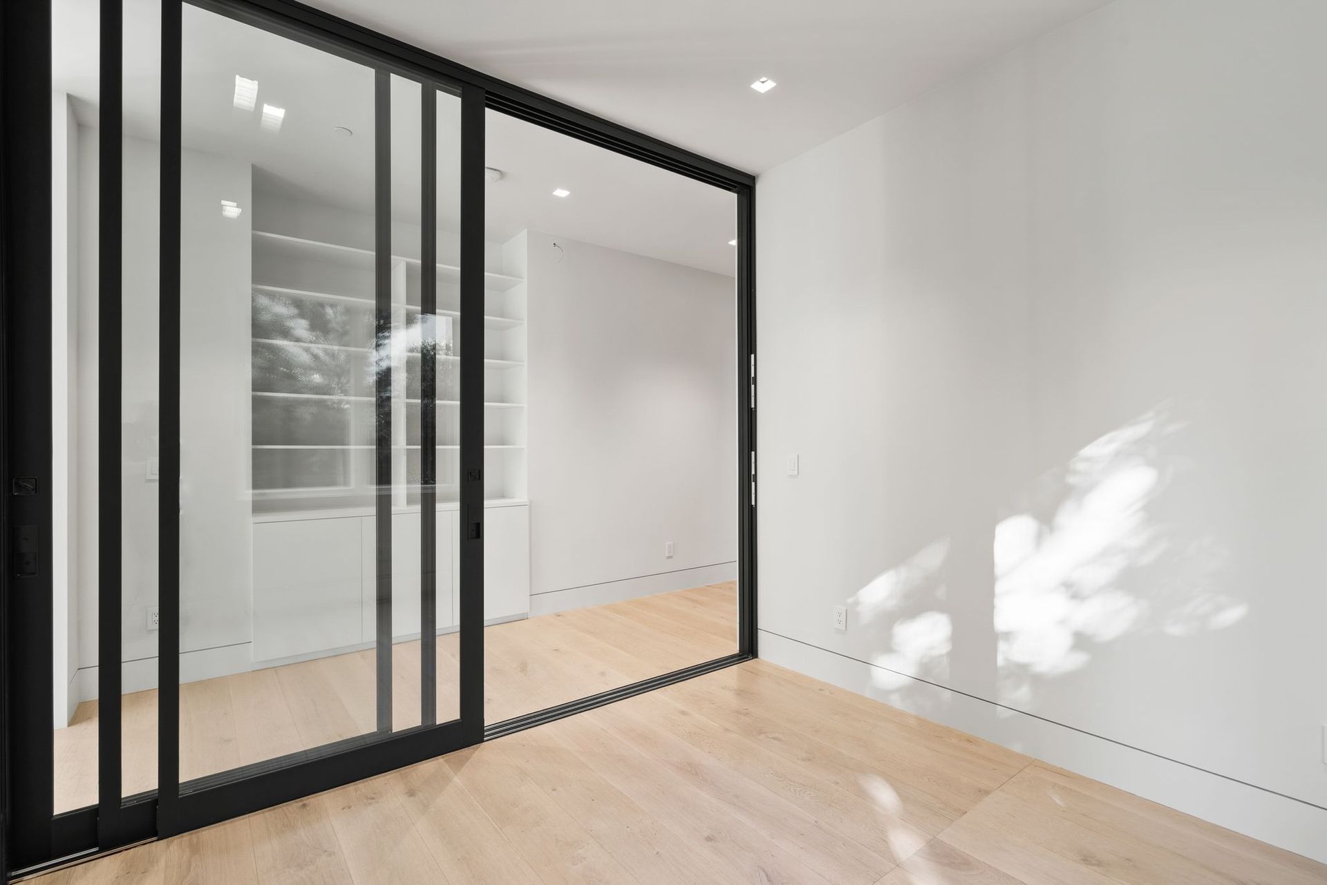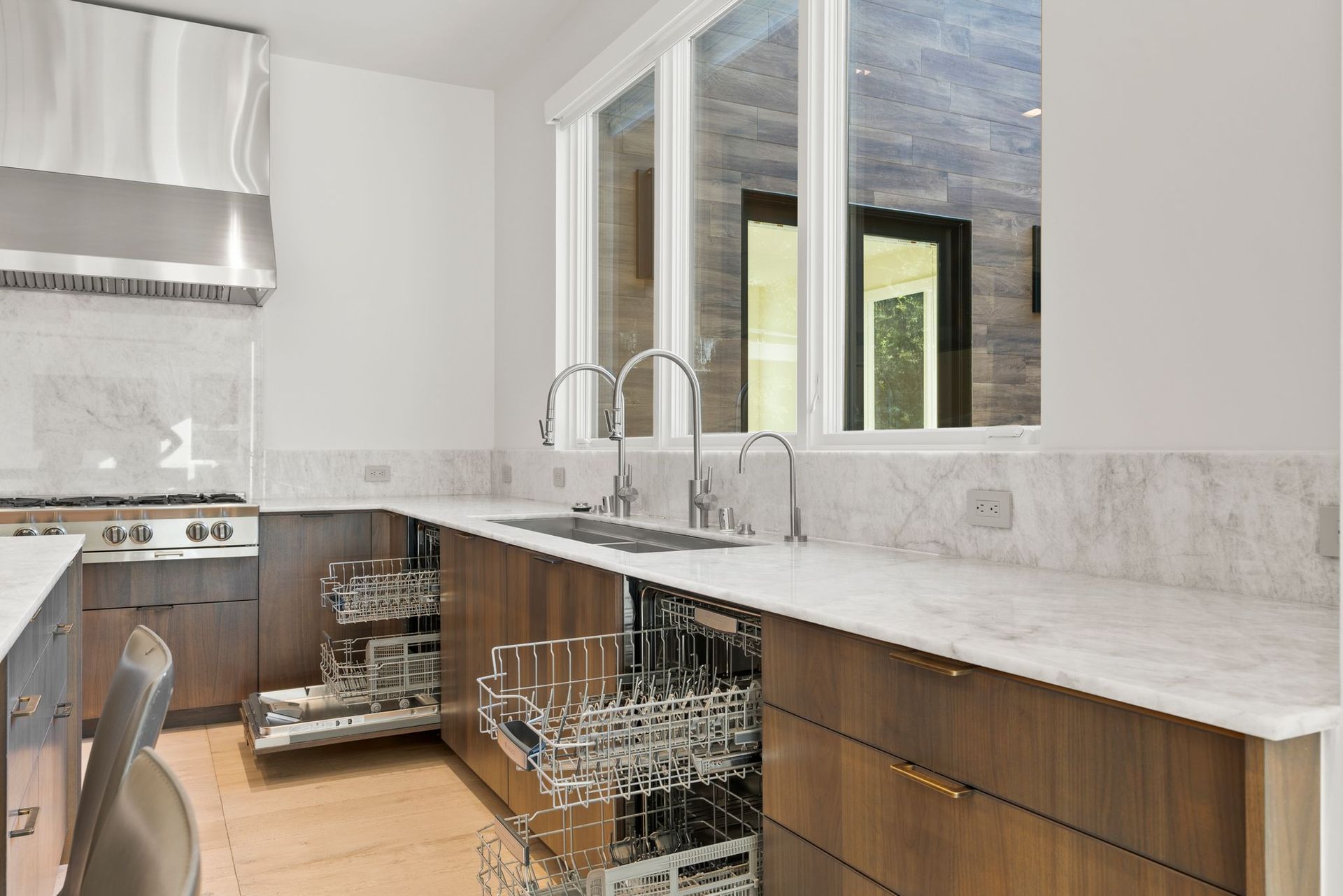 To complete the main level, find an office enclosed by a collapsing glass wall near a guest bedroom with an ensuite and access to the deck. Near the kitchen and secondary living space, access to a laundry room with bench and ample built-ins provides access to the backyard and the three-car garage with more storage space.