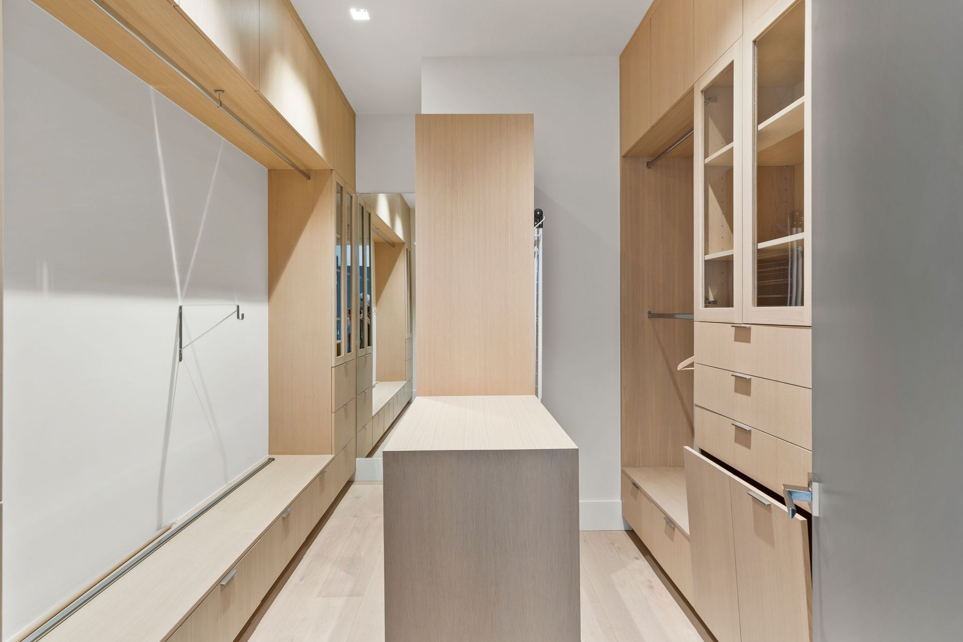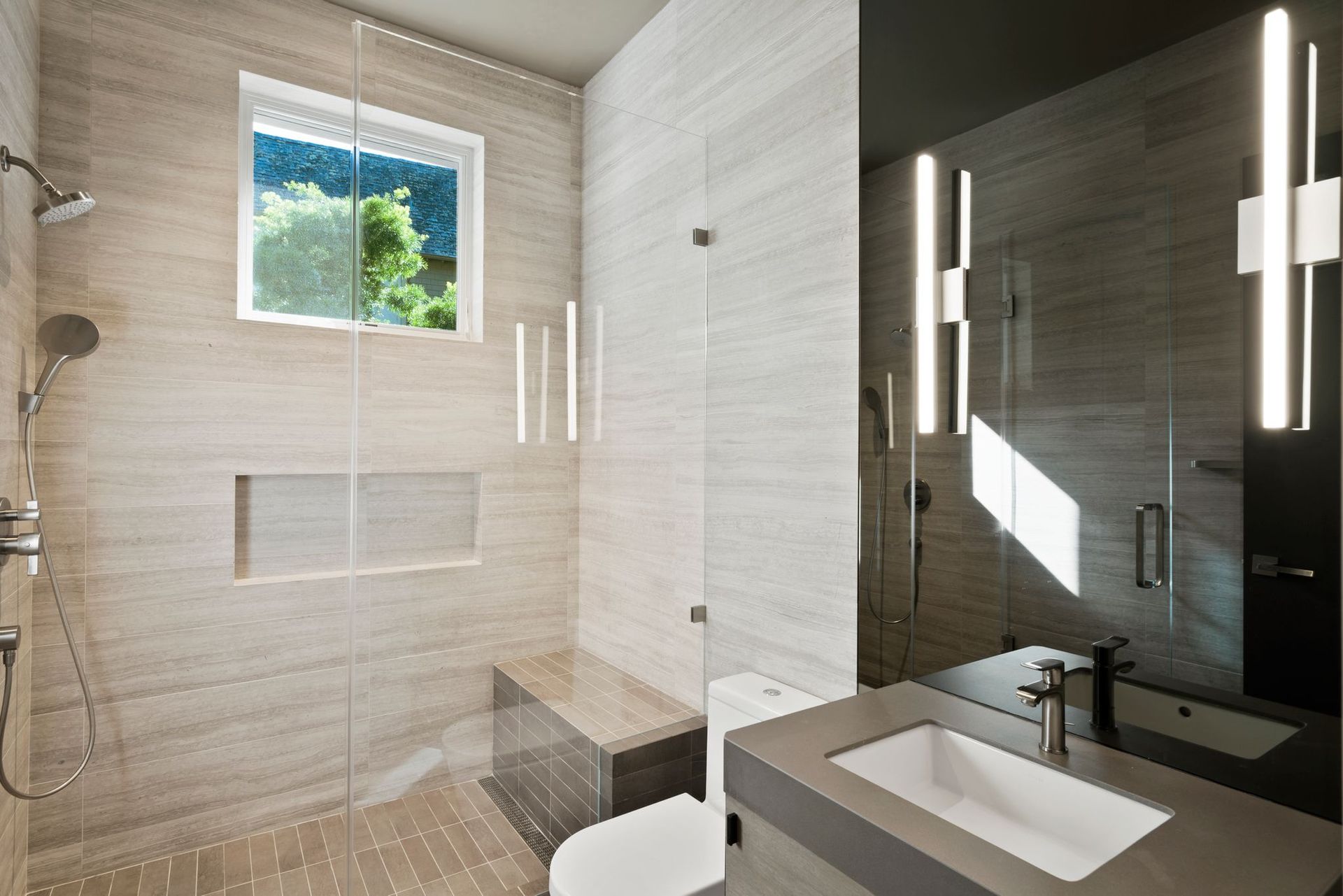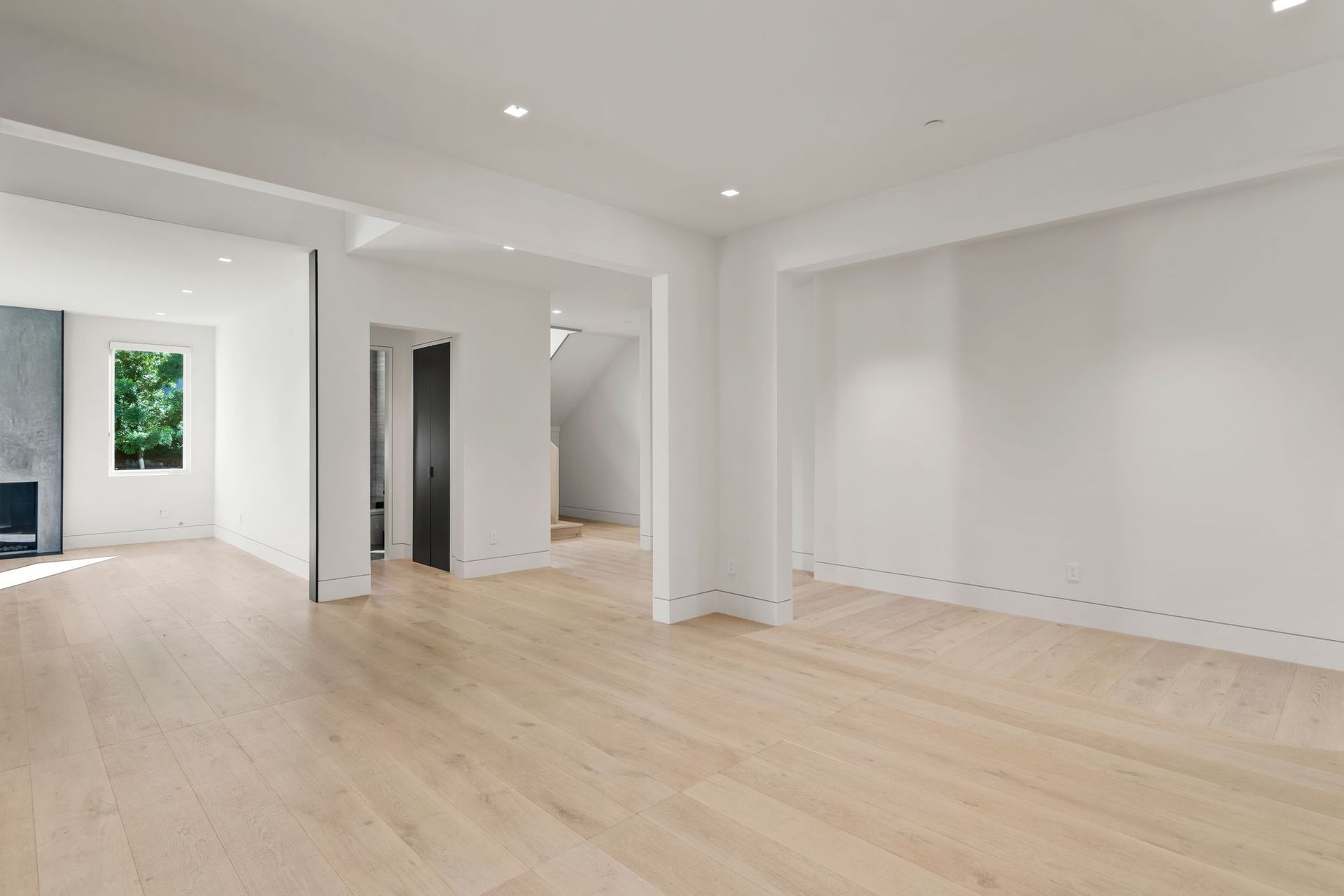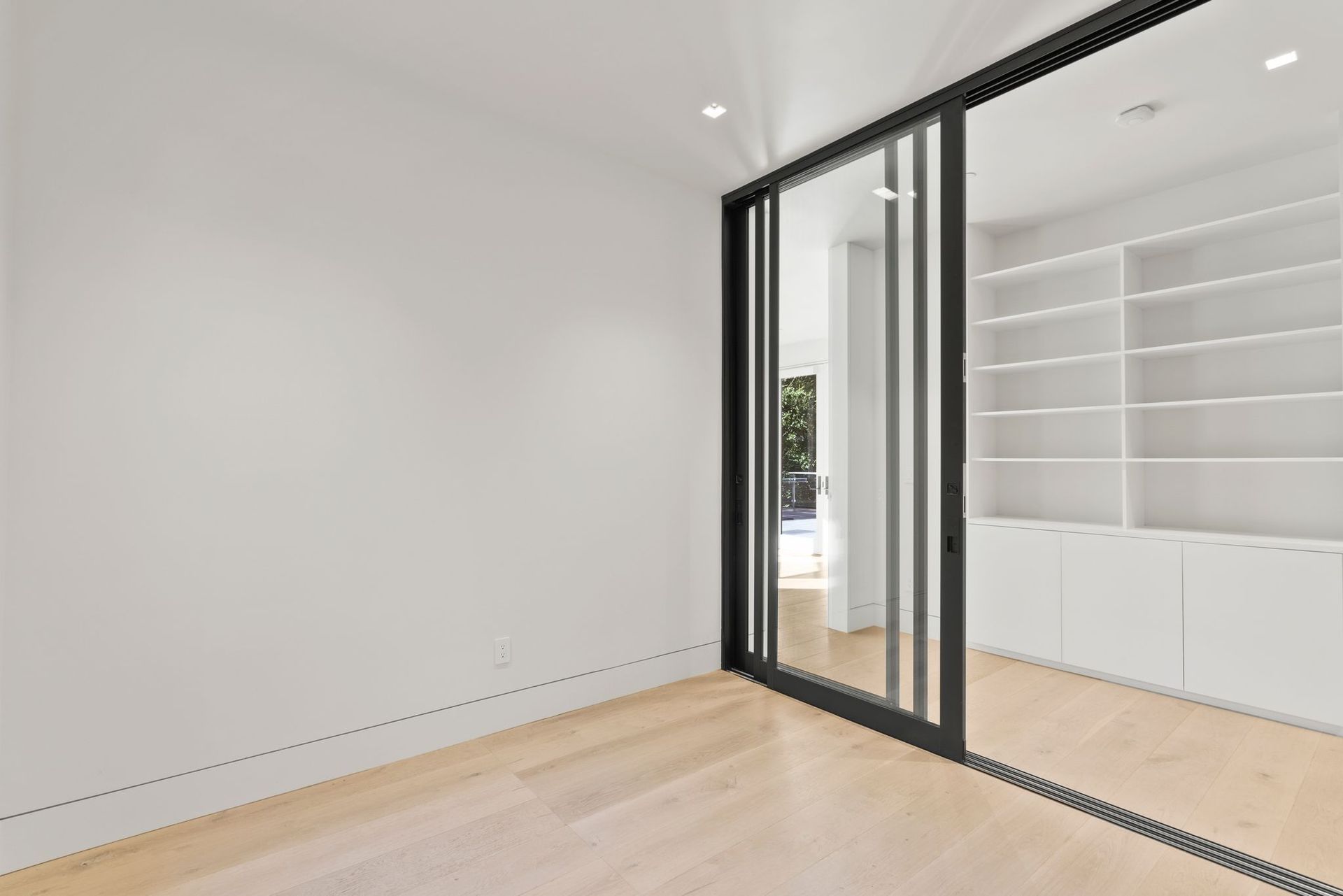 To complete the main level, find an office enclosed by a collapsing glass wall near a guest bedroom with an ensuite and access to the deck. Near the kitchen and secondary living space, access to a laundry room with bench and ample built-ins provides access to the backyard and the three-car garage with more storage space.