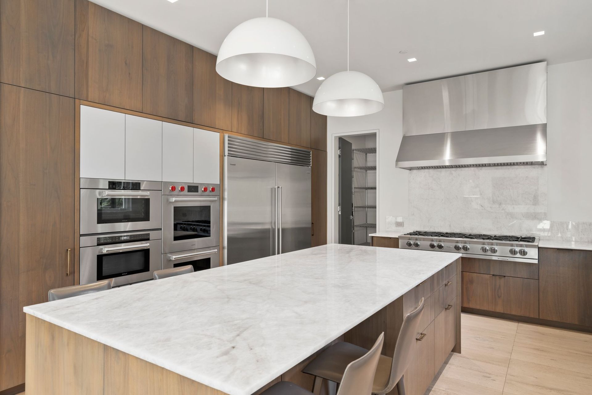 - Sleek, custom chef's kitchen with 10 burners range, two dishwashers, 36' sub-zero refrigerator and sub-zero freezer, and dual Wolf microwave and convection ovens.
