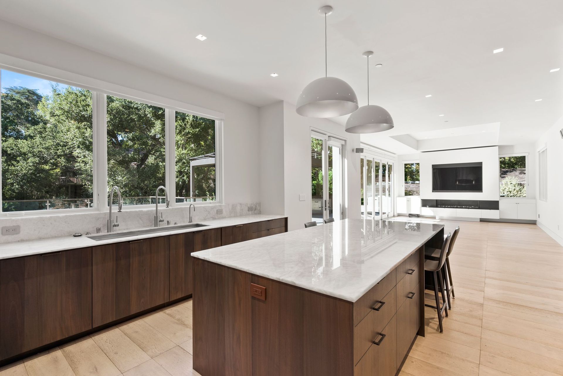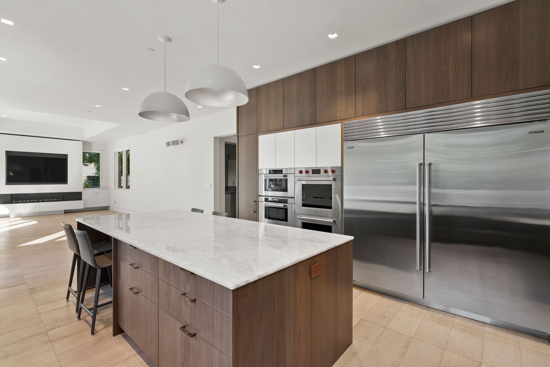 A sprawling secondary living area with a gorgeous tray ceiling and modern fireplace meets a sleek custom kitchen. Quartzite countertops meld seamlessly with backsplash and warm slab cabinetry, while high-end appliances like a double Wolf Steam Convection ovens, Sub-Zero refrigerator, BlueStar 10-burner range, and two Bosch dishwashers add endless functionality. Bring the outside in with large infinity doors that opens the secondary living space up to an elevated back deck. Host and entertain parties of all sizes with an outdoor kitchen, pergola, fire pit area, and pool. From either side of the upper deck, walk down to the lower tier of the yard with your very own volleyball court and trampoline.