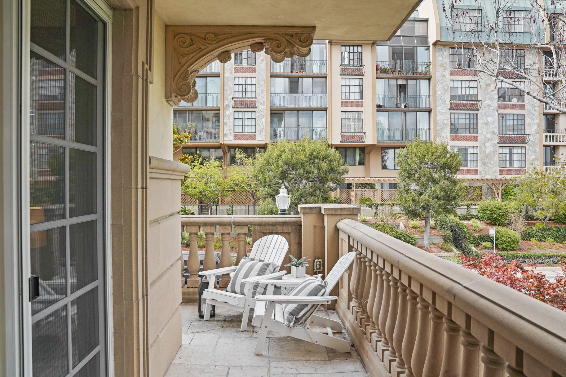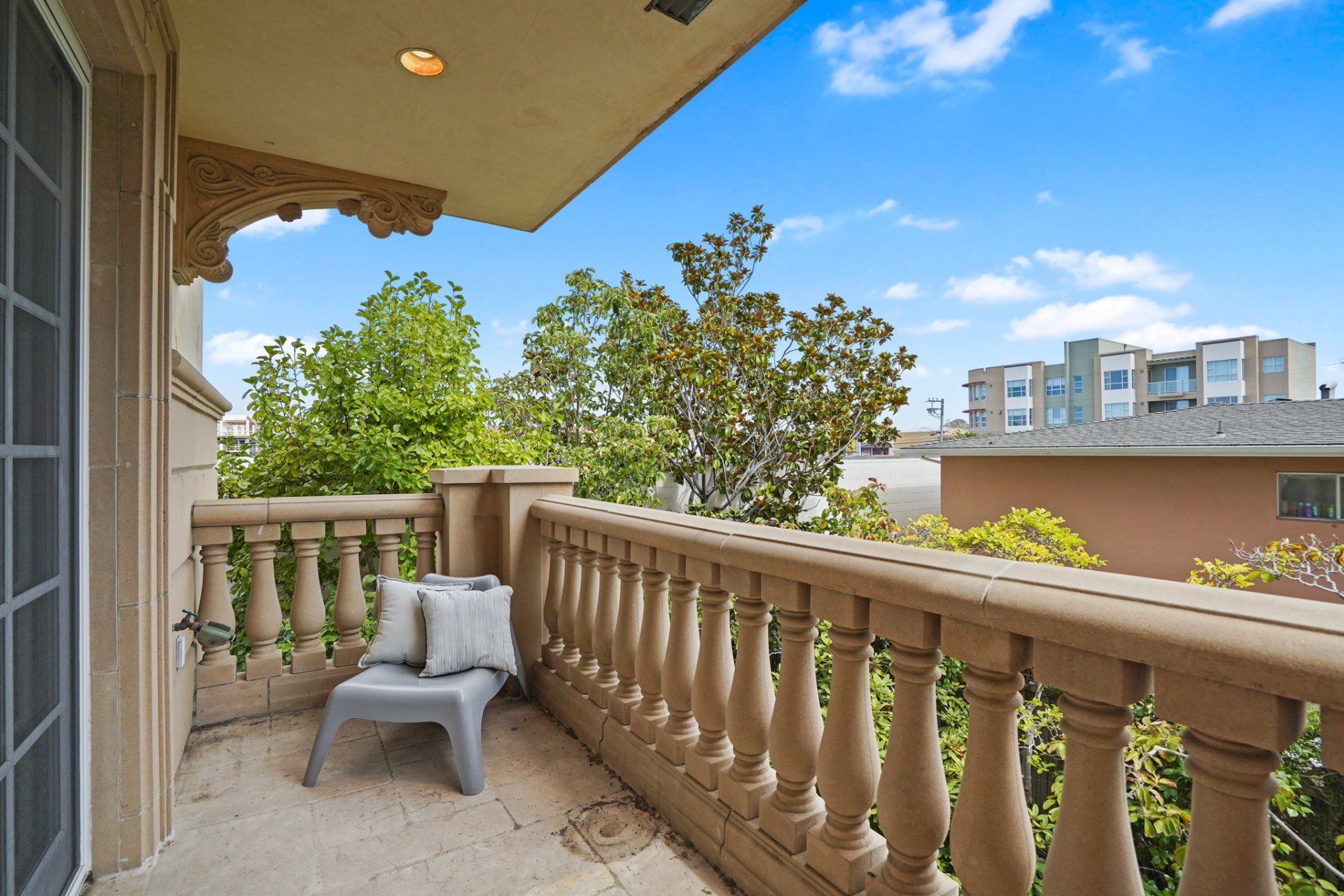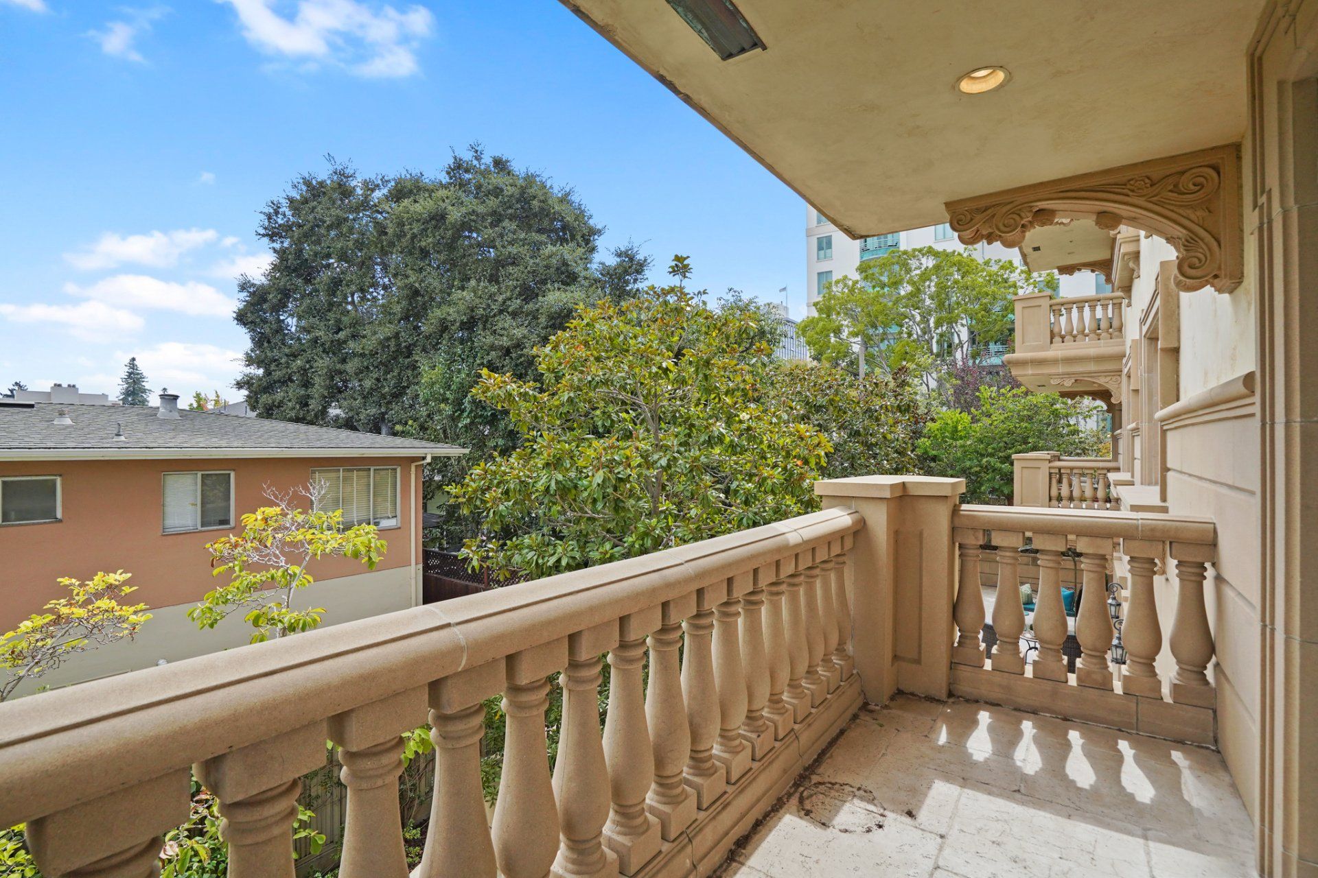 - Two sets of paned, glass sliders open to a semi-private, wrap-around balcony.