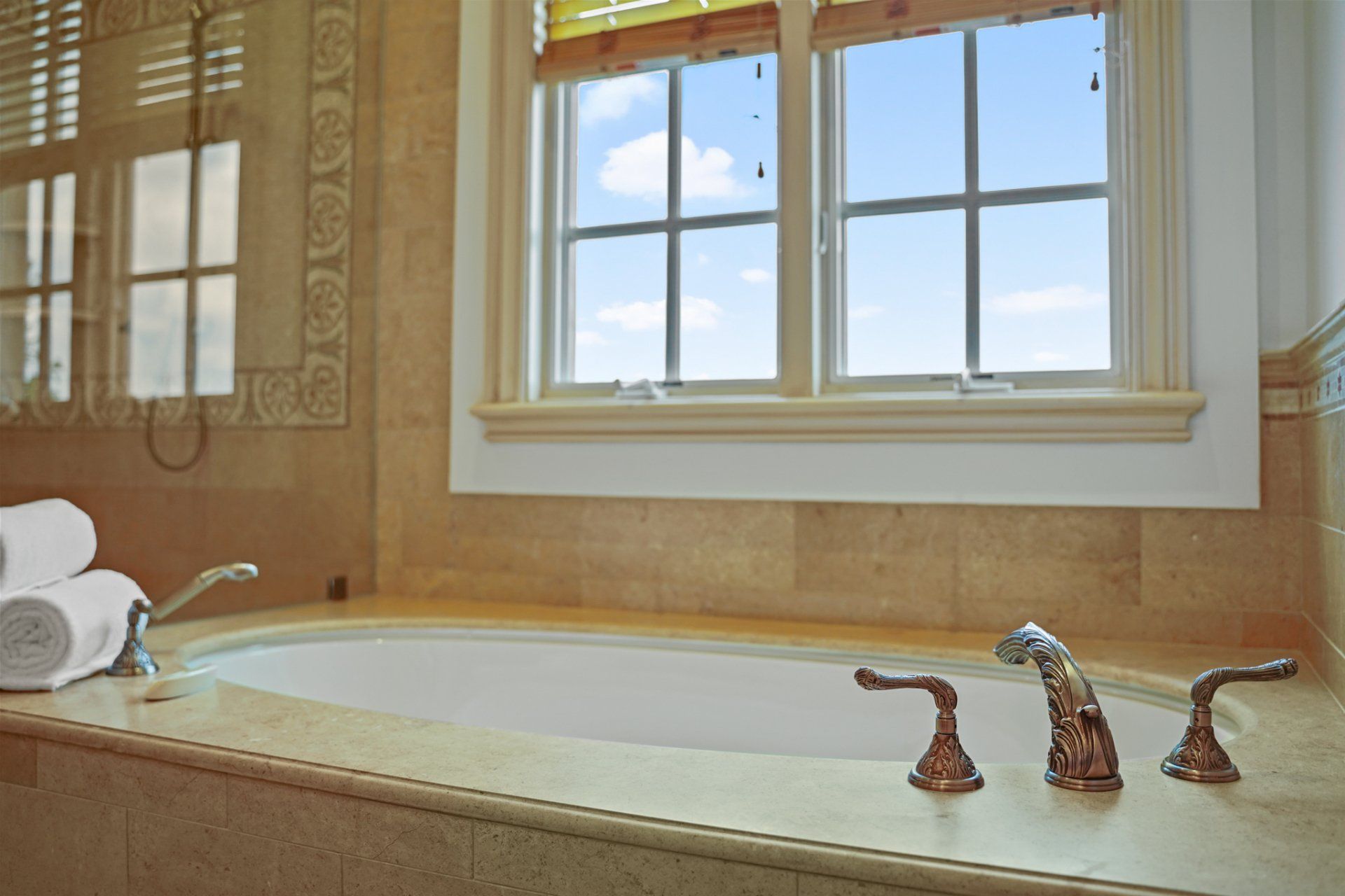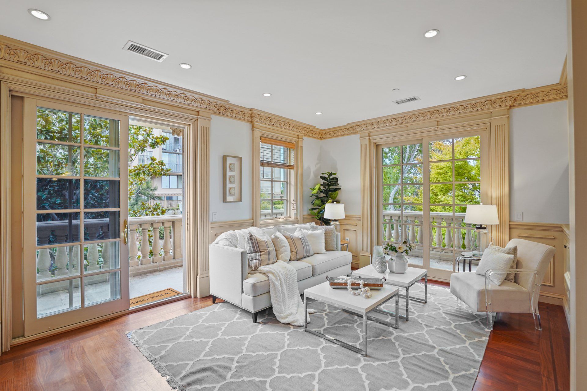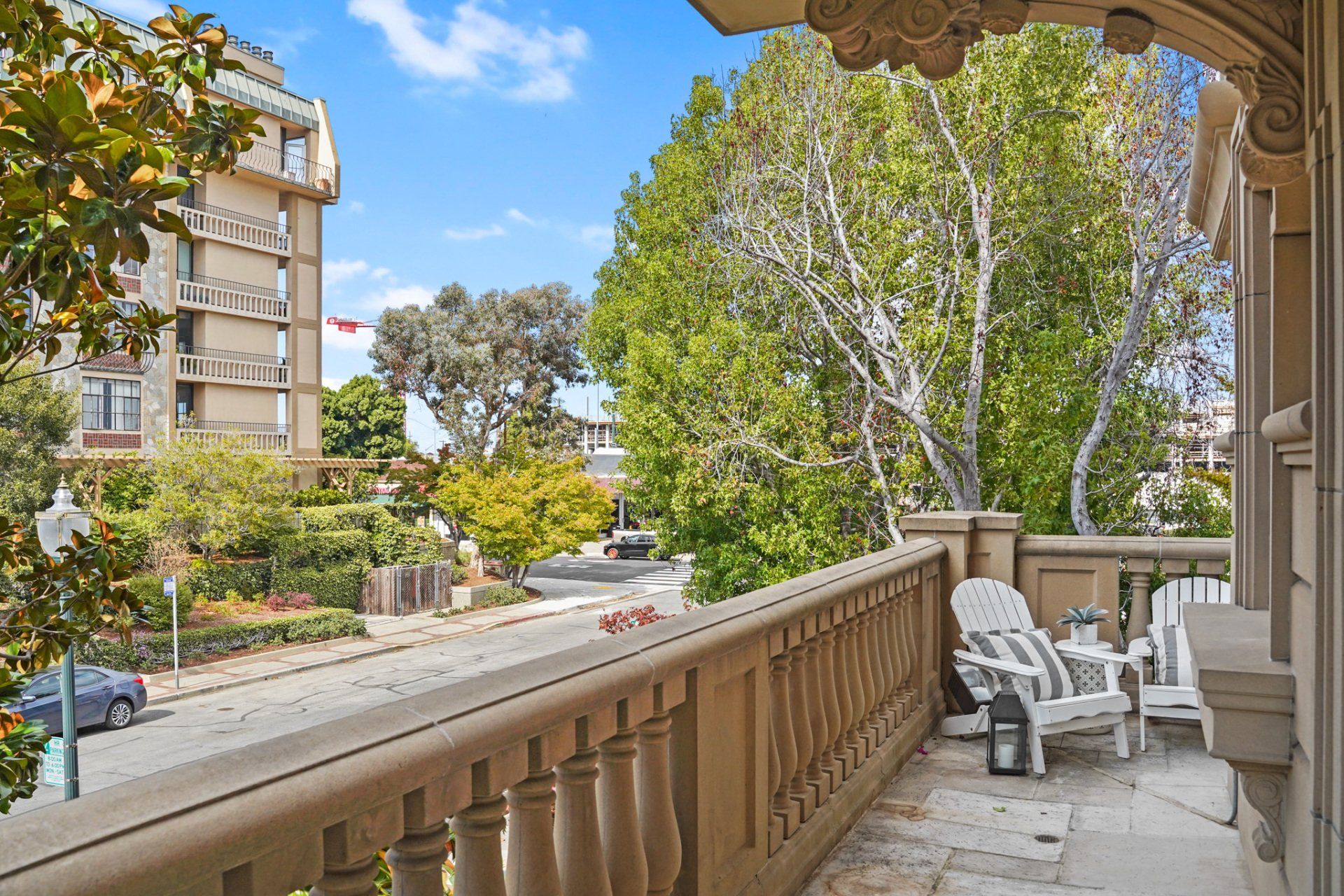- Two sets of paned, glass sliders open to a semi-private, wrap-around balcony.