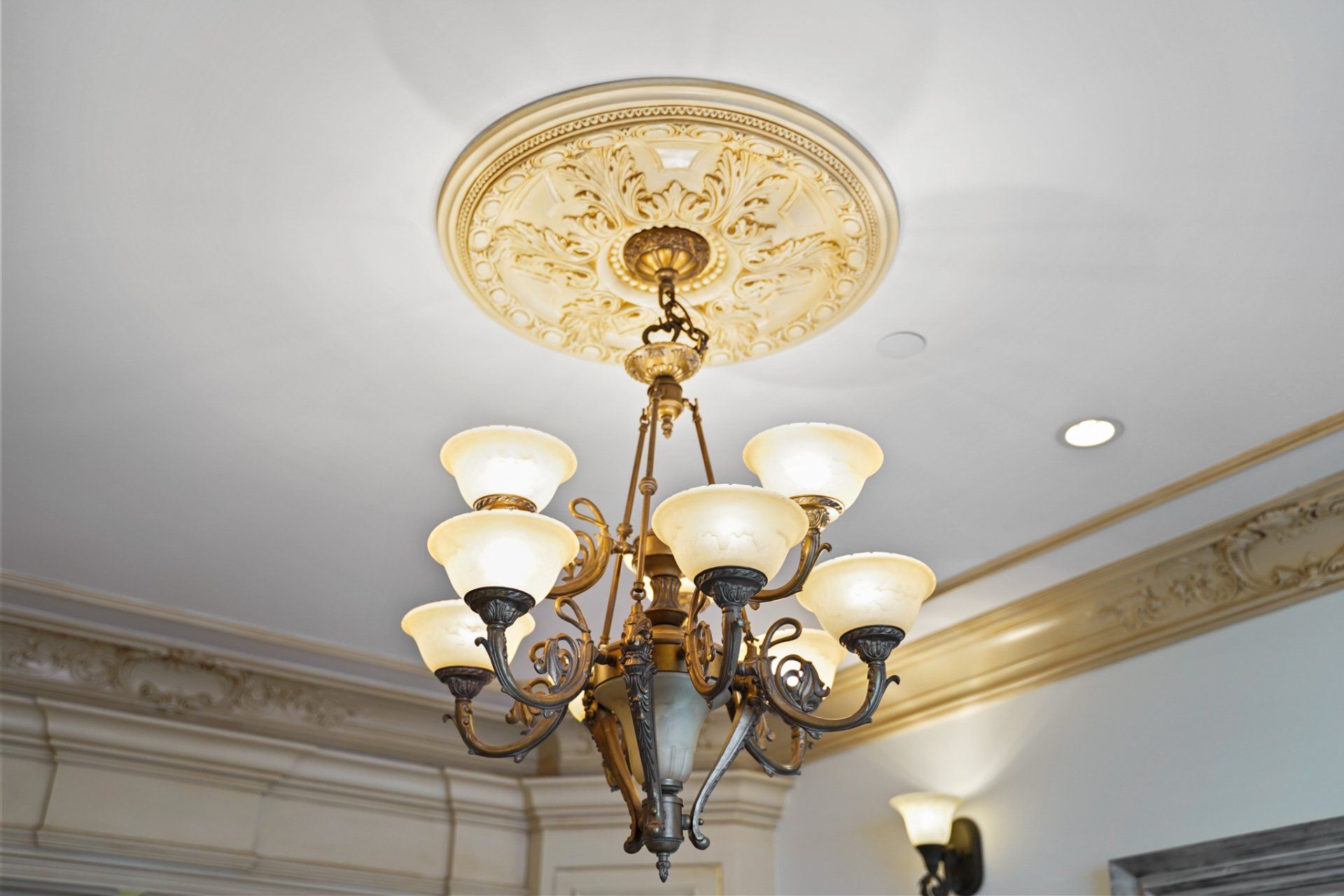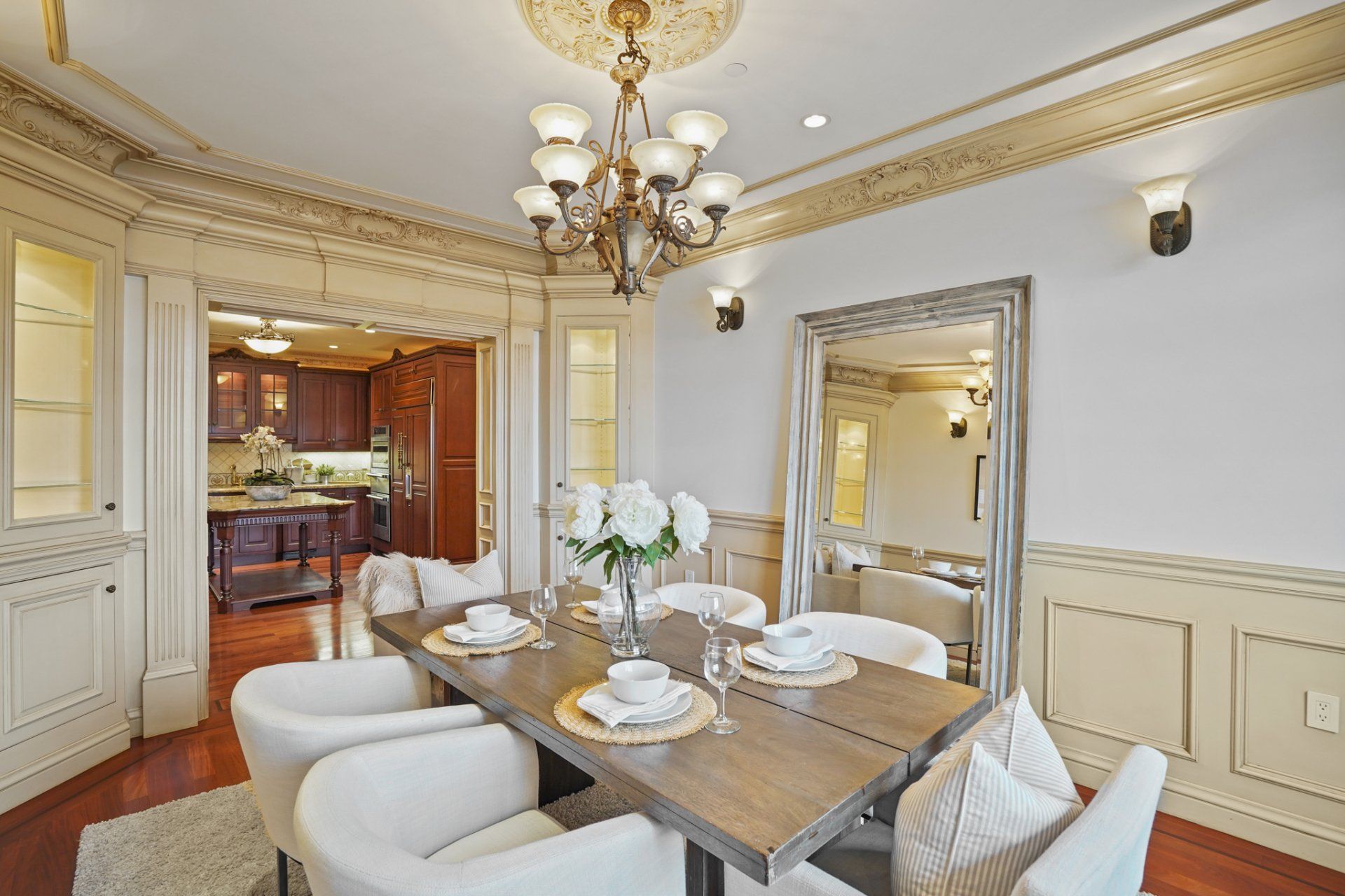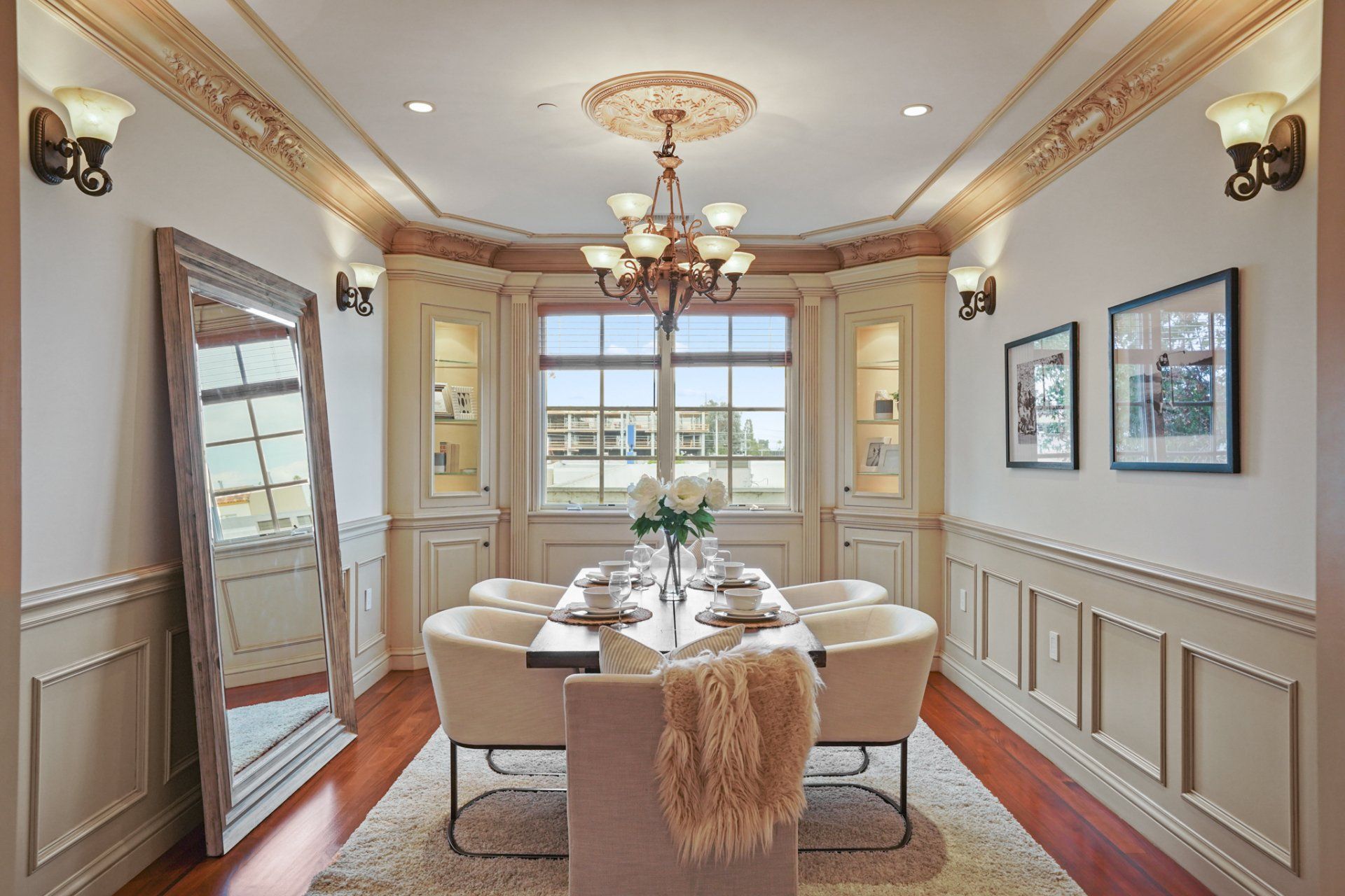 - Formal dining room with built-in curio cabinets, decorative ceiling medallion and glass chandelier, wall sconces and custom millwork.