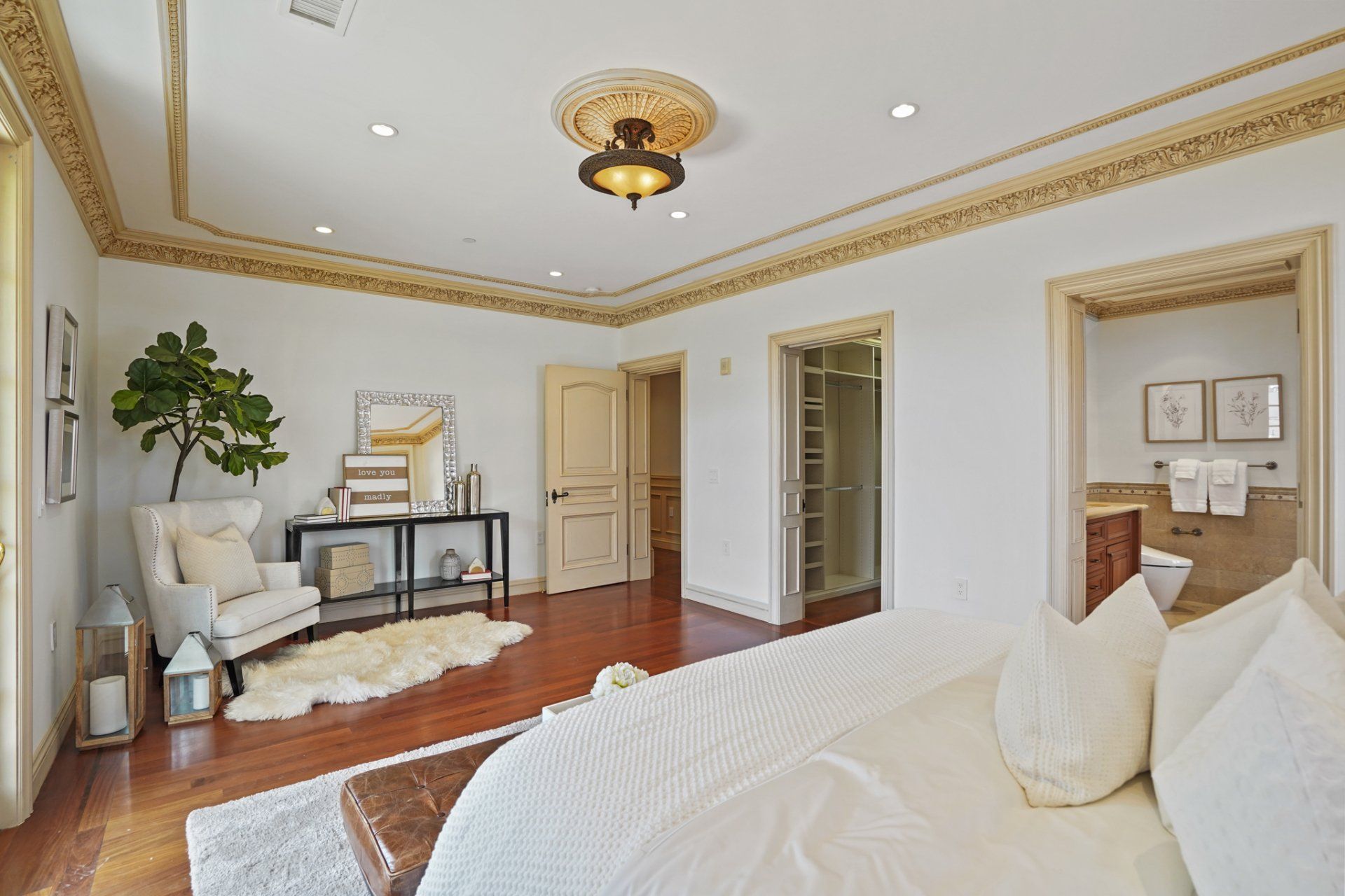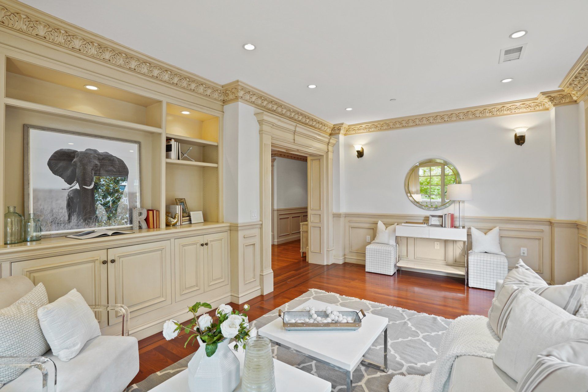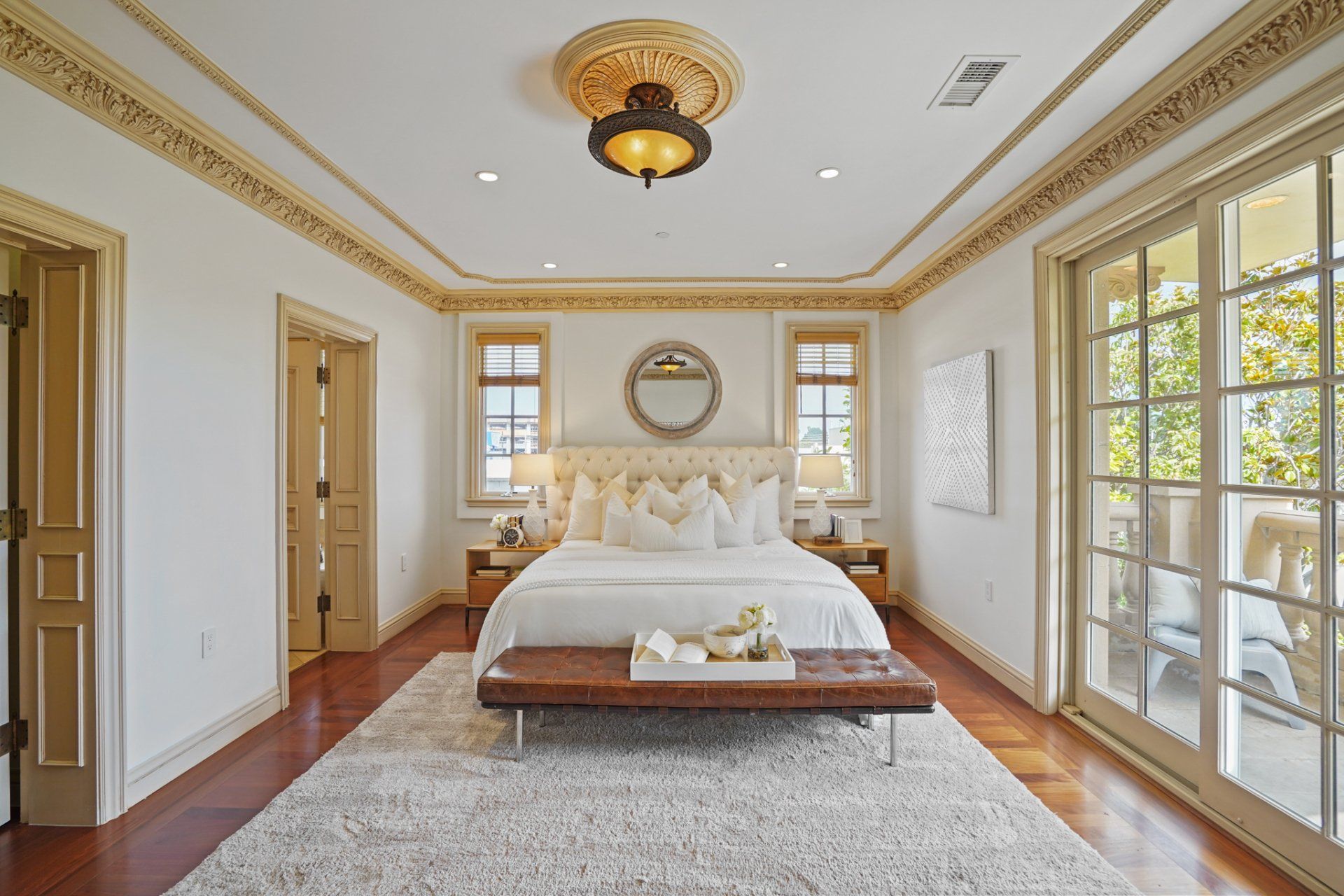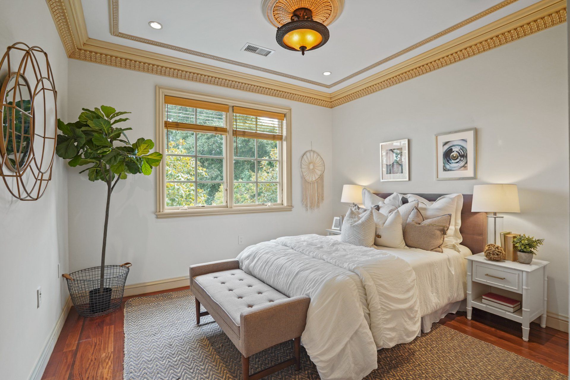 - In residence, find beautiful crown molding, high ceilings, decorative ceiling medallions, and hardwood flooring with dark inlay.