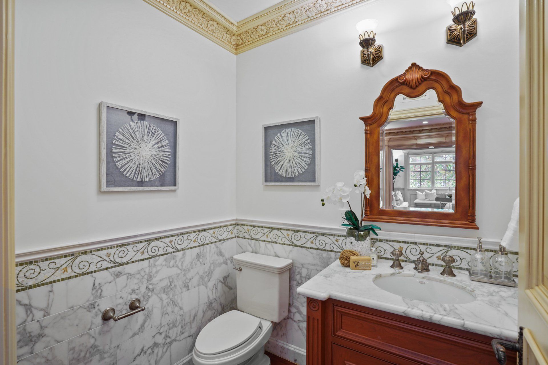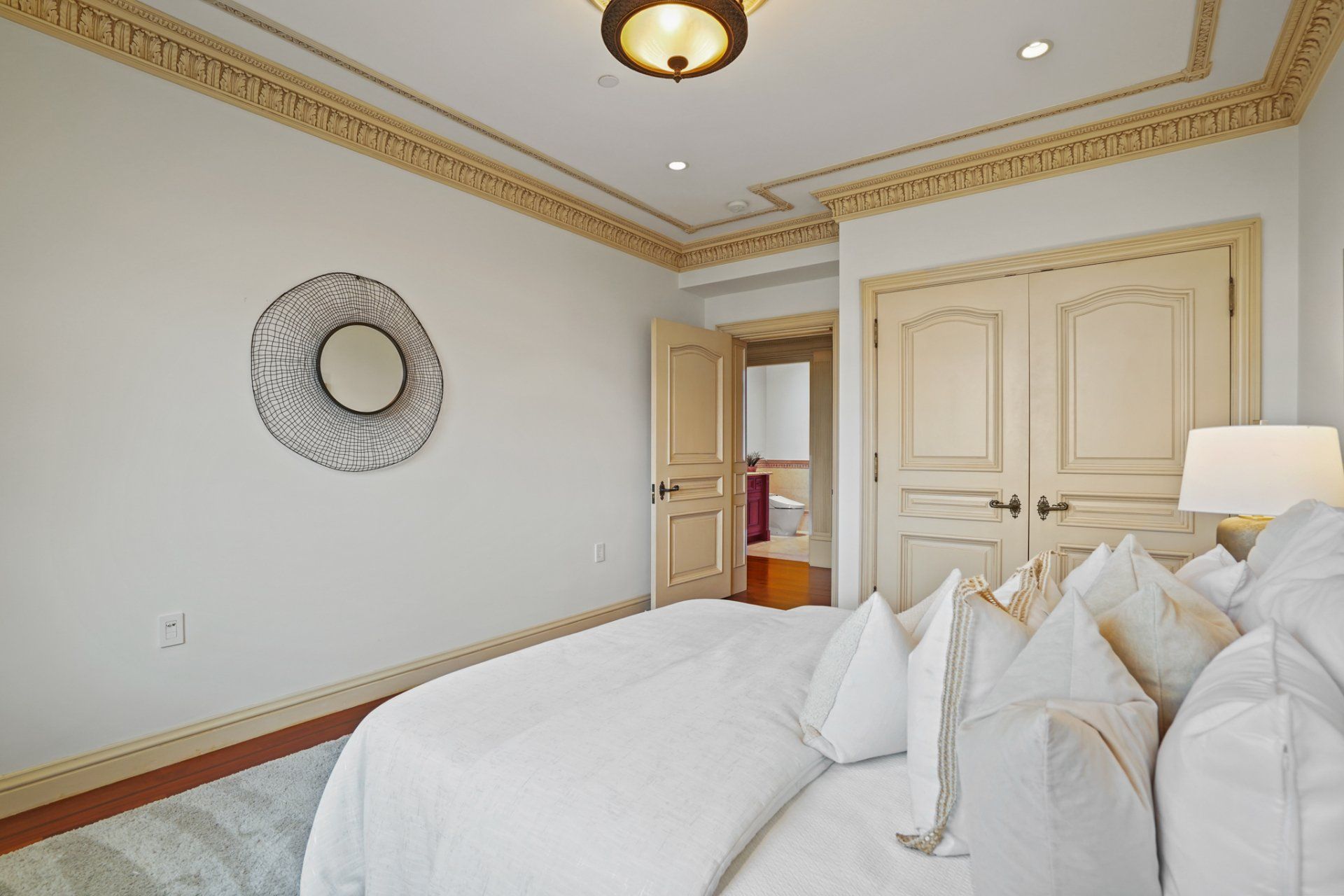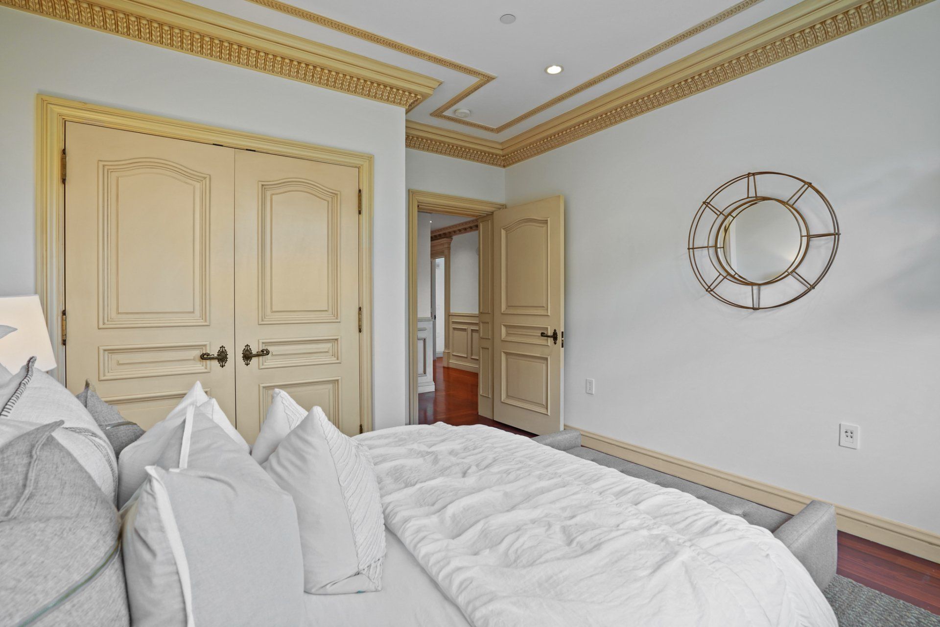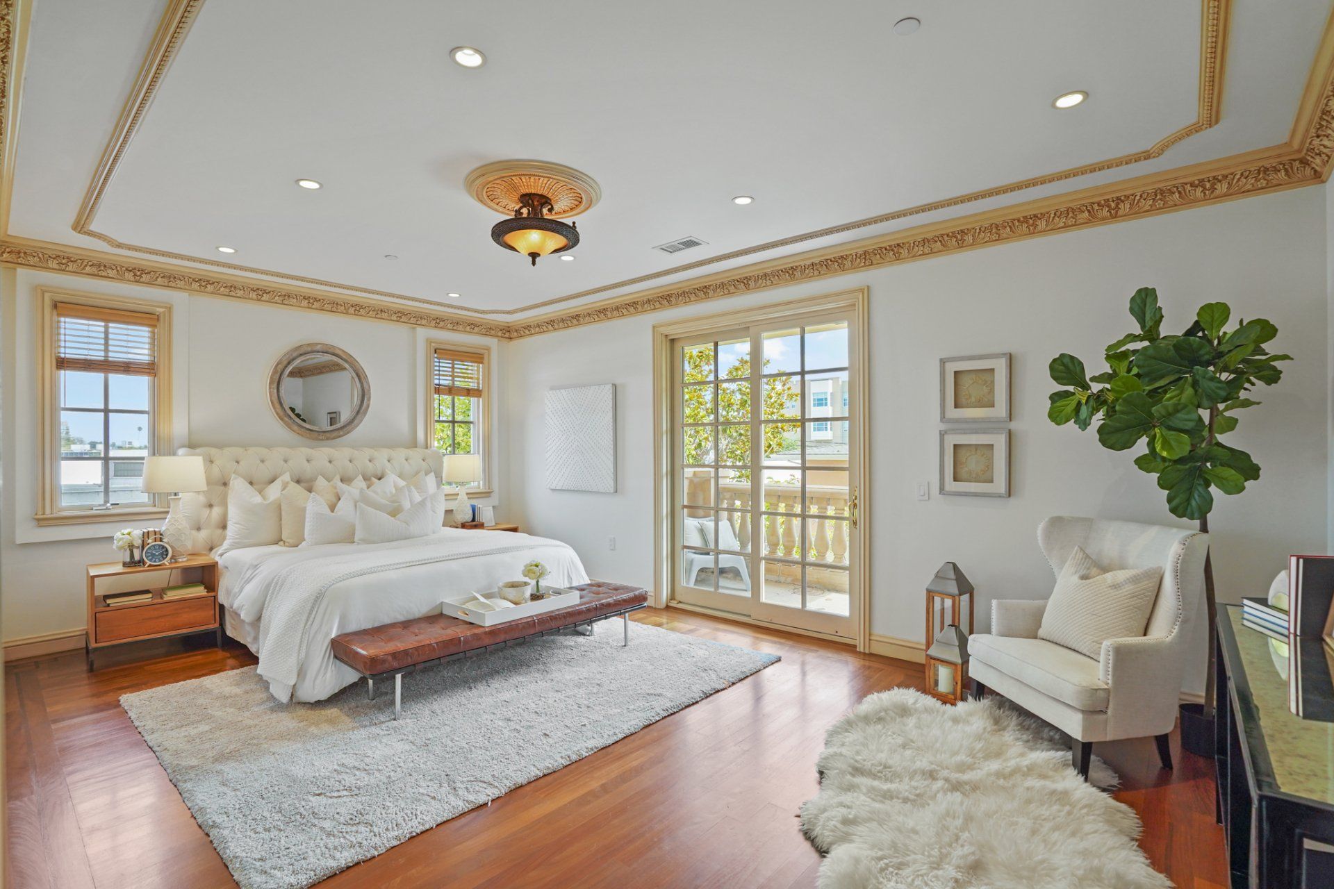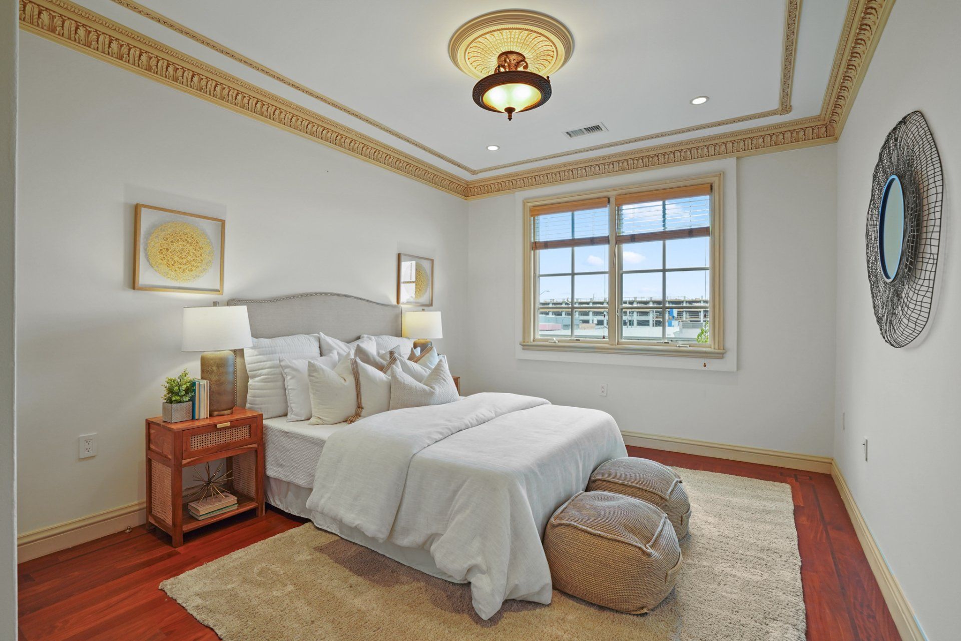 - In residence, find beautiful crown molding, high ceilings, decorative ceiling medallions, and hardwood flooring with dark inlay.