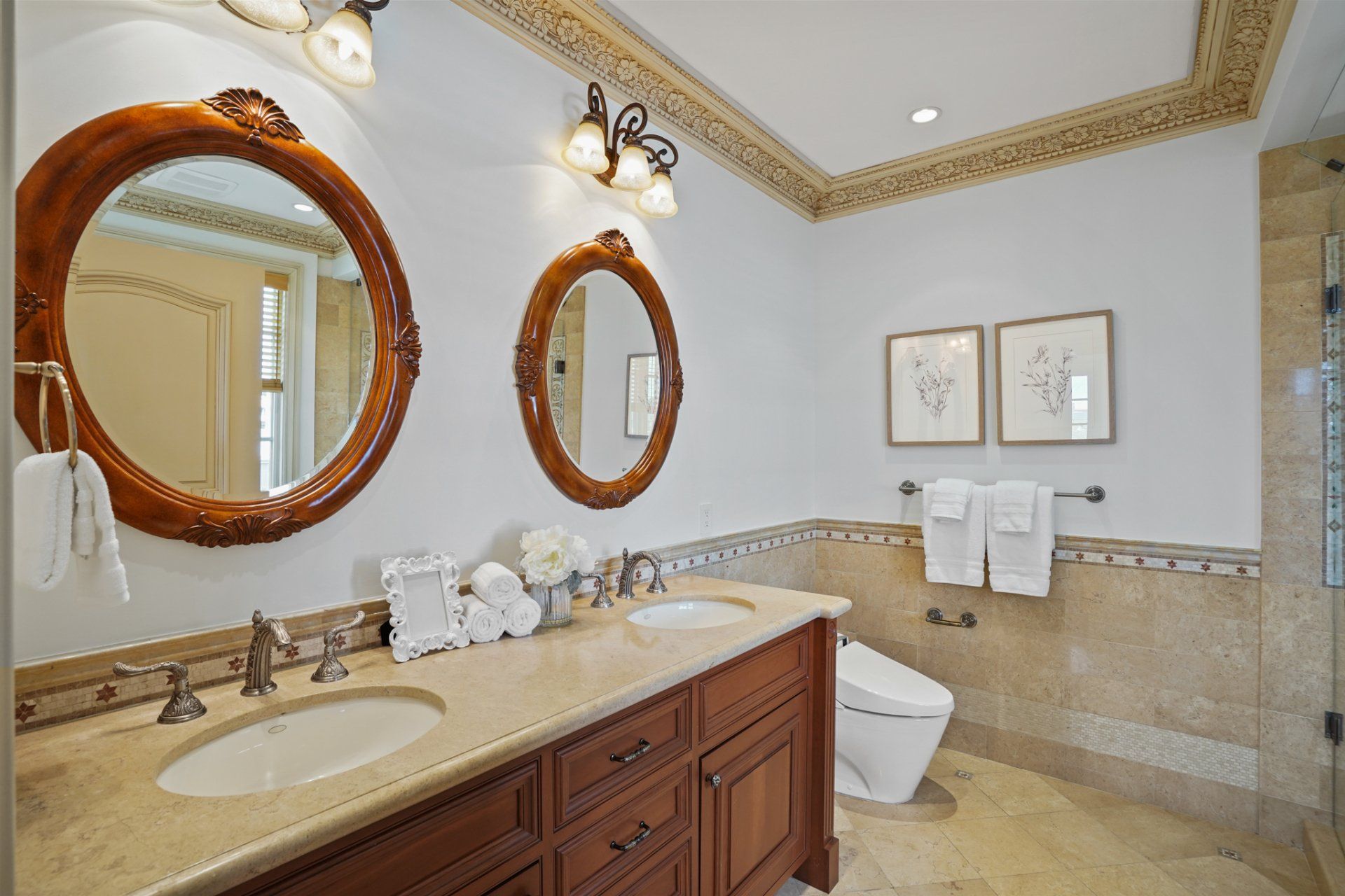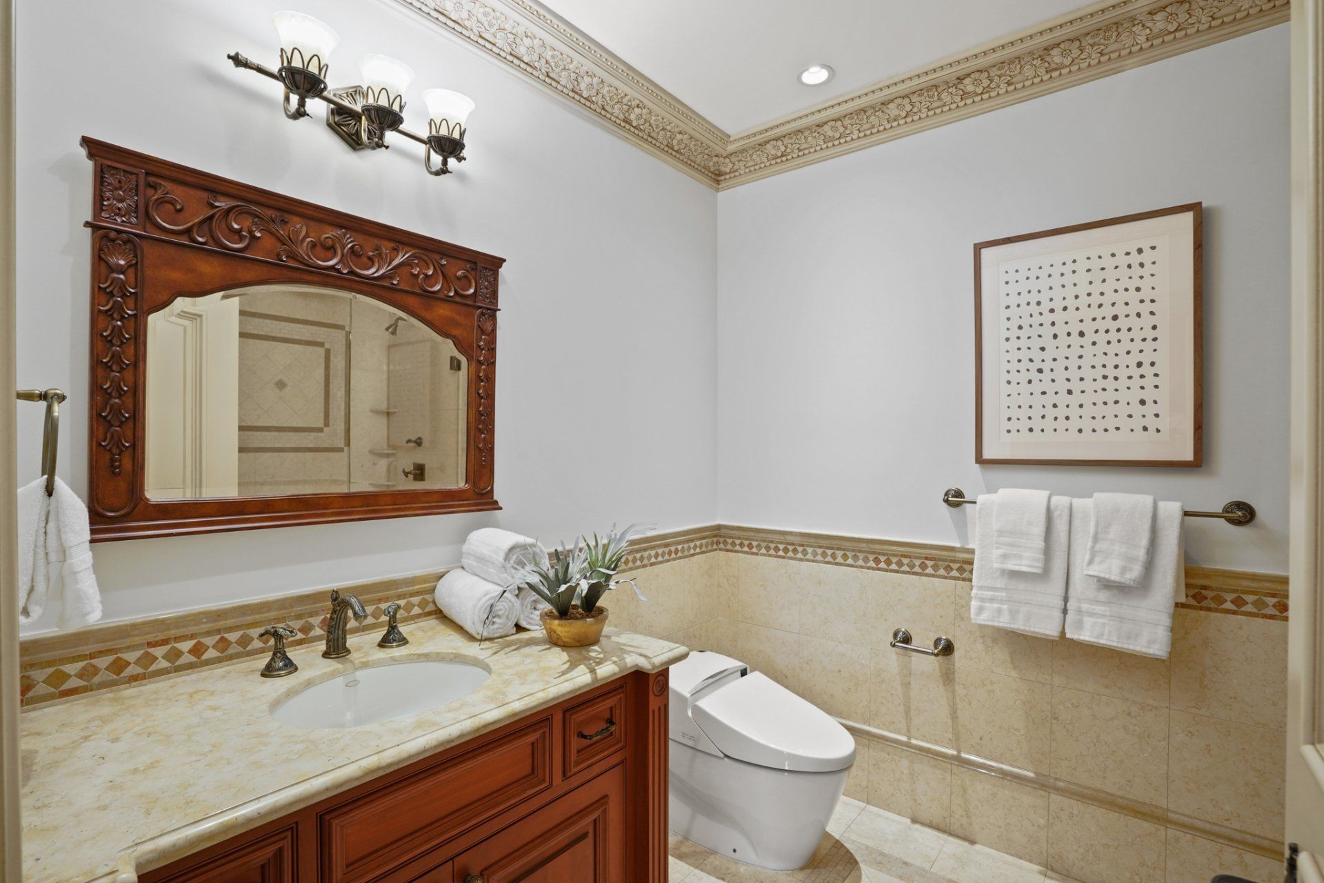 - Well-equipped bathrooms with heated flooring, walk-in shower, tile wainscotting and Toto Washlets.