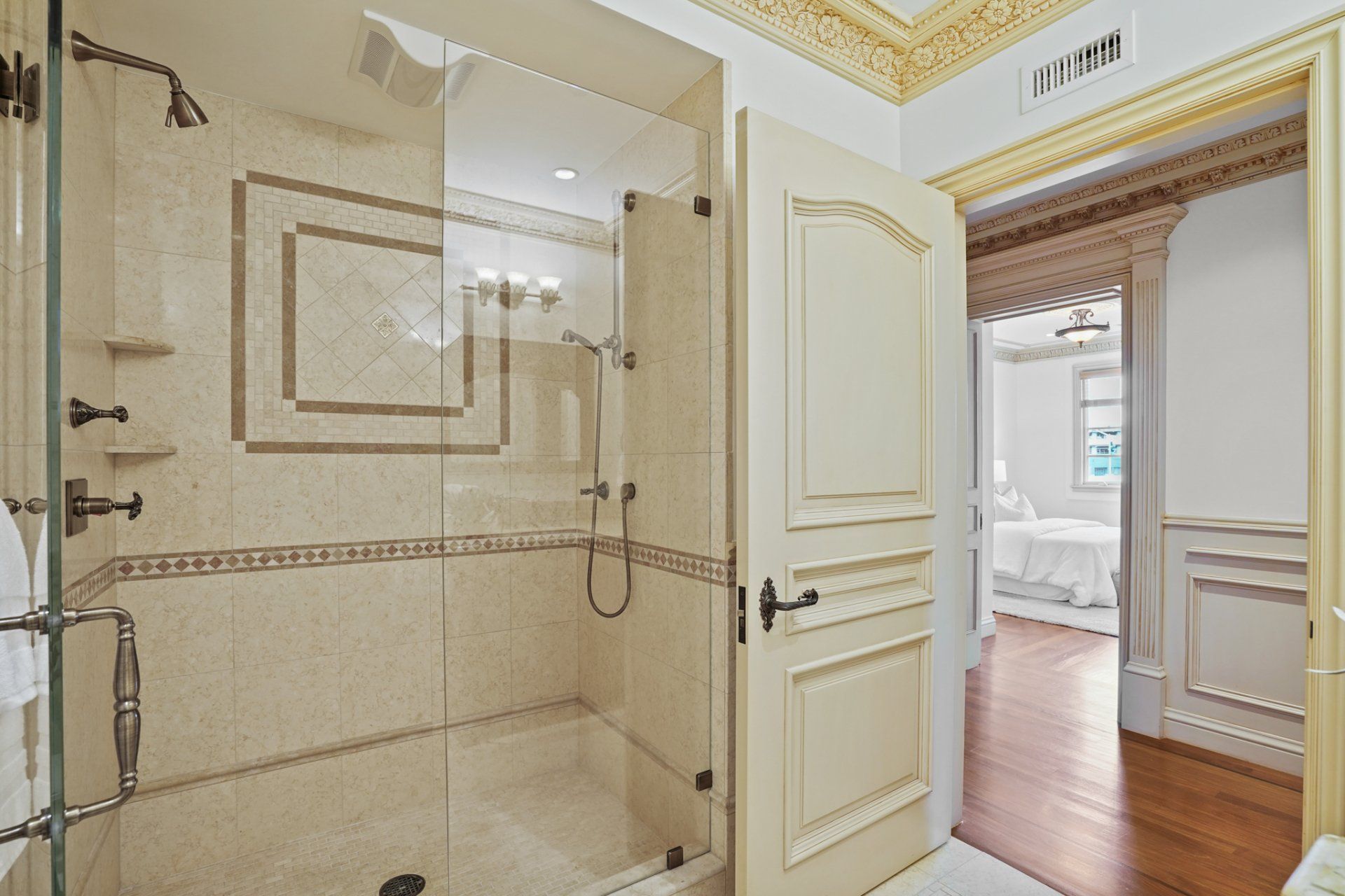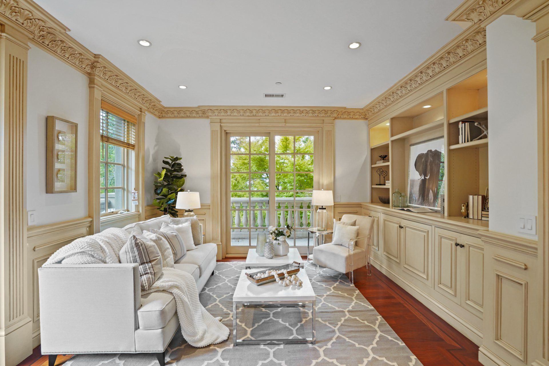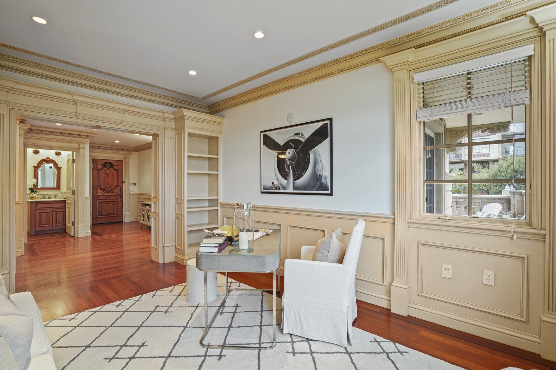 A hall lined with mahogany wainscotting, and an embellished coffered ceiling leads you to #201, one of two units occupying the second floor. Beyond the ornately carved front door, the same classic design extends throughout the spacious residence. Crown molding connects the high ceilings to the freshly painted walls that are distinguished by time-honored millwork. From the entry, hardwood flooring with dark inlay escorts you into the living room. Surrounded by windows and natural light, a large built-in serve as the entertainment hub within this gracious room, as two sets of paned, glass sliders open to a semi-private, wrap-around balcony.