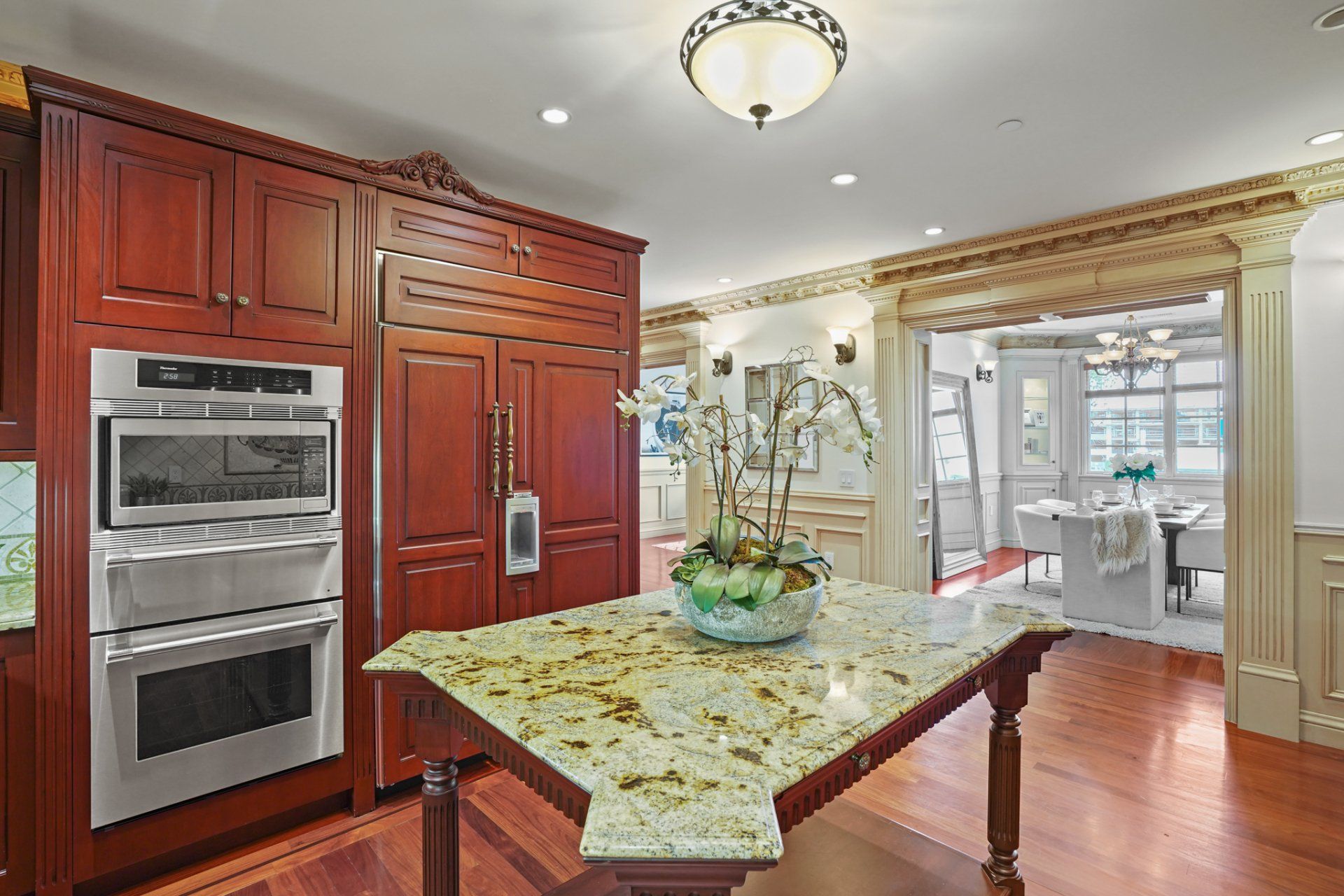 - High-end appliance suite includes a 6-burner Viking range, panelized Sub-Zero Refrigerator, and stacked Thermador convection oven, microwave and warming drawer.