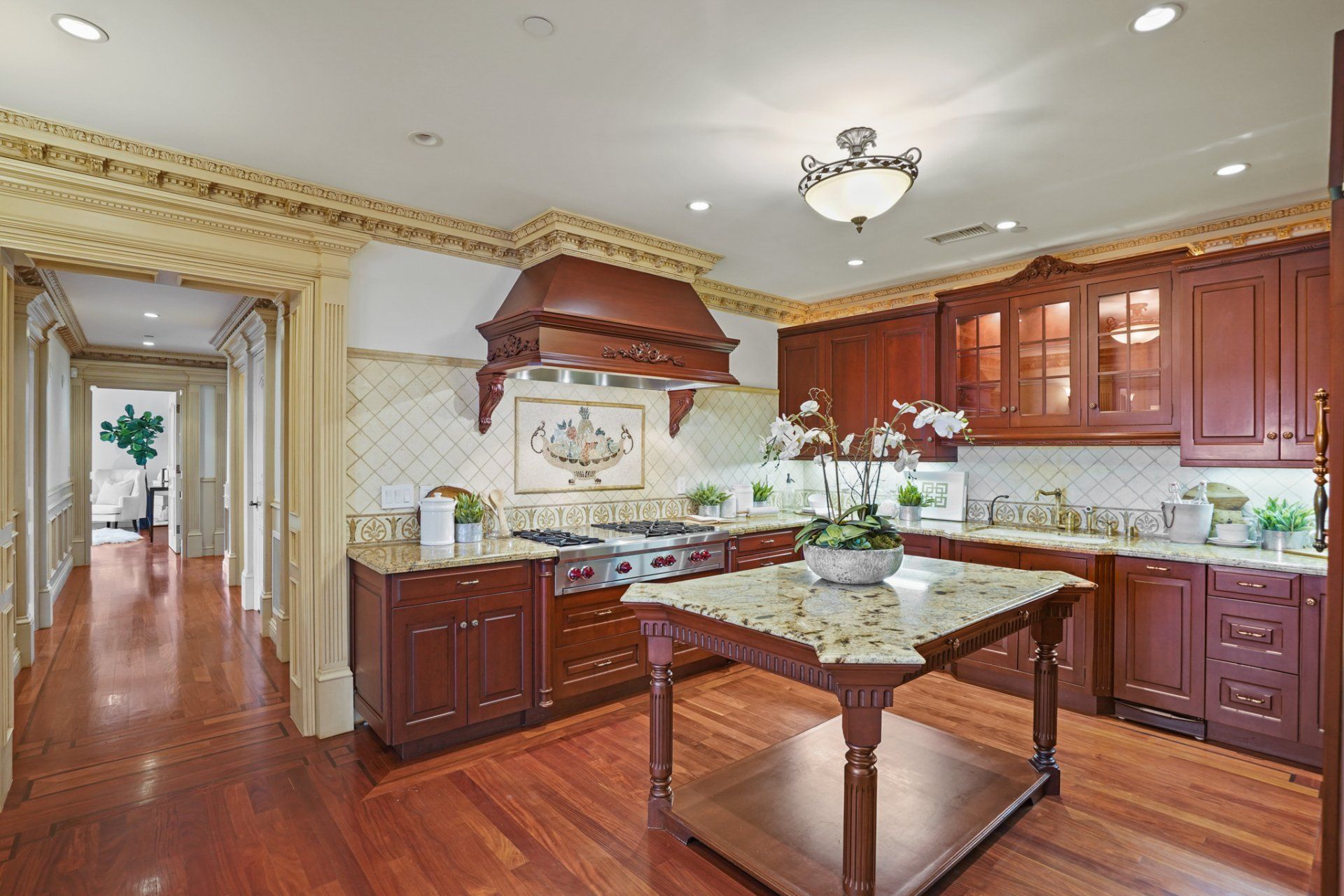 - Gourmet kitchen with a large island and ample custom cabinetry.