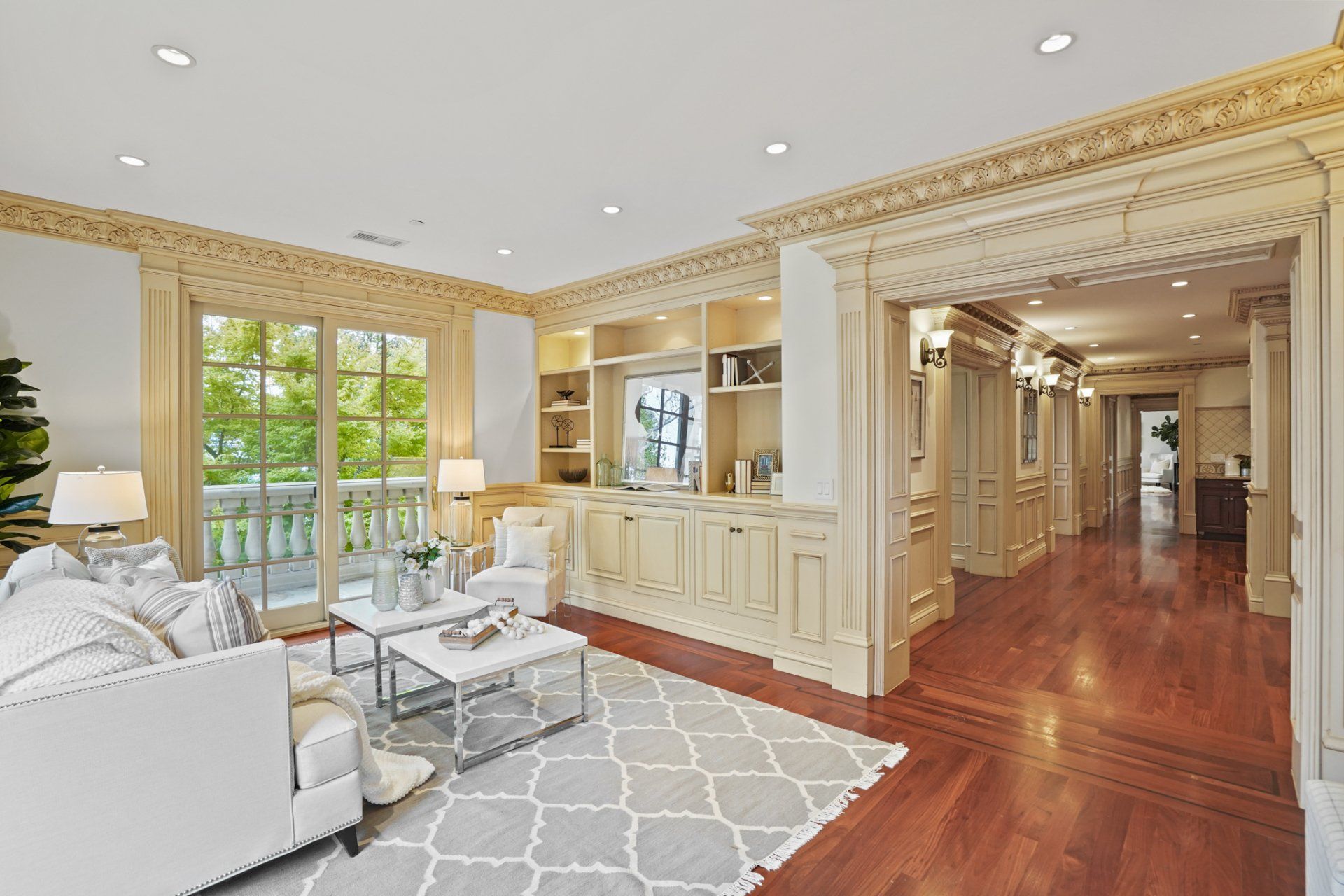 - Impressive primary suite with private balcony and large walk-in closet and floor-to-ceiling built-ins.