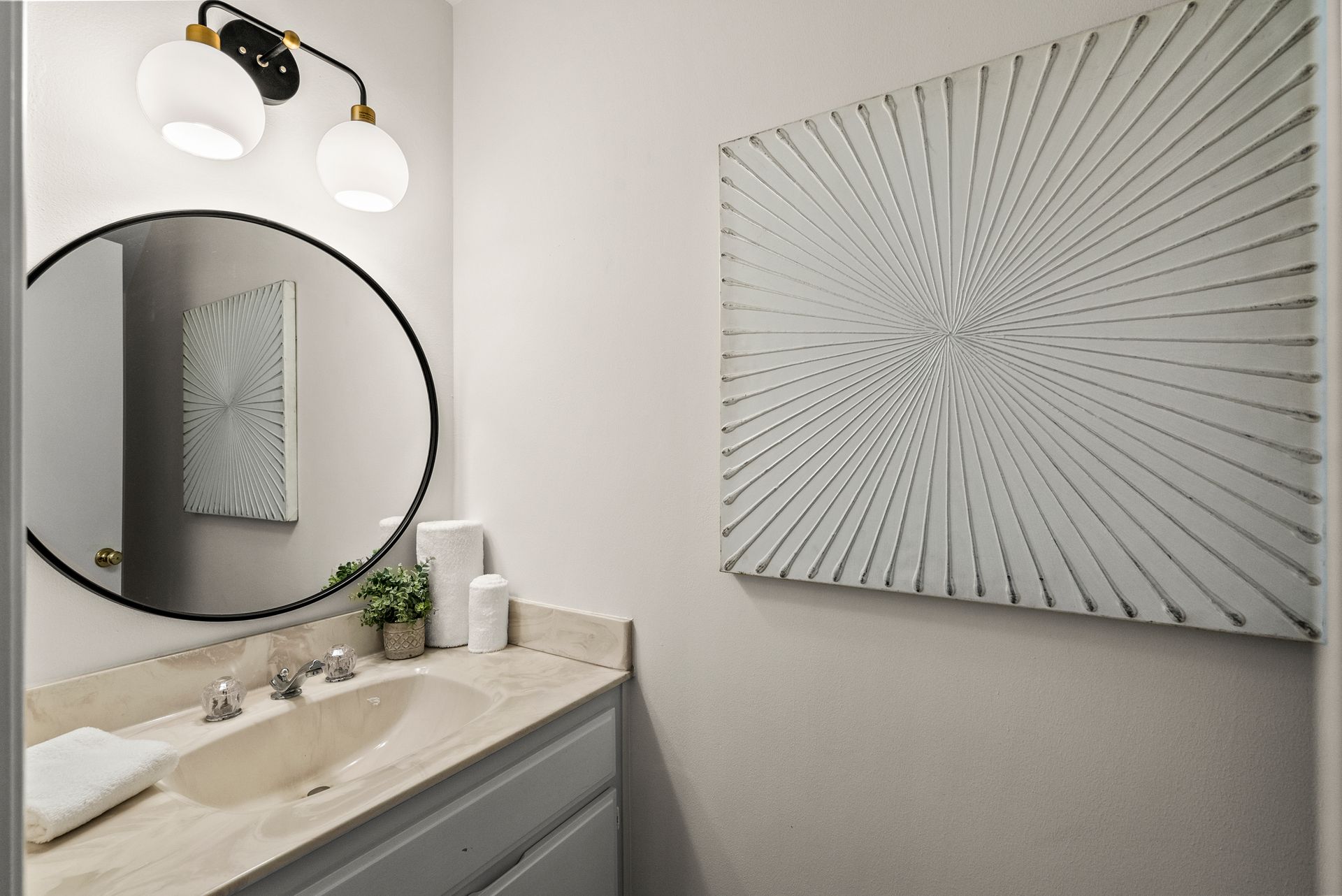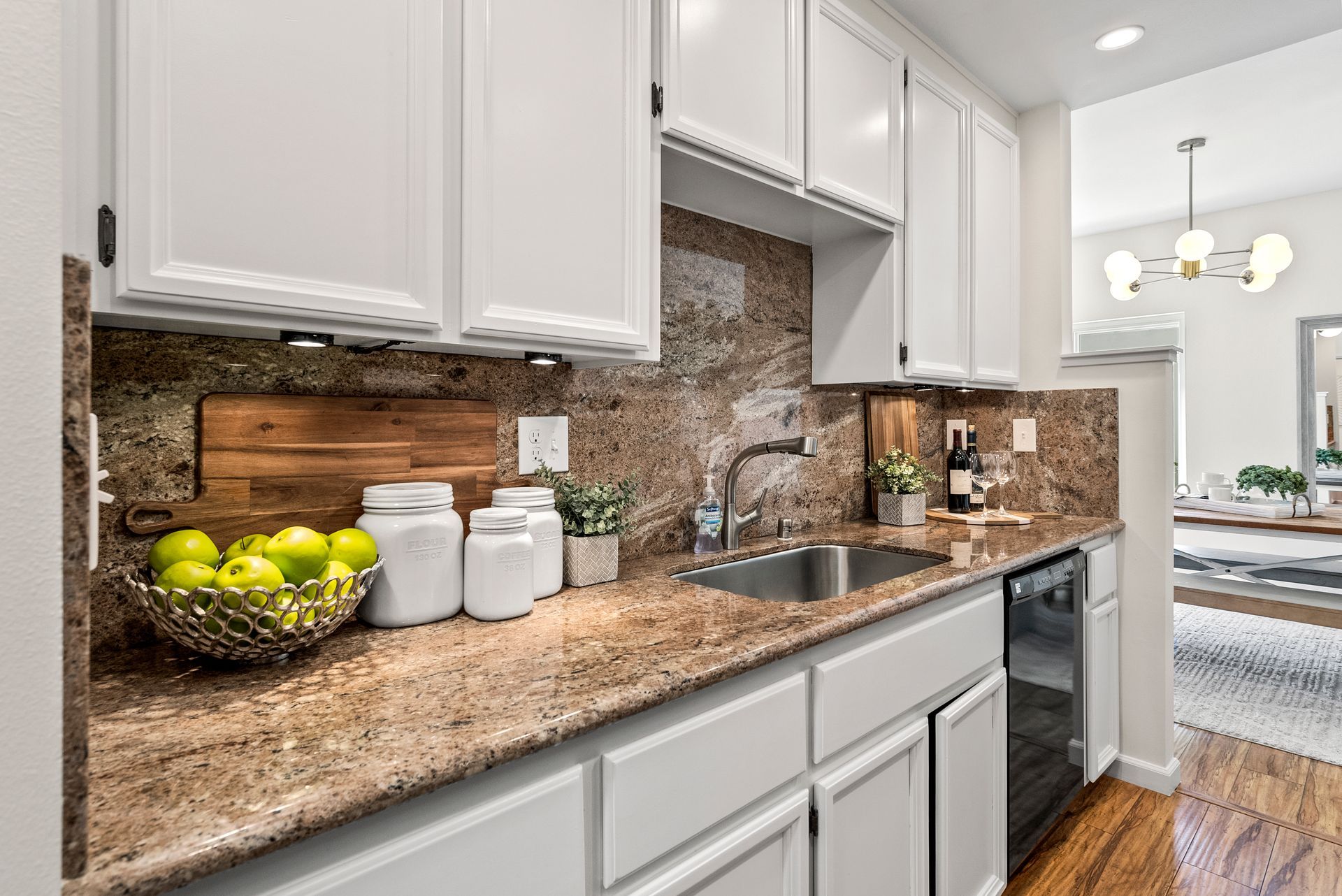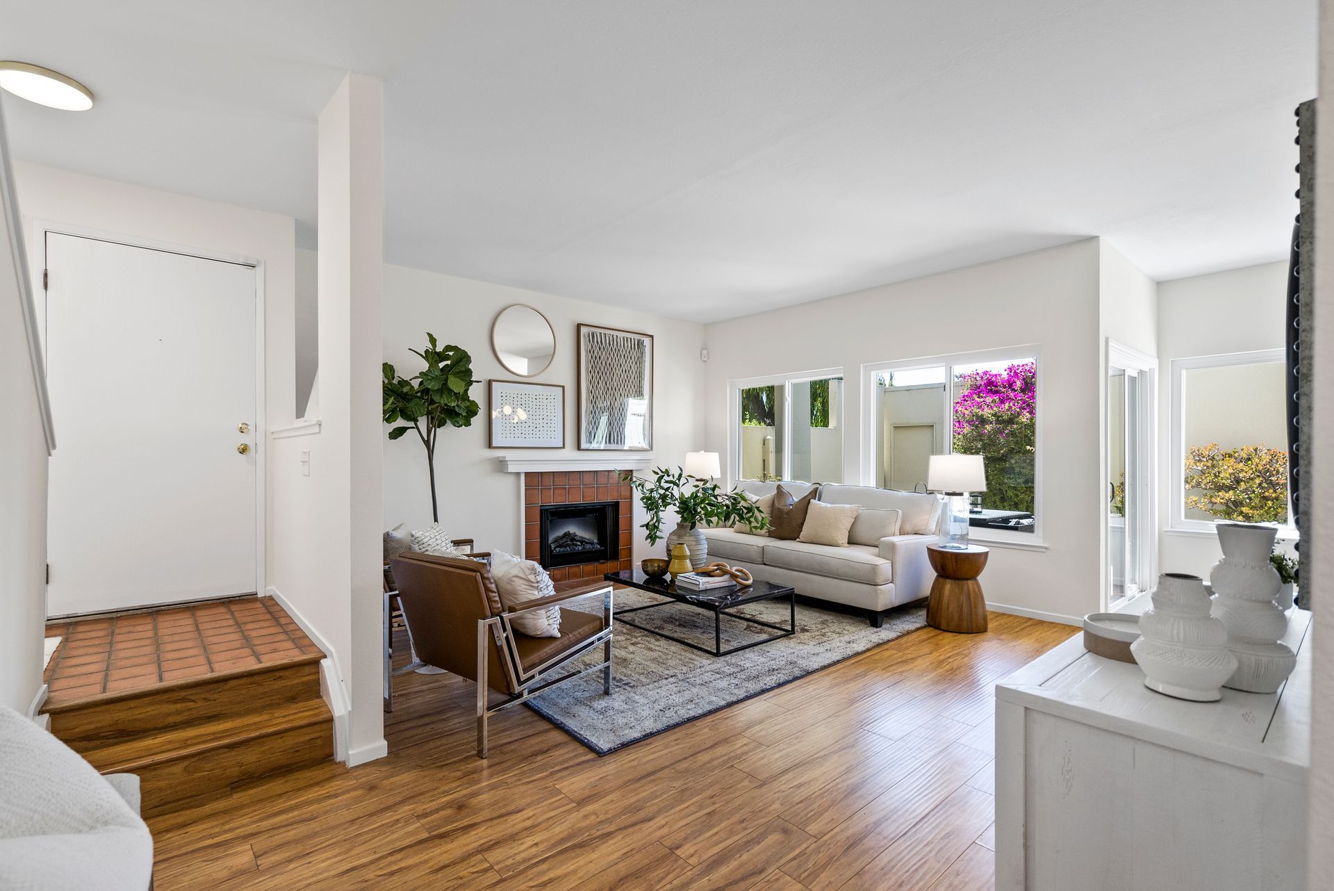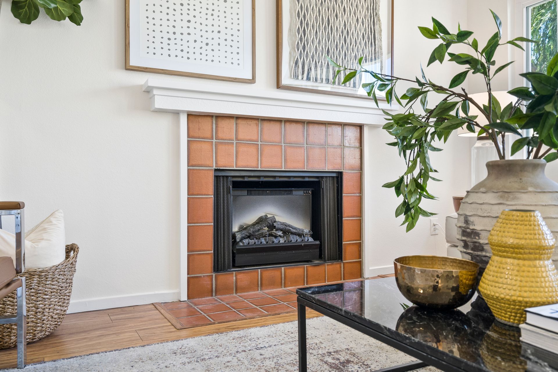 From a friendly neighborhood road, approach the welcoming covered entry adorned with beautiful Talavera and terracotta tiles that guide you inside. Wood plank floors, fresh interior paint, and lofty ceilings add a sense of open airiness to this spacious living room, highlighted by a gas fireplace and abundant natural light from a wall of windows. Pass through the formal dining space to the galley kitchen, which possesses both style and functionality with natural stone countertops and backsplash, an electric ceramic cooktop range, and a large single-basin sink. Perfect home-cooked meals and serve them in the formal dining room under the modern chandelier or al-fresco on the stone-lined courtyard off the dining room. This spacious outdoor space grants access to the front yard through an adorable gate, single-car garage, and additional storage and mechanical closets. A half bathroom and an additional storage closet complete the lower level.