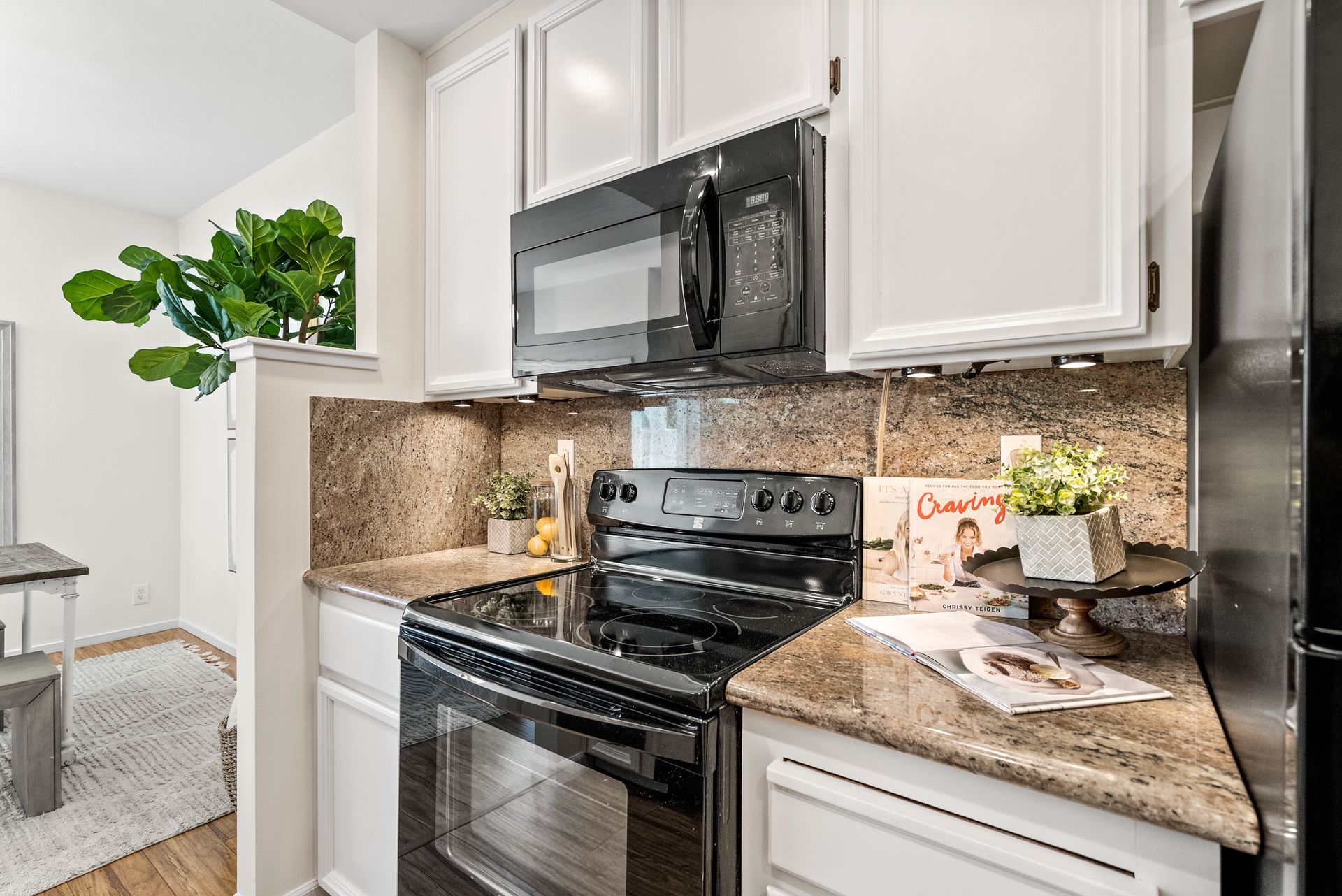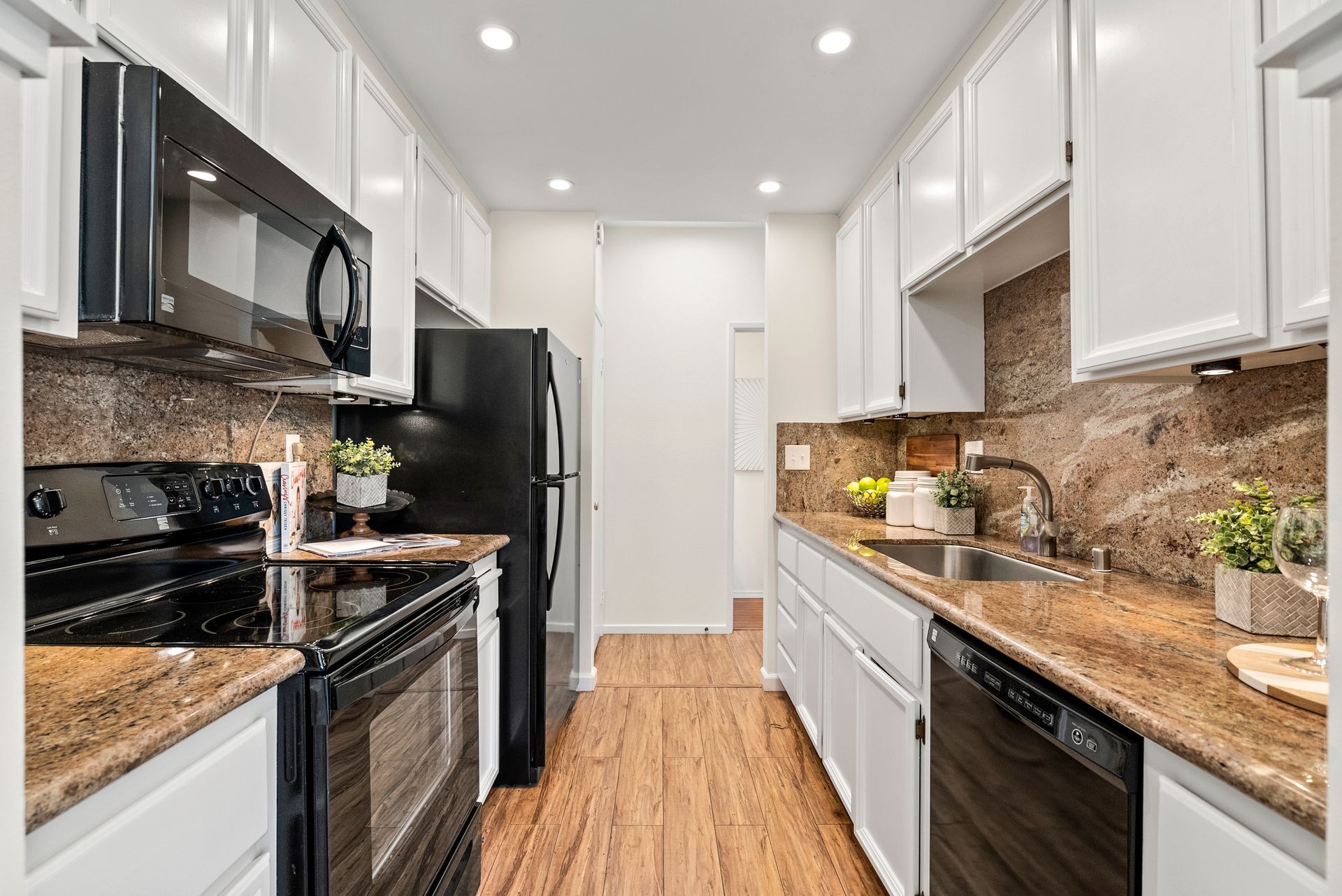- Galley style kitchen with natural stone countertops, freshly painted cabinetry, and a suite of black appliances.