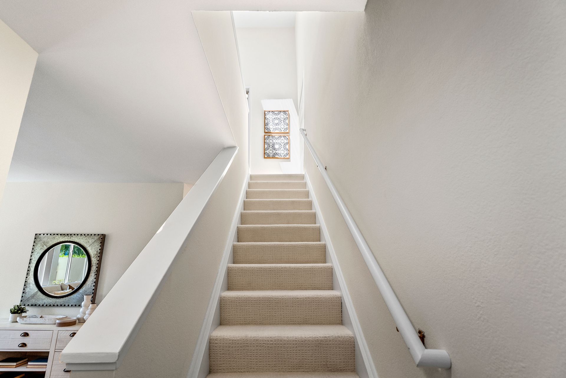Follow freshly carpeted stairs to the second level and bask in the natural light that fills the space from a large overhead skylight and bounces off the same high ceilings that are found throughout the home. Plush carpeting extends across the upper level into the impressive primary suite with dual closets and an updated ensuite brightened by an airy skylight above the tub. Glass sliders encased in plantation shutters open to a shared balcony that provides a gorgeous vantage point of the surrounding area. At the end of the hall is the equally spacious guest bedroom providing a sizable walk-in closet and mirroring glass sliders encased in plantation shutters that offers access to the shared balcony. Laundry space accompanies an updated hallway bathroom with a walk-in shower and completes this idyllic floor plan.
