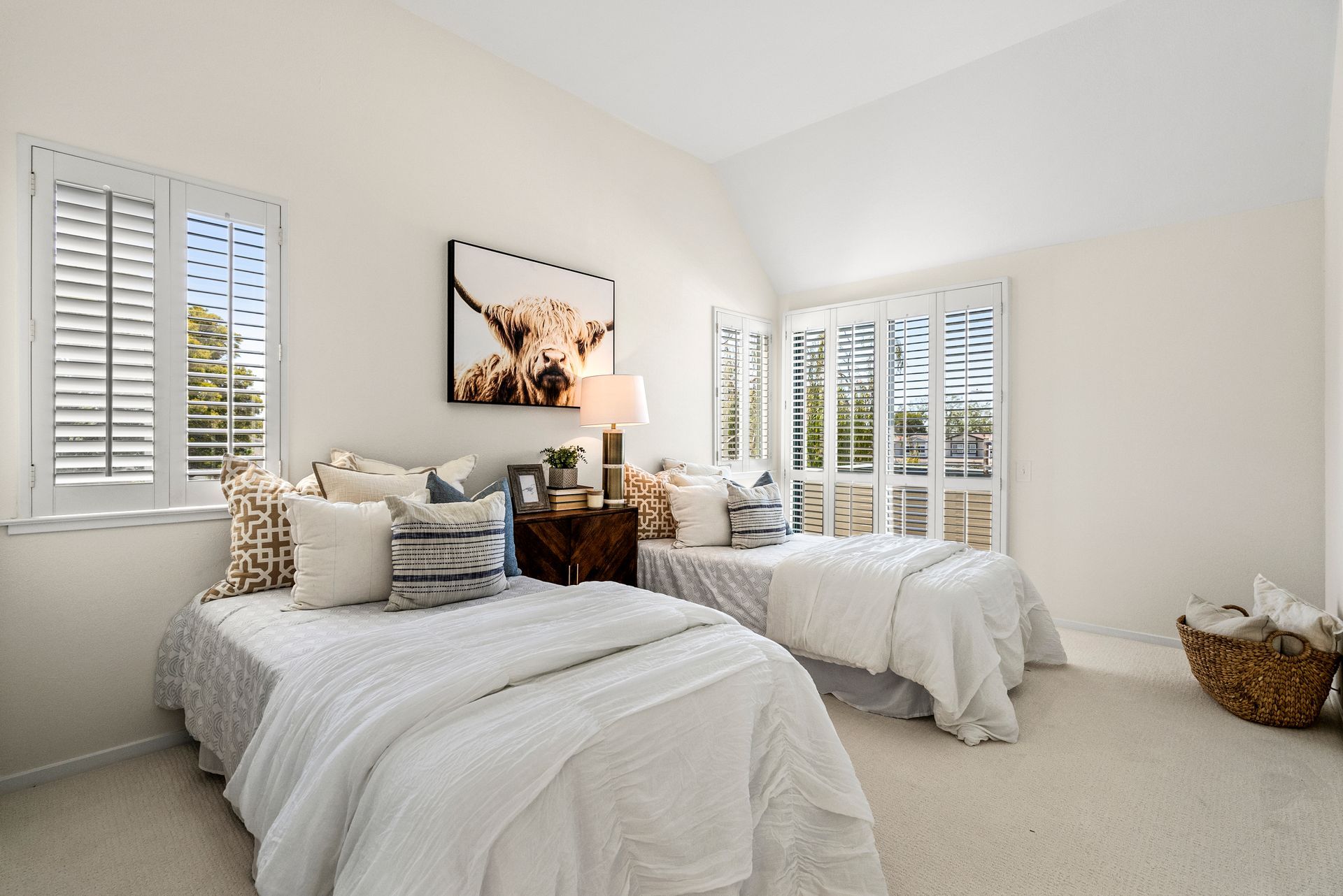- Upstairs, two spacious bedrooms with high ceilings share a balcony accessible by glass sliders encased in plantation shutters.