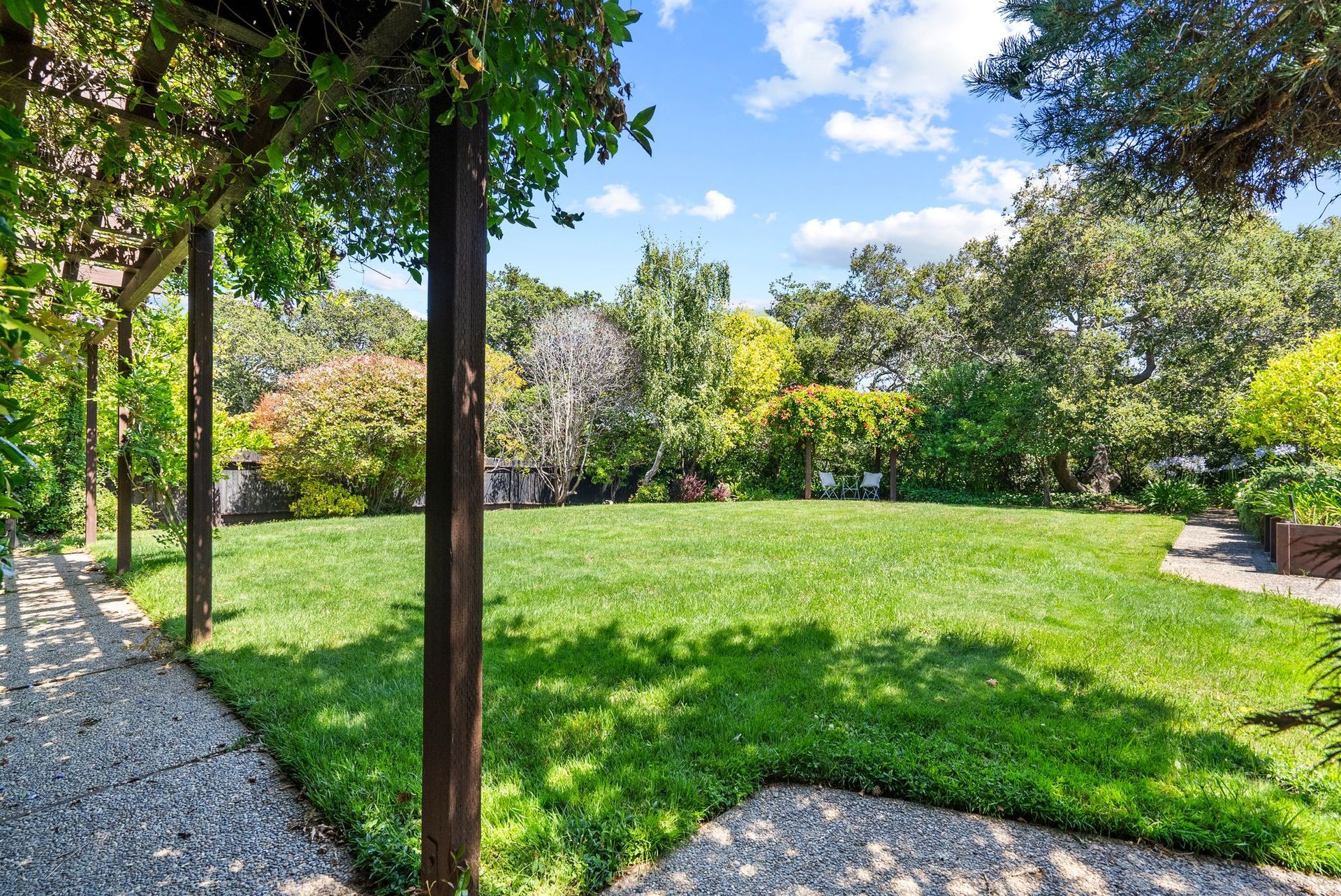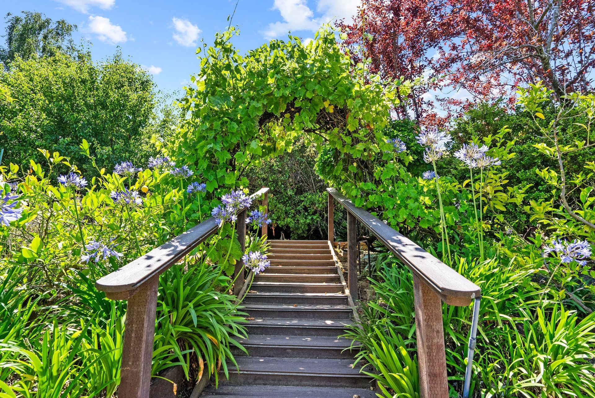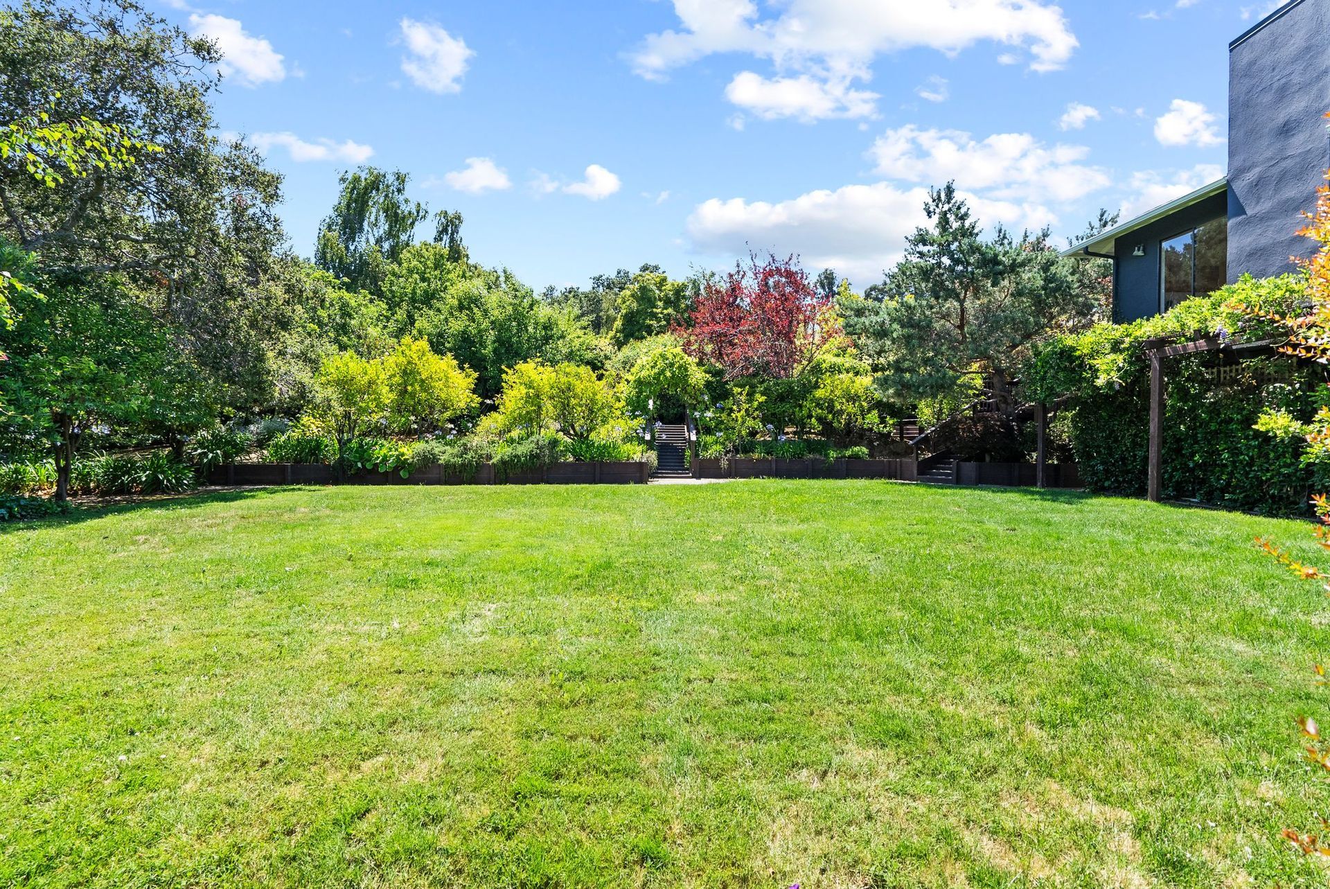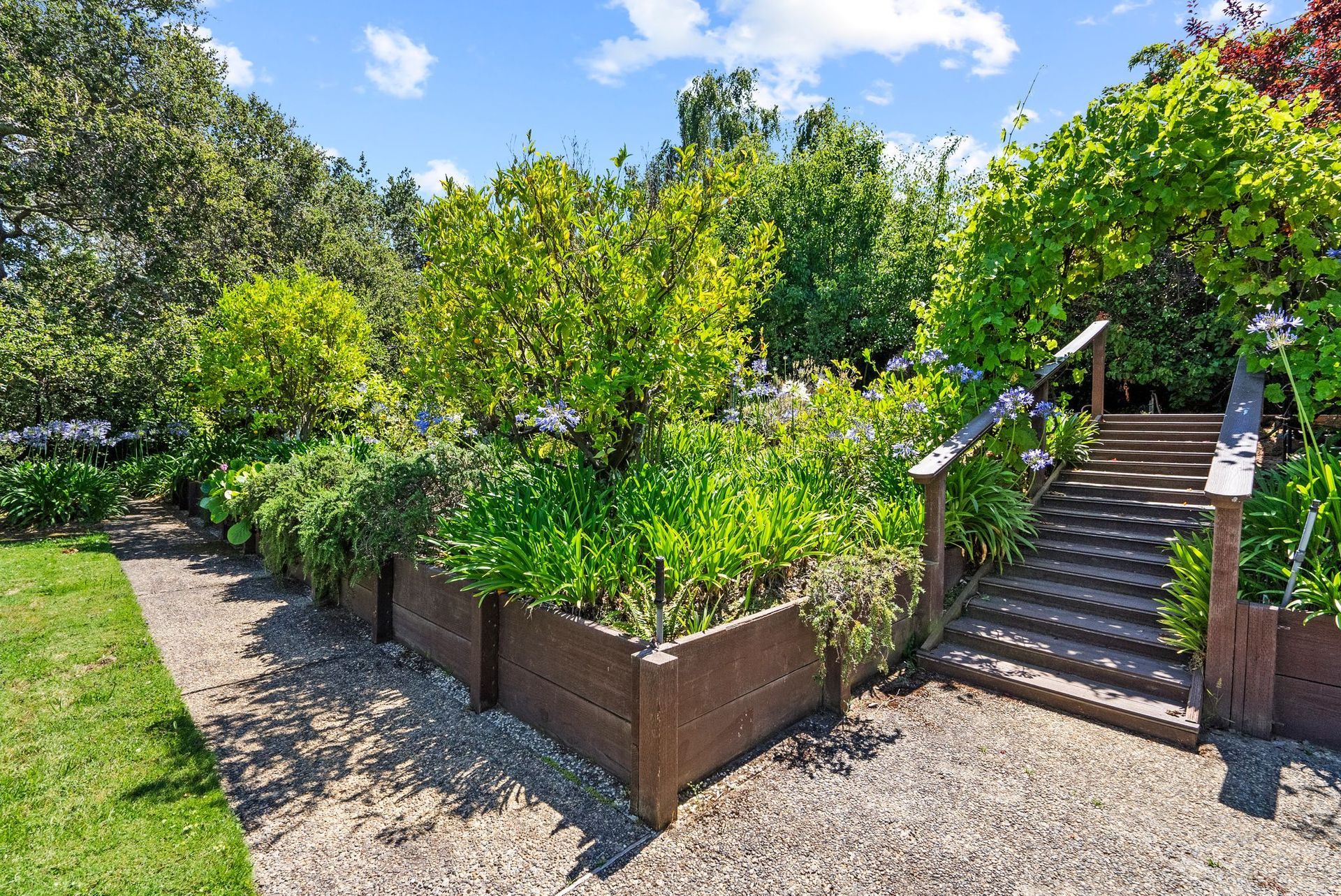 - Expansive park-like backyard with tiered decks and plantings of rambling vines, foliage, and mature fruit trees surrounding a lush manicured lawn that provides lovely vignettes entertaining or relaxing.