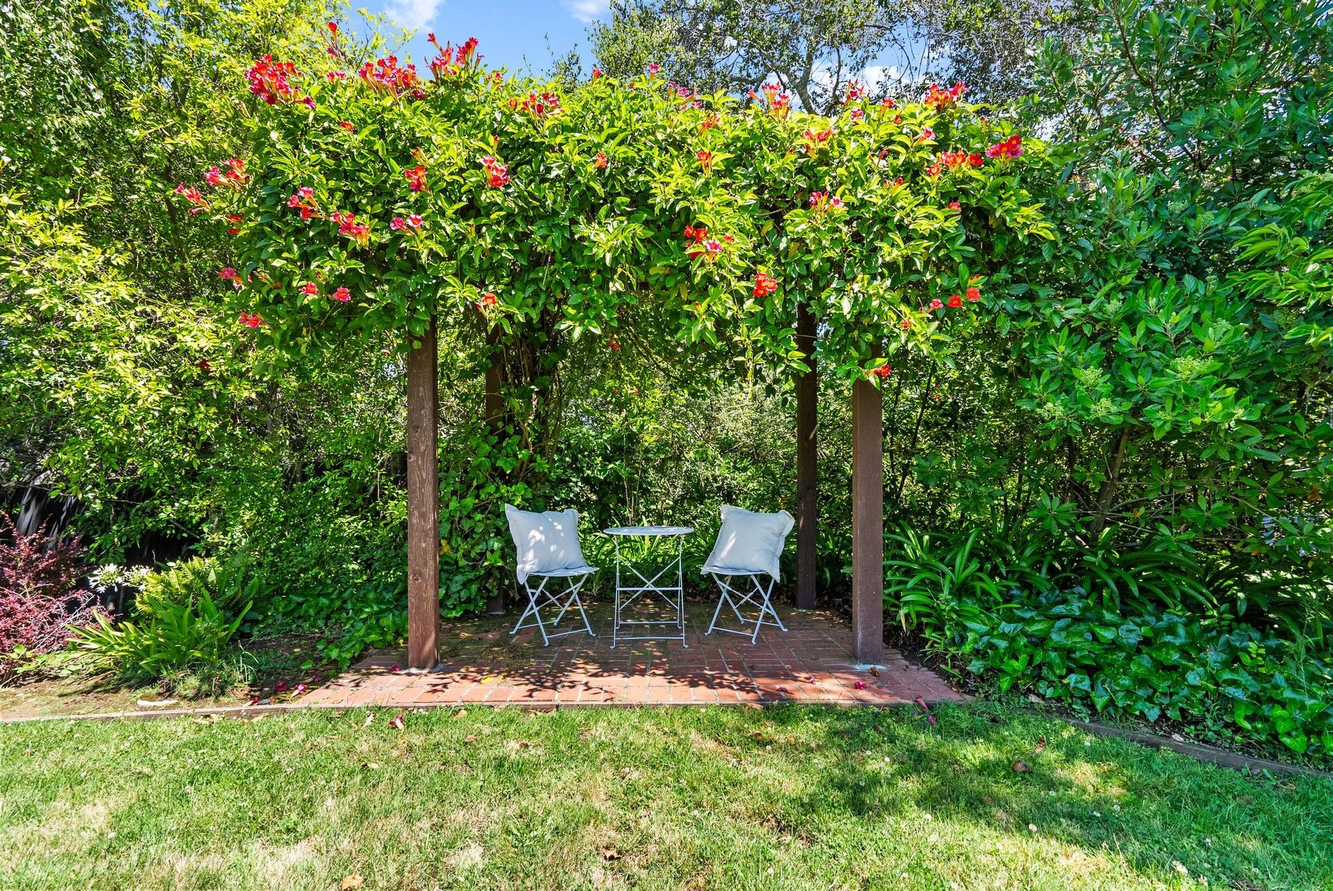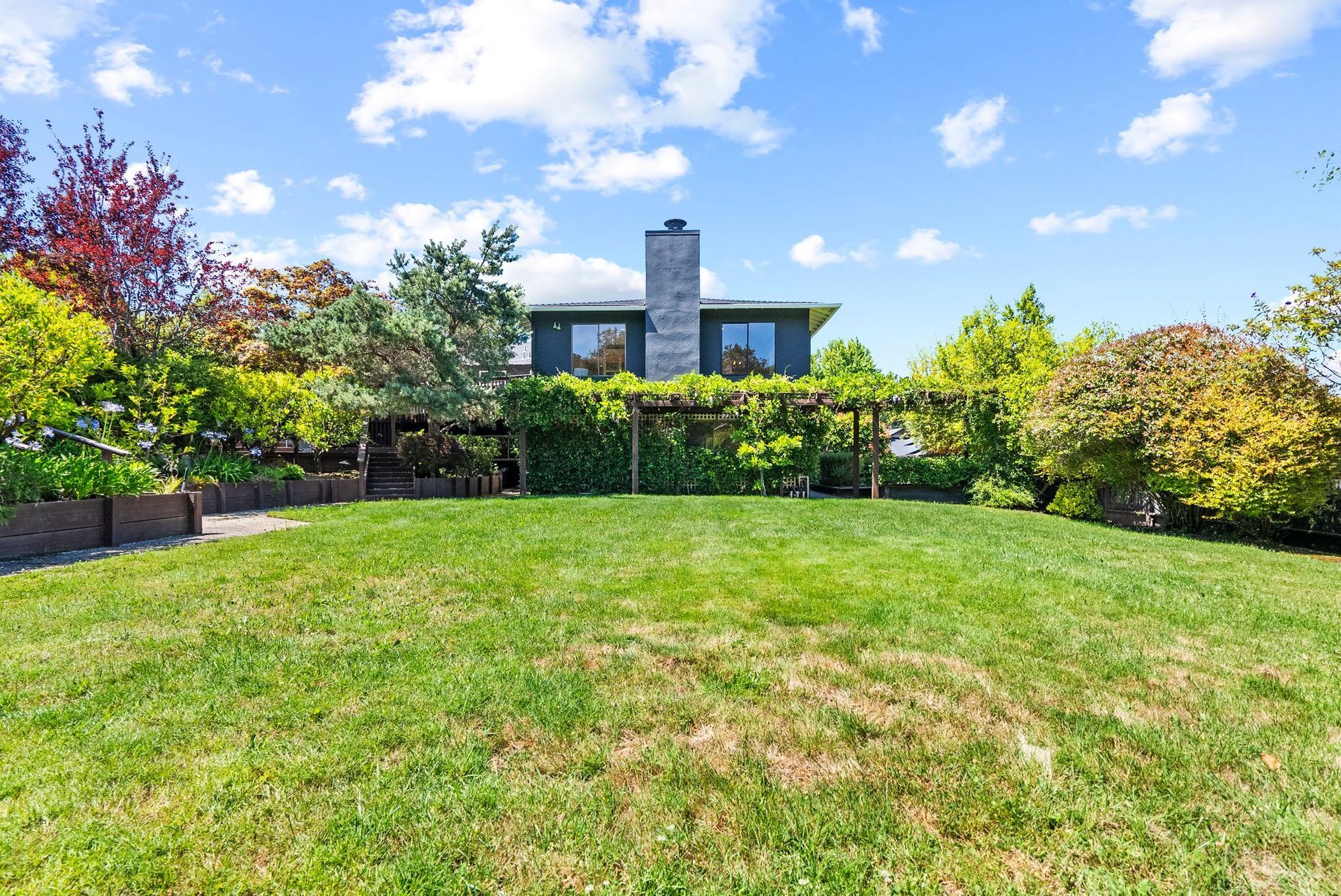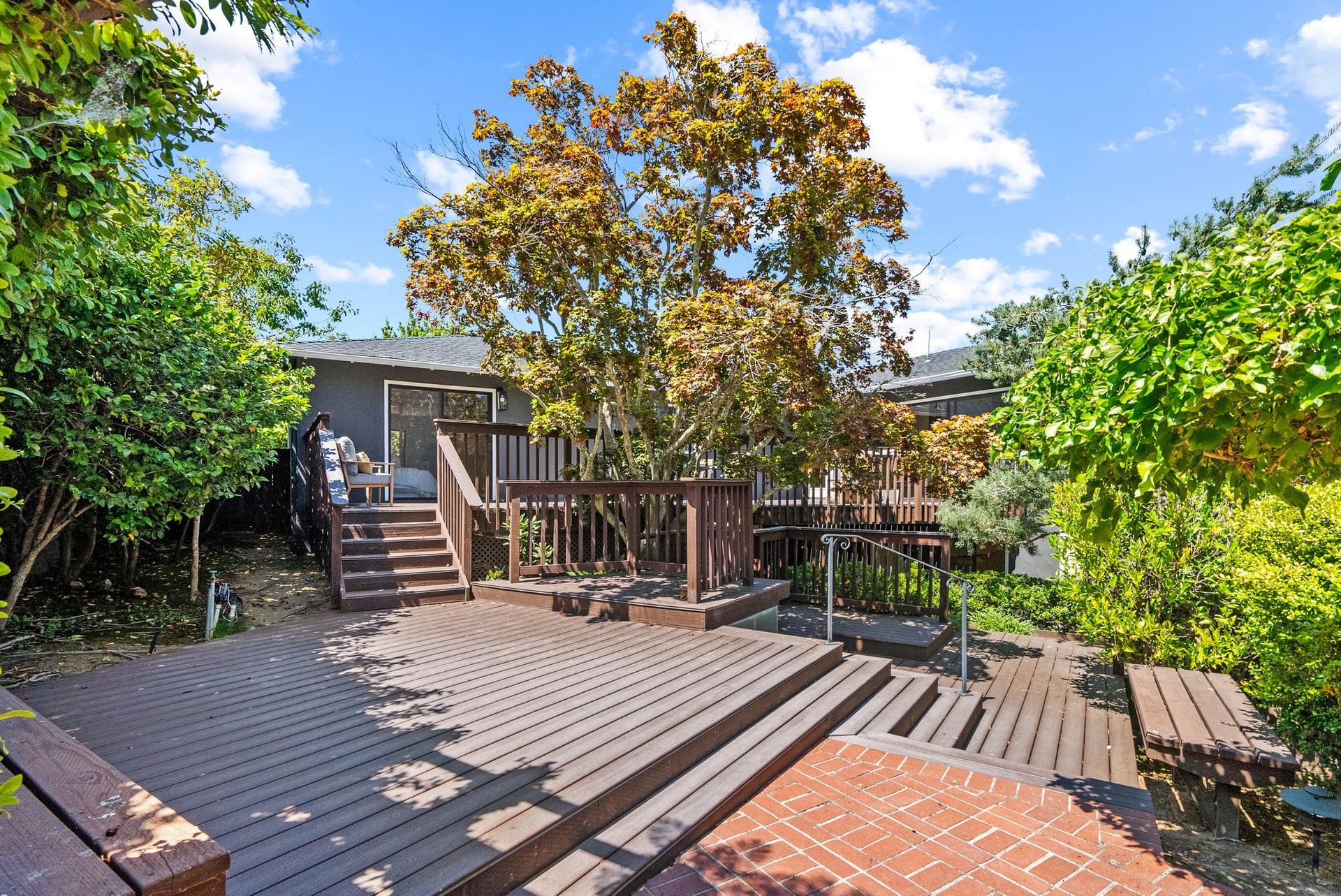- Expansive park-like backyard with tiered decks and plantings of rambling vines, foliage, and mature fruit trees surrounding a lush manicured lawn that provides lovely vignettes entertaining or relaxing.