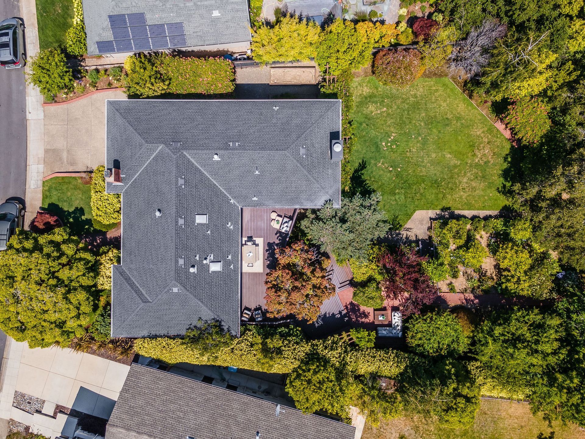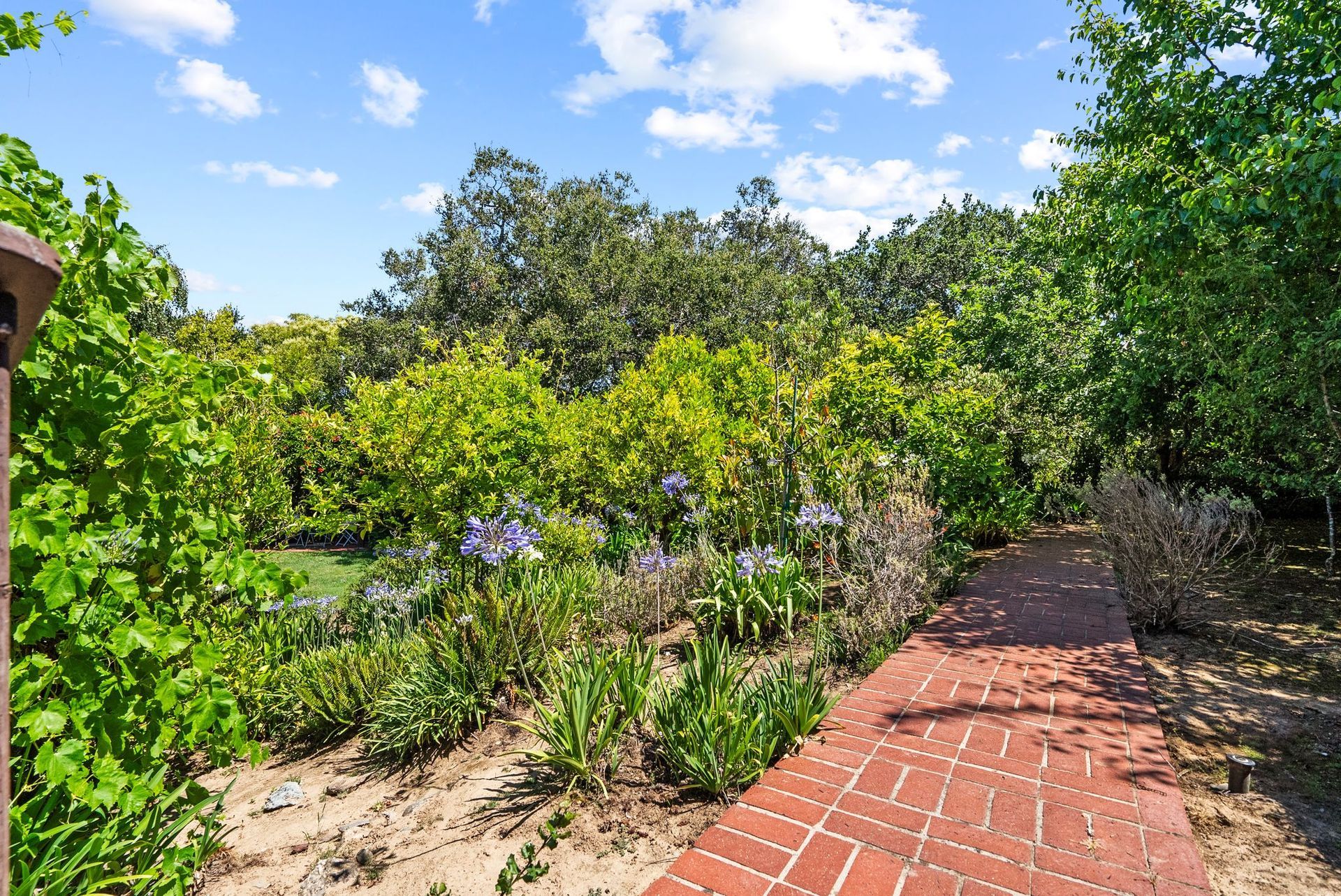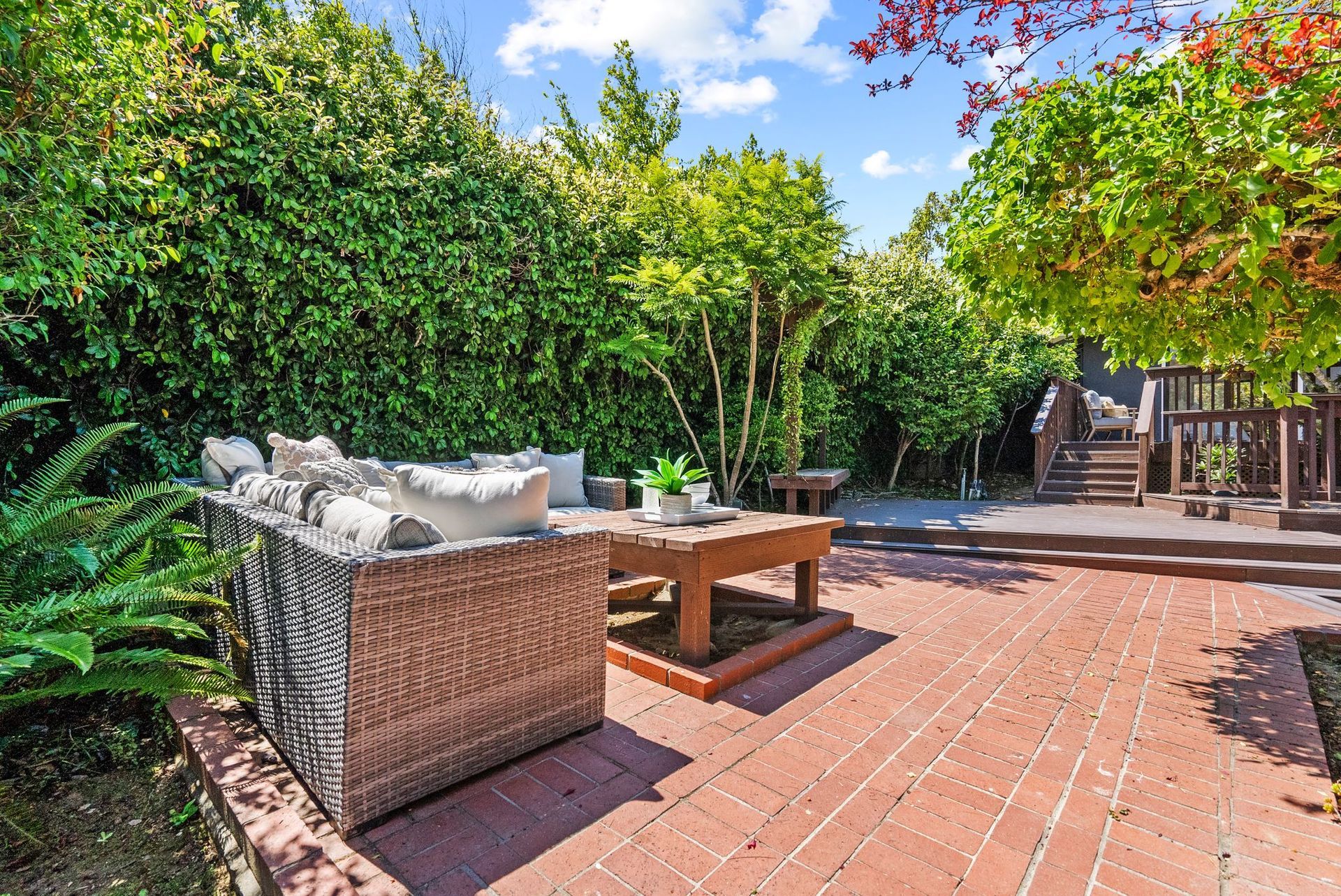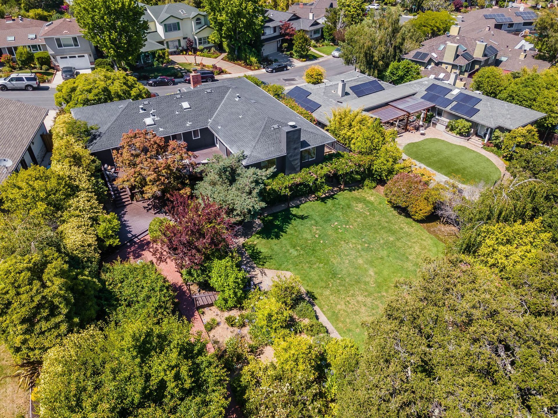 - Expansive park-like backyard with tiered decks and plantings of rambling vines, foliage, and mature fruit trees surrounding a lush manicured lawn that provides lovely vignettes entertaining or relaxing.