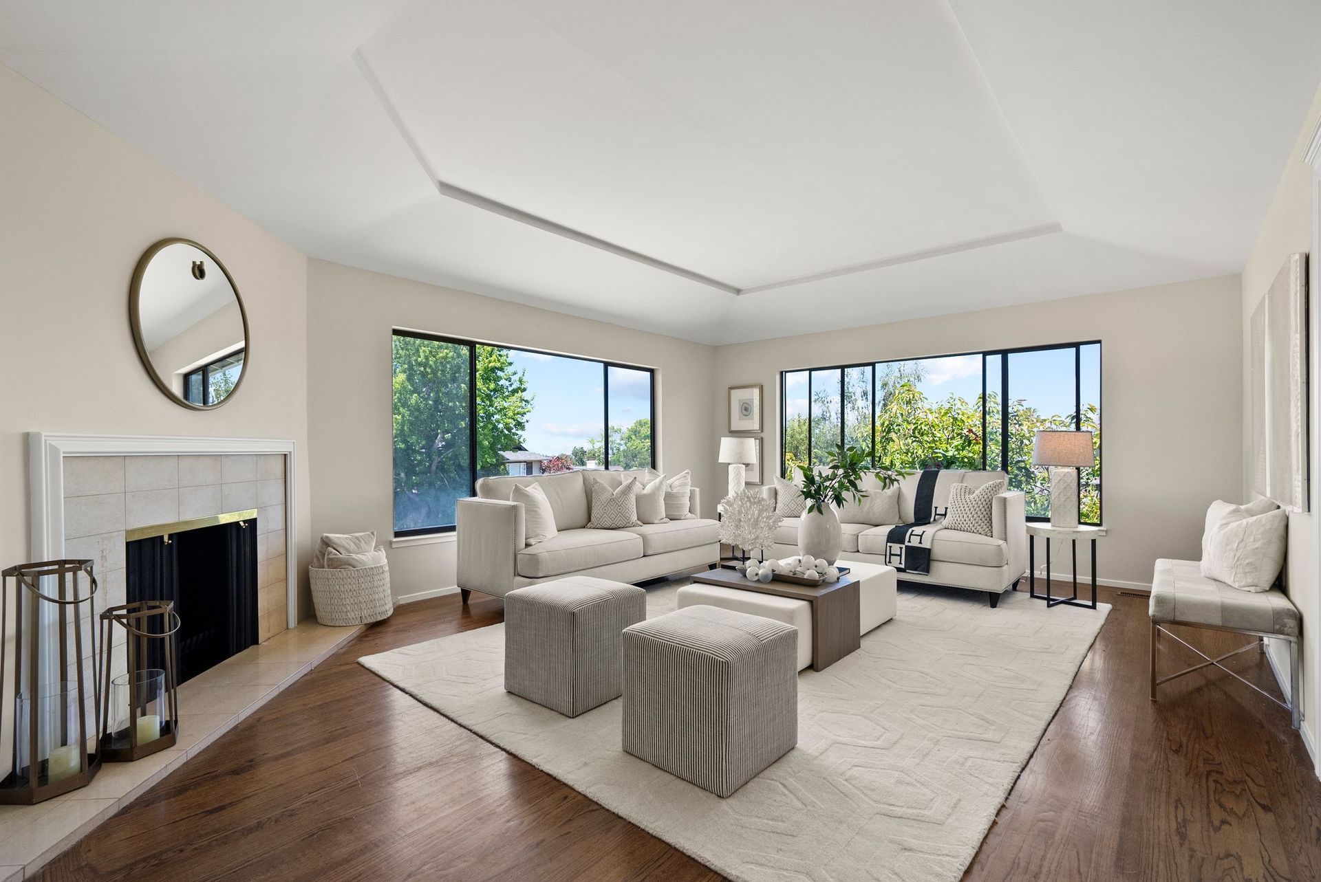- Formal living room with ample natural light, tray ceiling, and wood-burning fireplace.