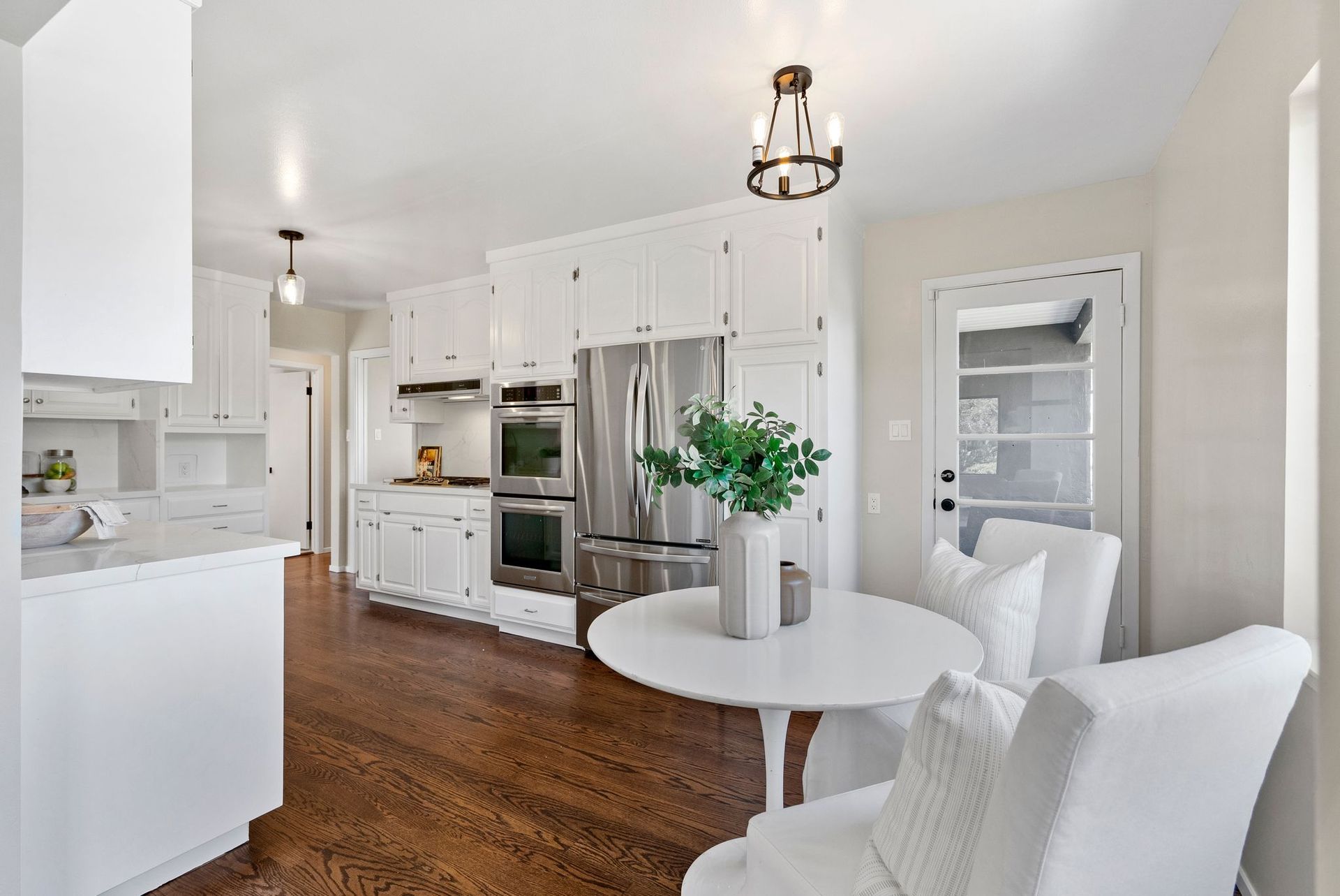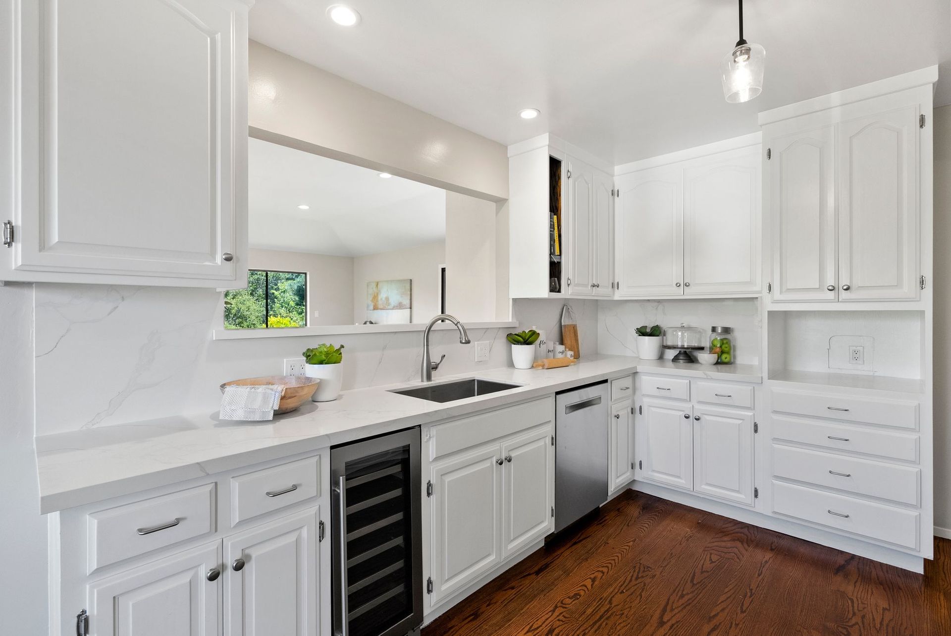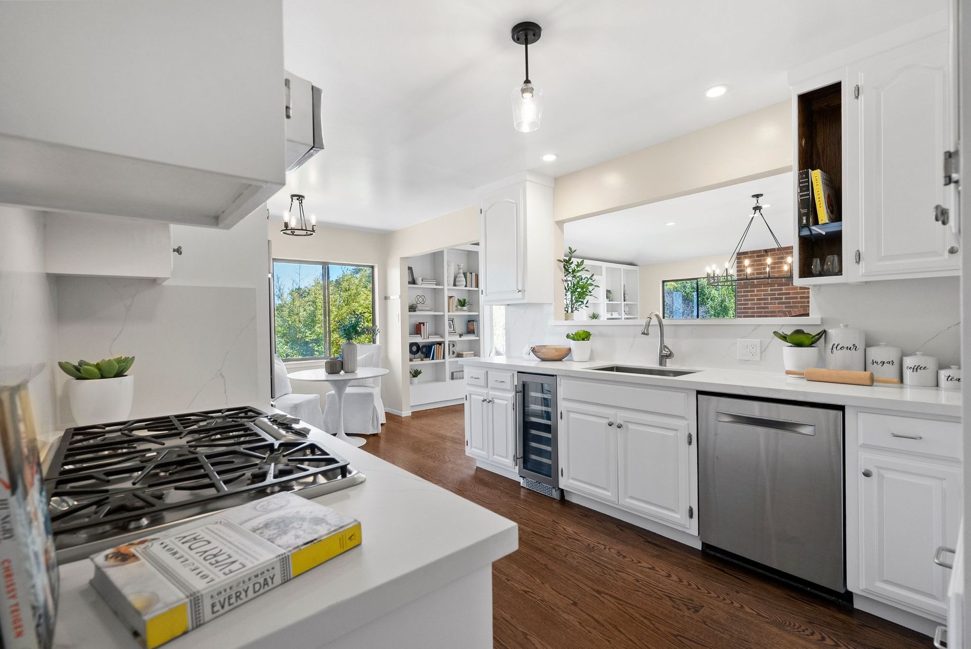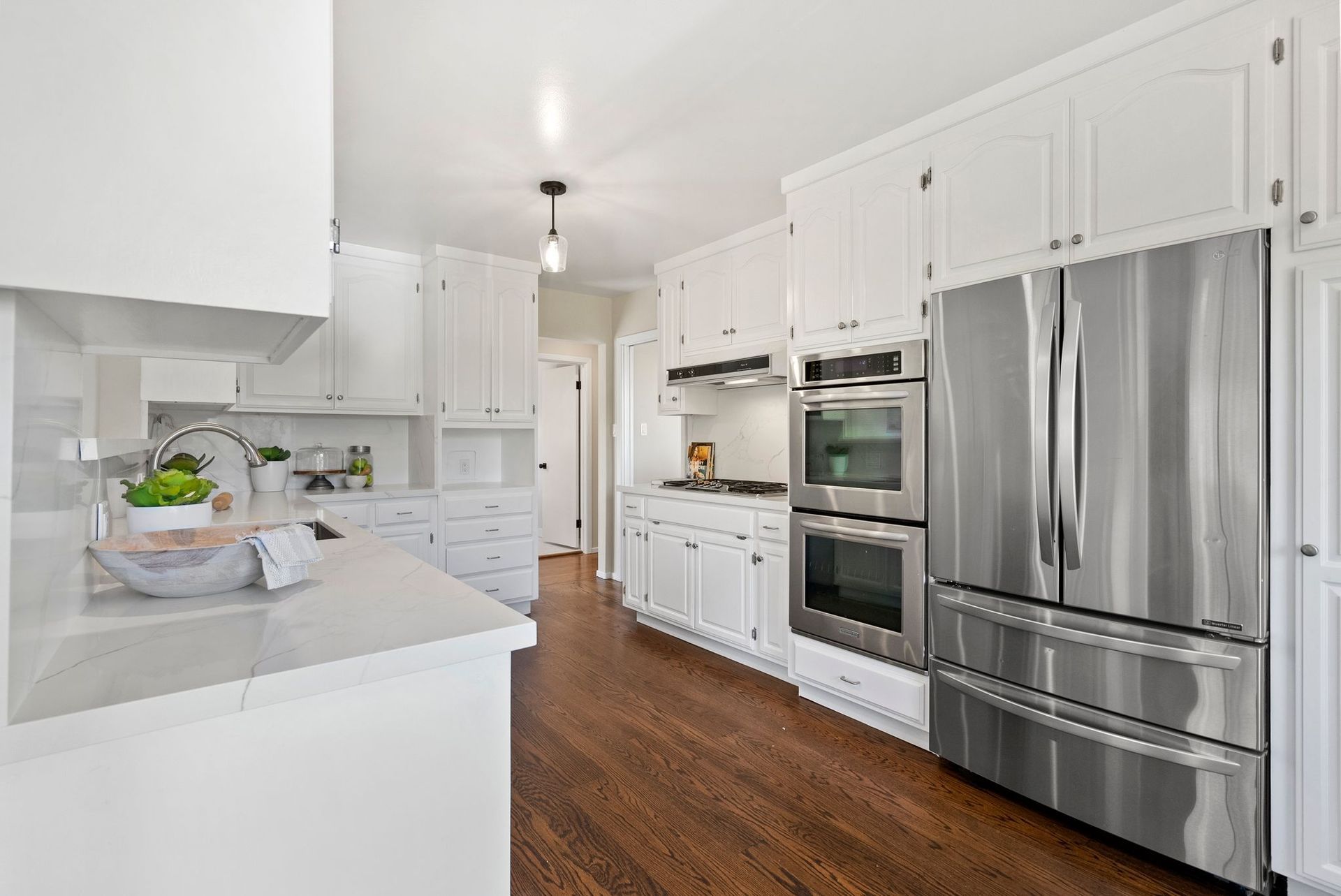 - Updated kitchen with quartz countertops, ample cabinetry, a wine fridge, and stainless steel appliances including a 5-burner gas cooktop and double ovens.