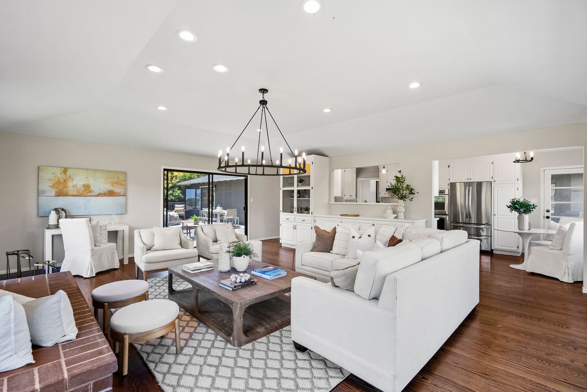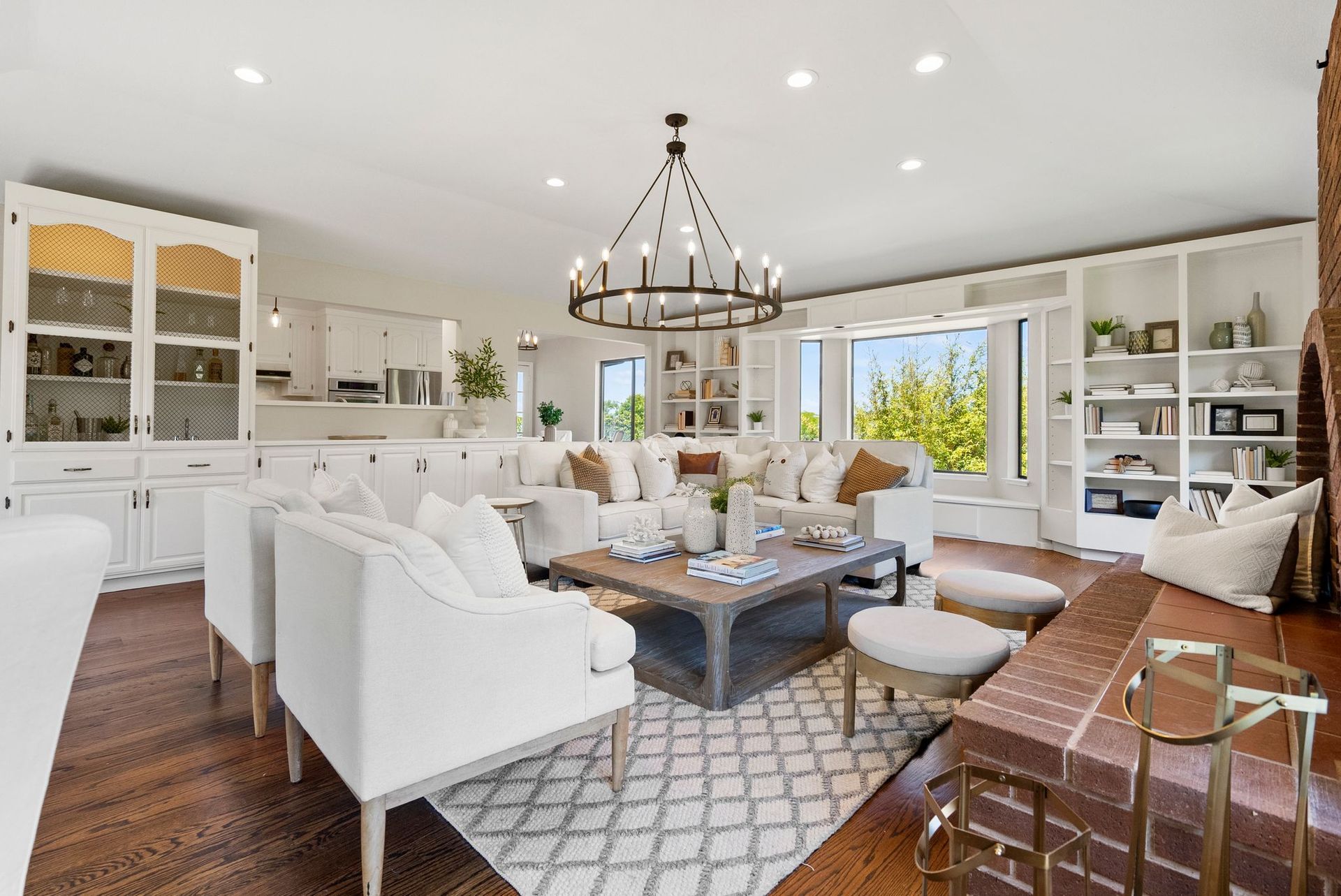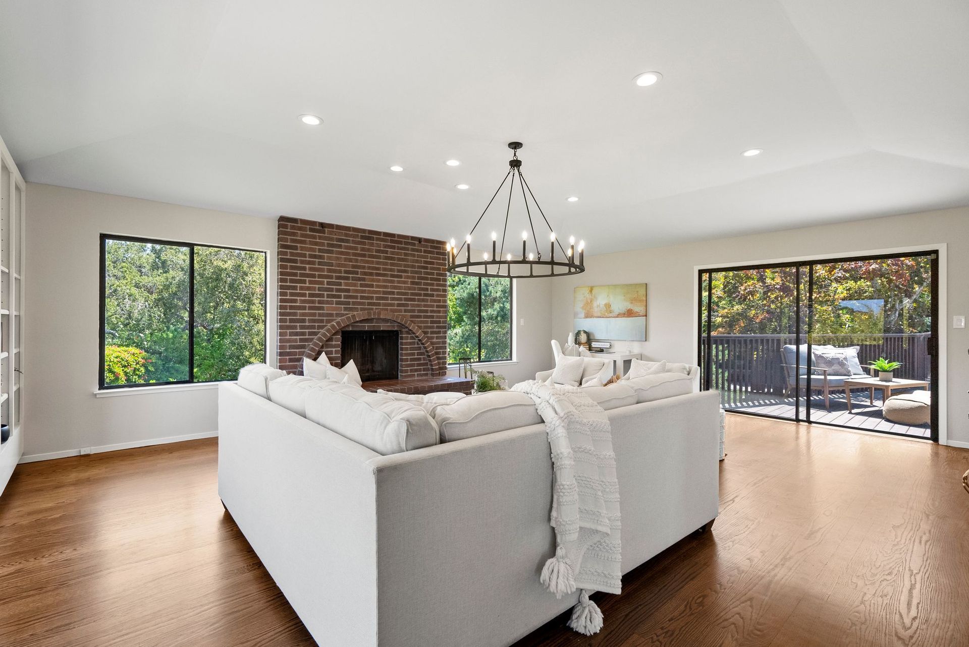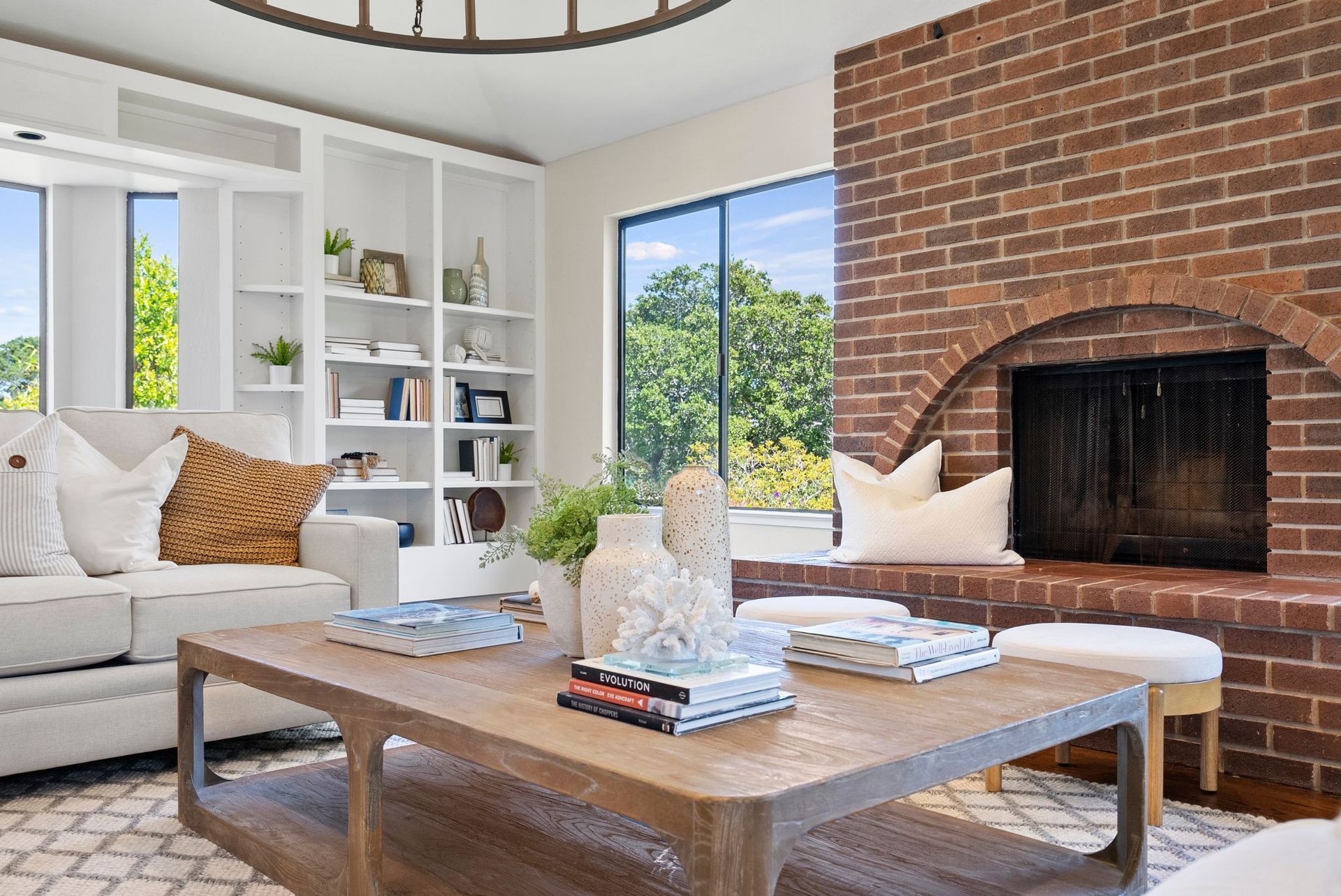 - Spacious informal living space with built-ins, a wet bar, brick fireplace, ample natural light, and access to a large deck.