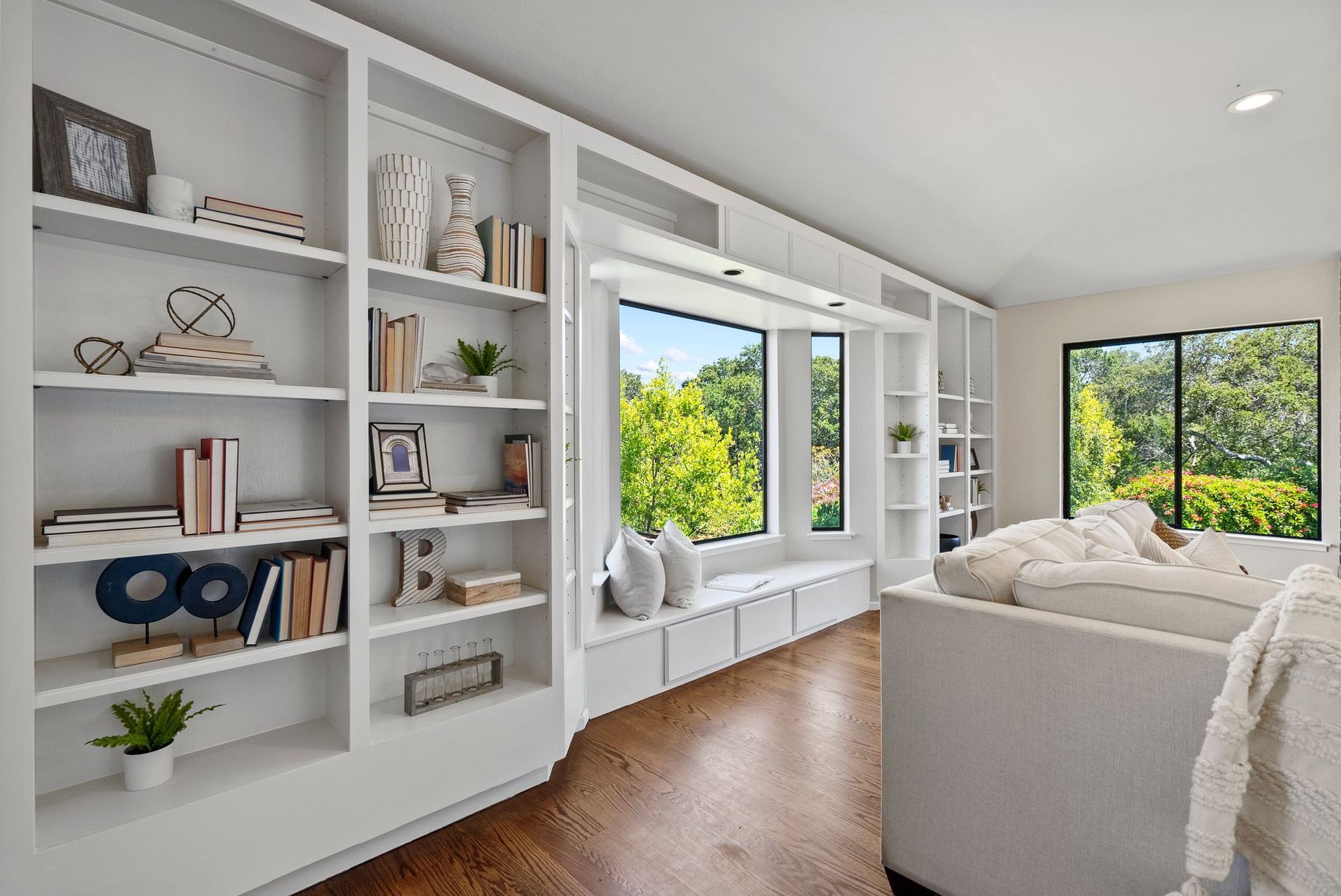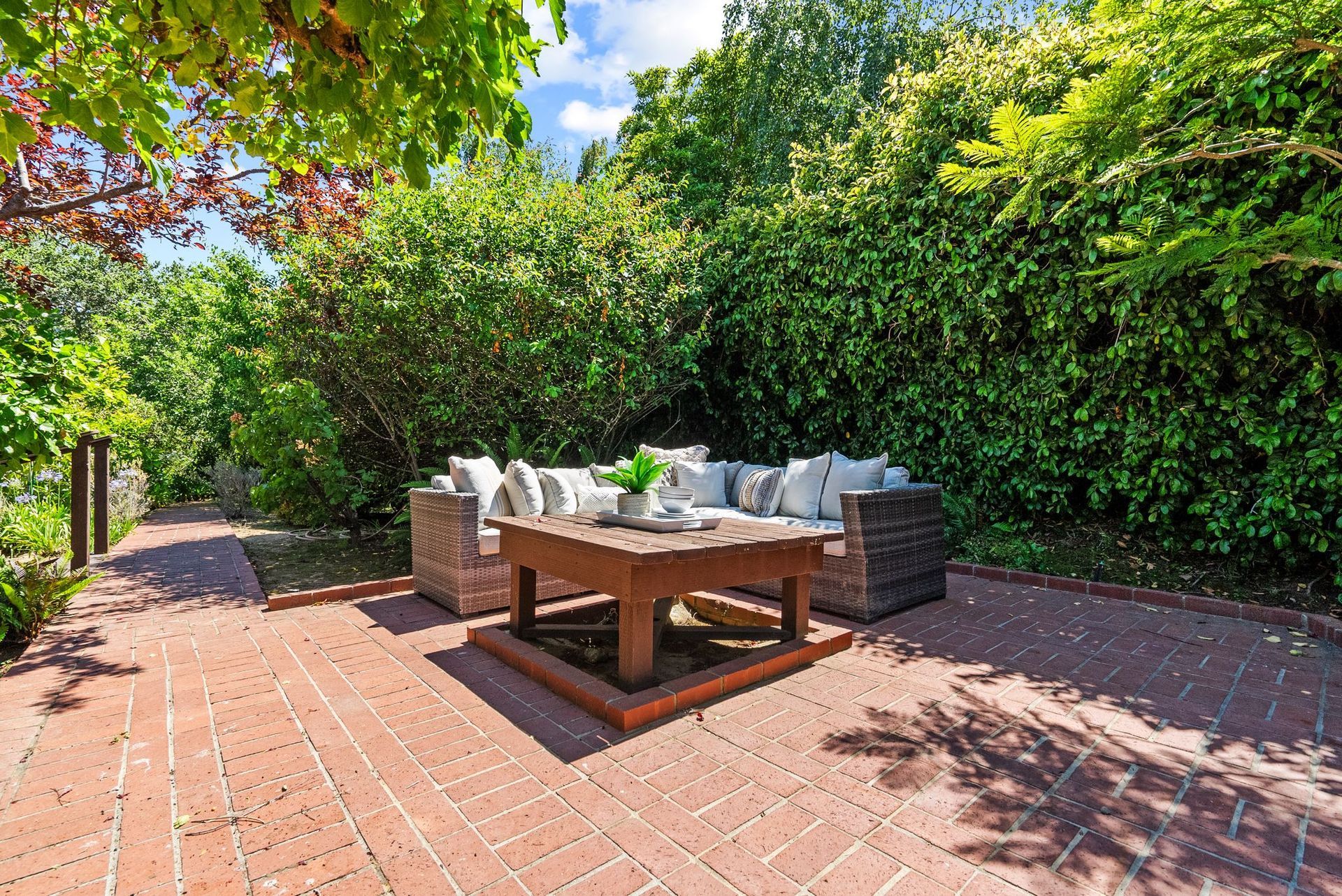 An informal living room off the kitchen incorporates plentiful built-in storage, a wet bar, a brick-lined fireplace, and windows on each wall that grant peeks of the home’s incredible outdoor spaces. Glass doors slide open to a spacious deck that beautifully frames the backyard oasis brimming with rambling vines, foliage, and mature fruit trees. Host gatherings of all sizes with a manicured lawn, a garden, and tiered patios that provide lovely vignettes for after-dinner conversations. Awe guests as they wander stone-lined pathing through masterful landscaping to take in its secluded nature.