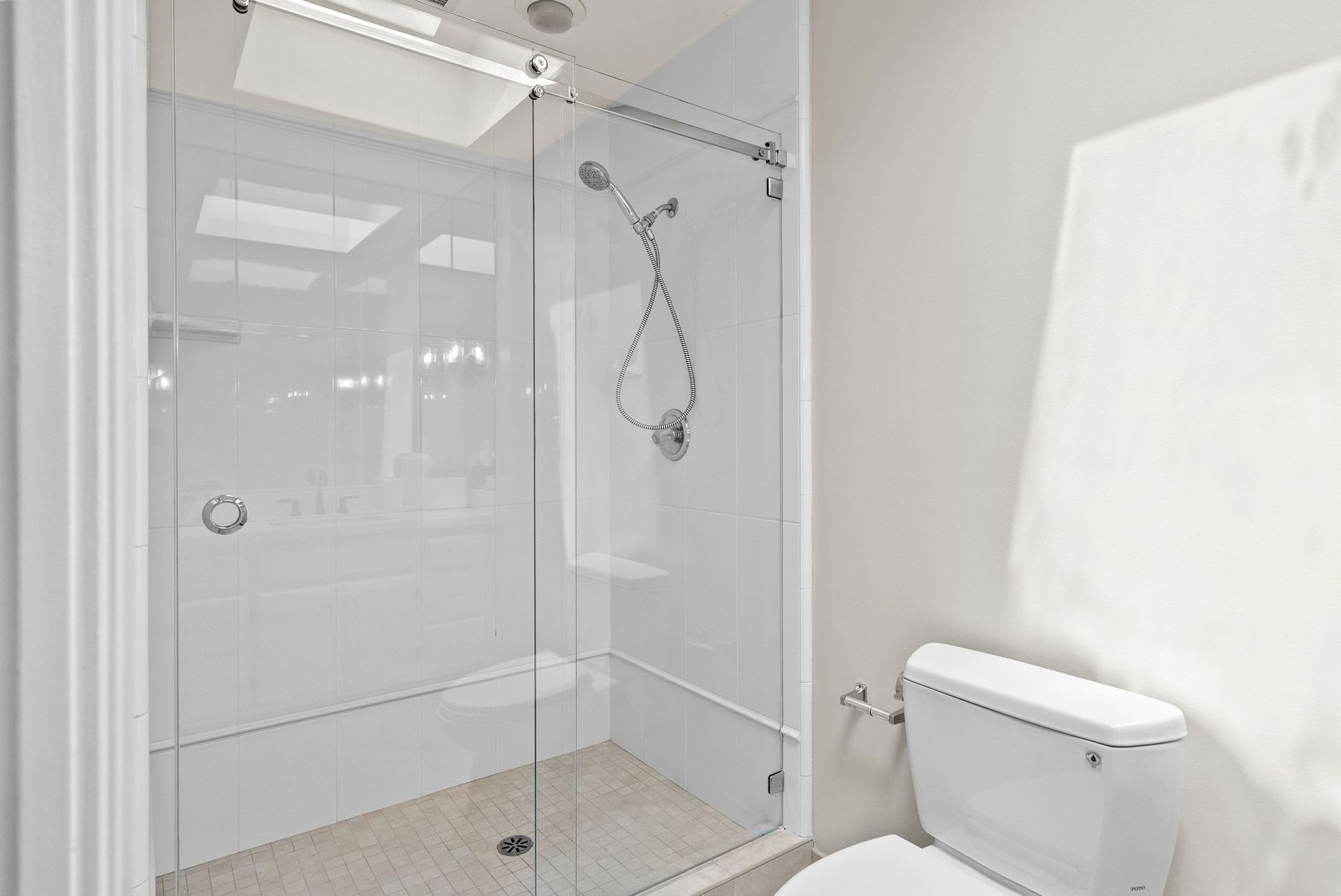 Collected together on the other side of this home are the private quarters. The blissful primary suite rests at the end of the hallway, with access to the back deck and expansive outdoor spaces. The primary suite boasts a wall of closets with mirrored bypass doors, reflecting light and adding to the size of this room. The ensuite features an updated quartz countertop and standing shower, with a skylight allowing light to stream in overhead. Two additional spacious bedrooms with leafy views of the landscaping, ample natural light, and large closets with built-in organizers share an updated four-piece hallway bathroom.