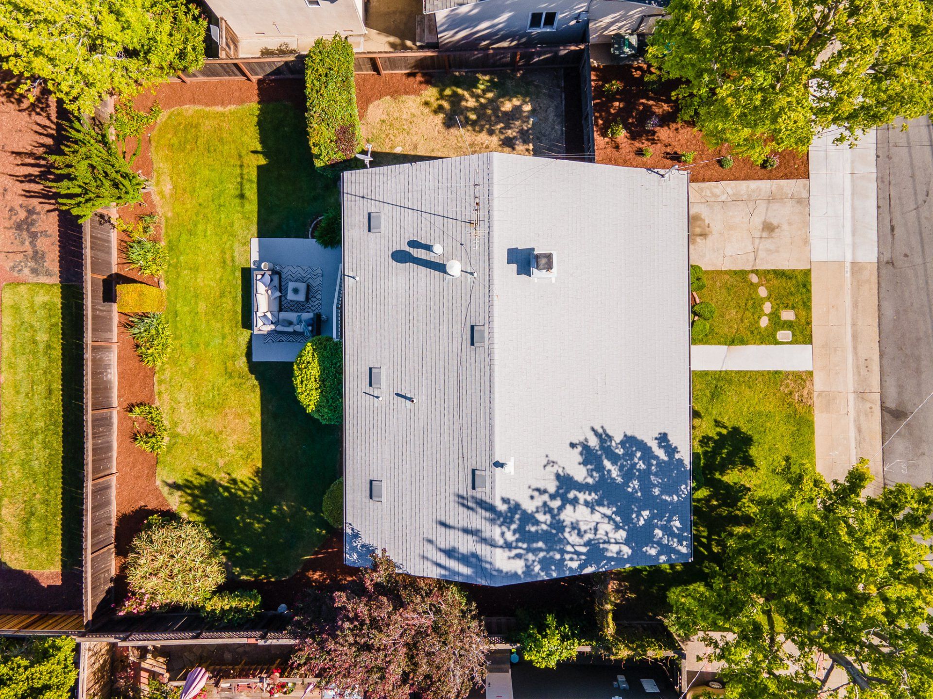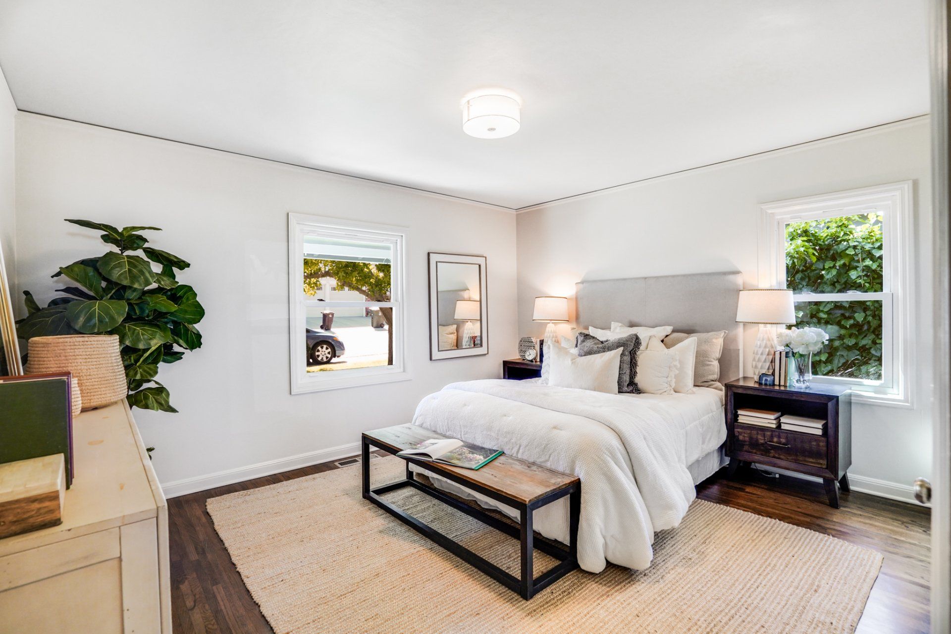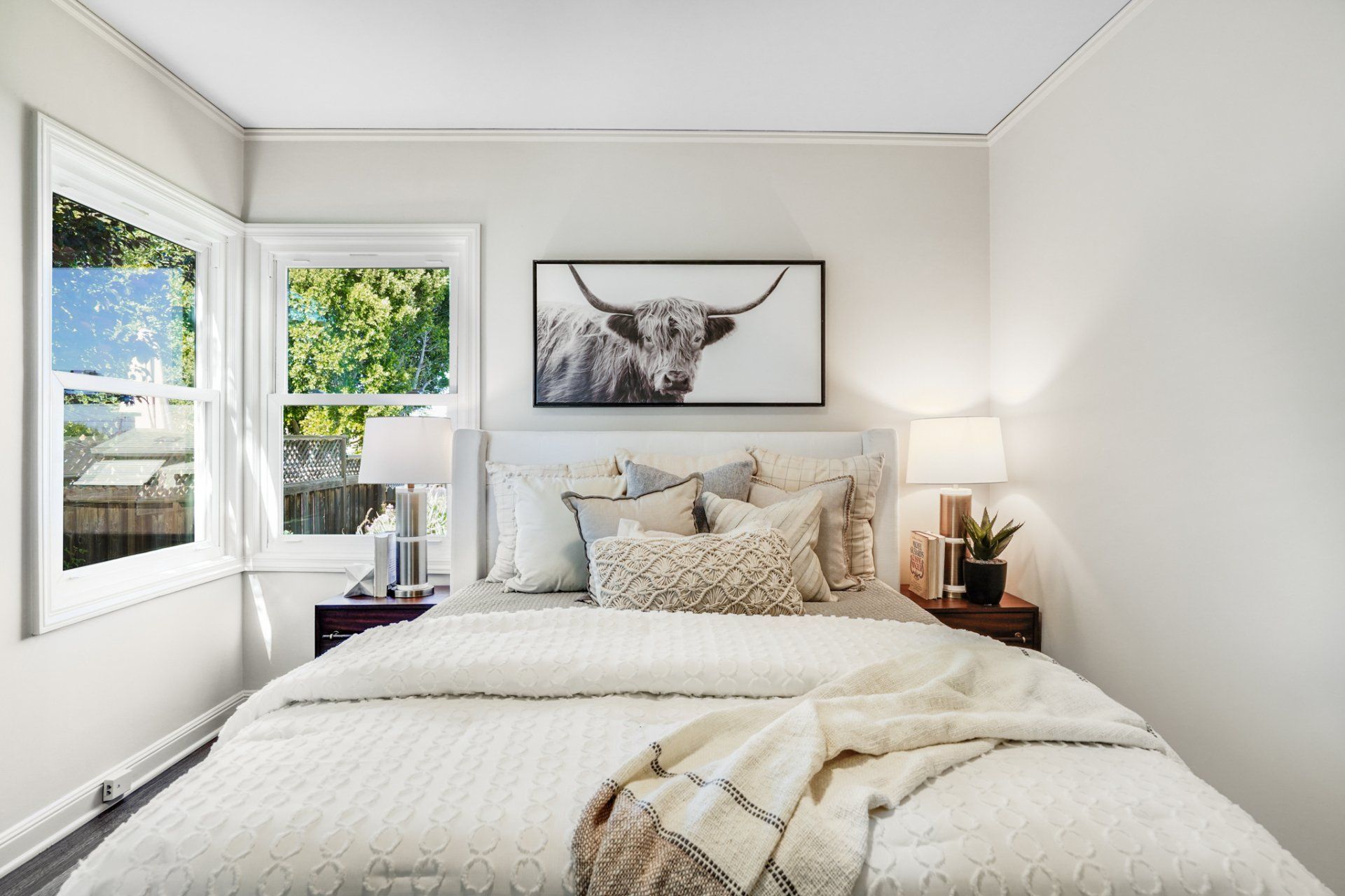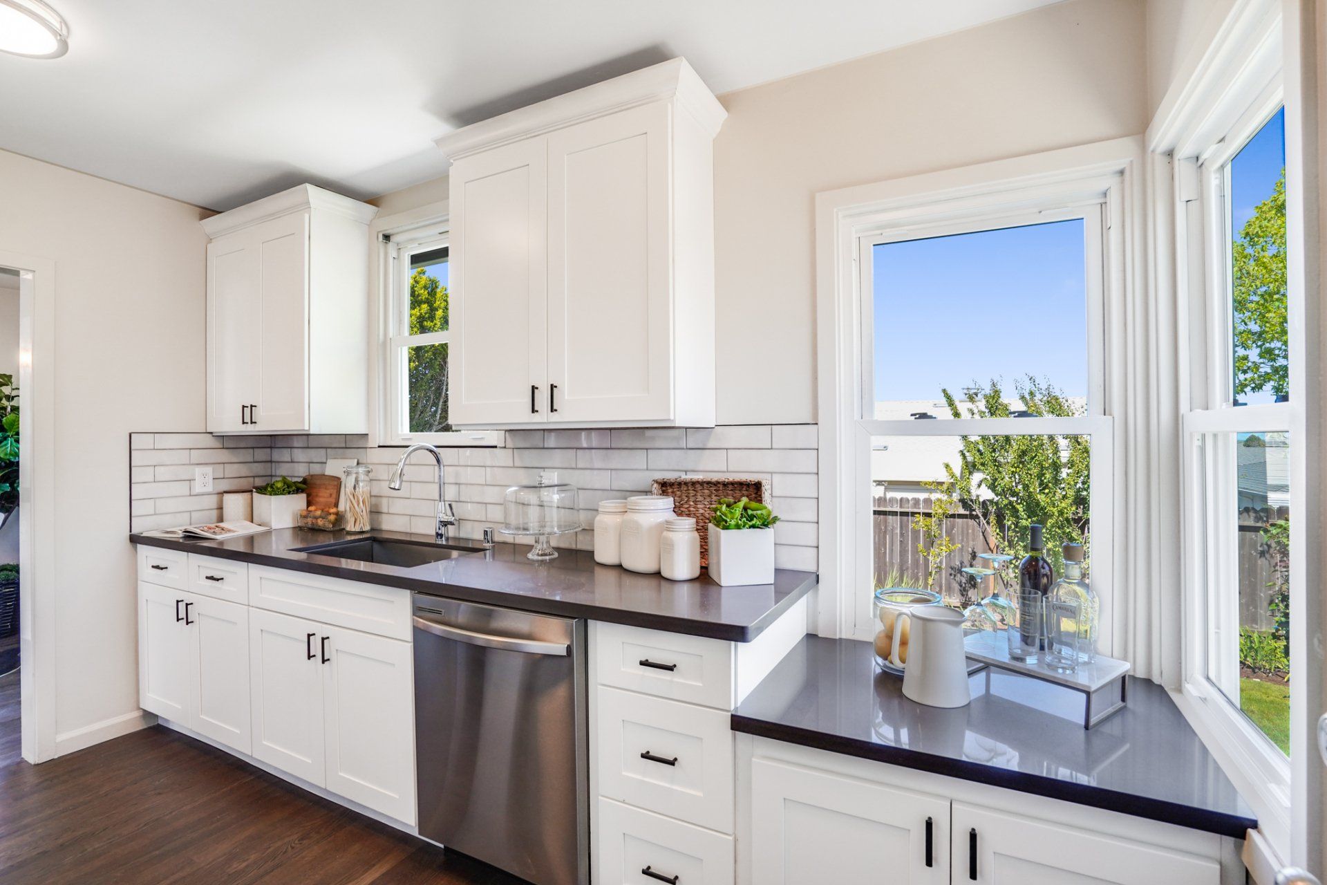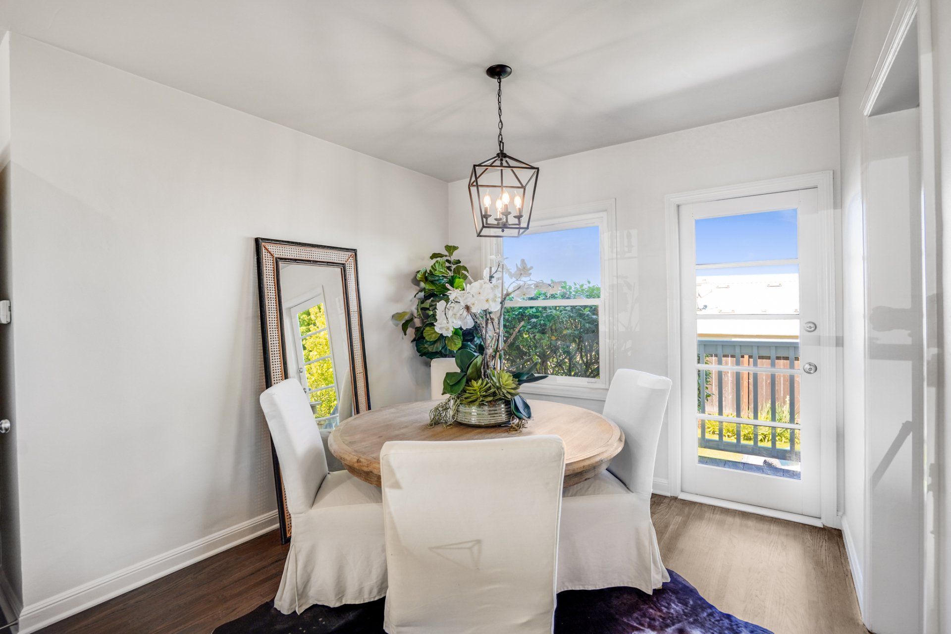 The newly updated kitchen has modern gray quartz countertops, stainless steel appliances, crisp white cabinets, and a pearl opal glazed subway tile backsplash. Natural light enters from a window over the sink, as well as the corner windows - a design feature you’ll find in other parts of the residence. These windows even have a peekaboo view of the downtown San Mateo and East Bay hills. From the kitchen, you have access to the garage with sink, laundry, and extra storage, as well as the outdoors.